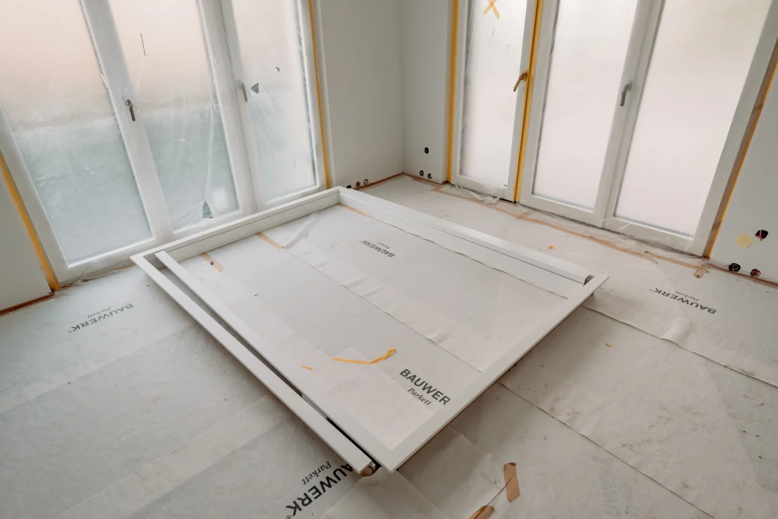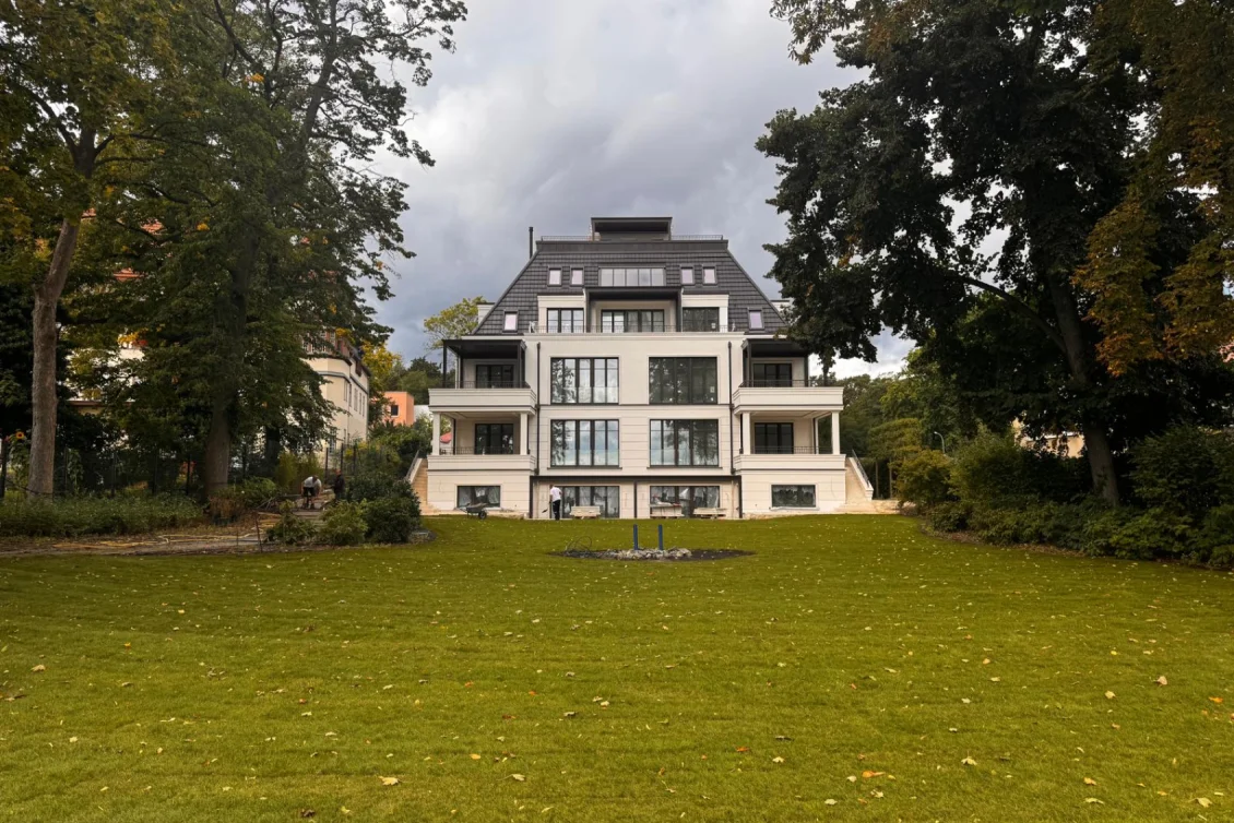 Der lang ersehnte Rollrasen wurde geliefert und im seeseitigen Gartenbereich verlegt. So entsteht erstmals ein durchgehend grünes Bild und der Außenraum gewinnt spürbar an Atmosphäre. Im Innenbereich werden parallel die Wohnungseingangstüren und maßgefertigten Sockelleisten montiert.