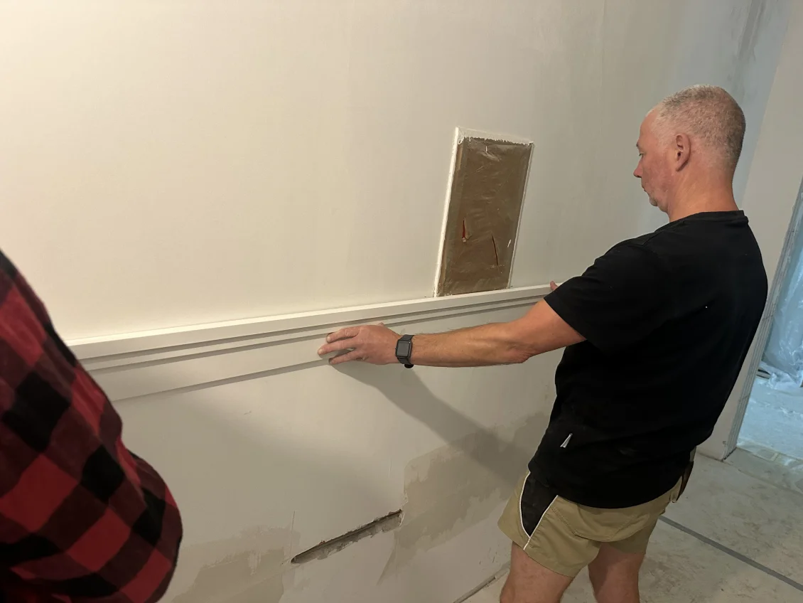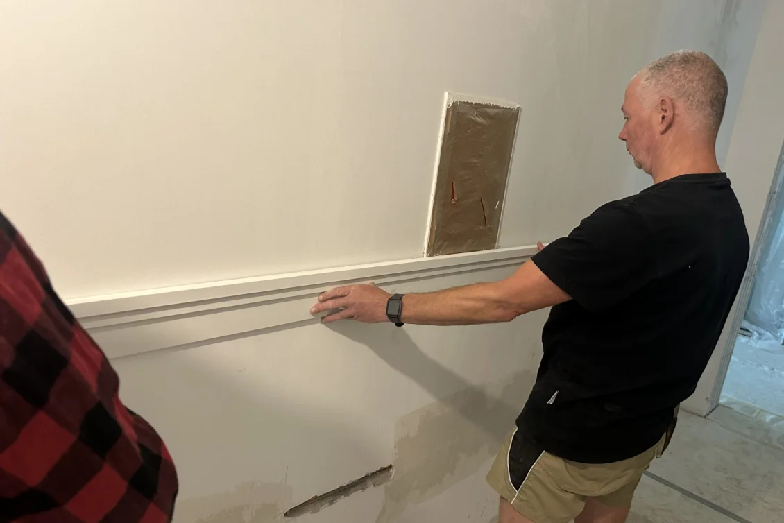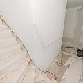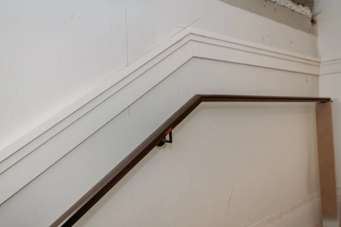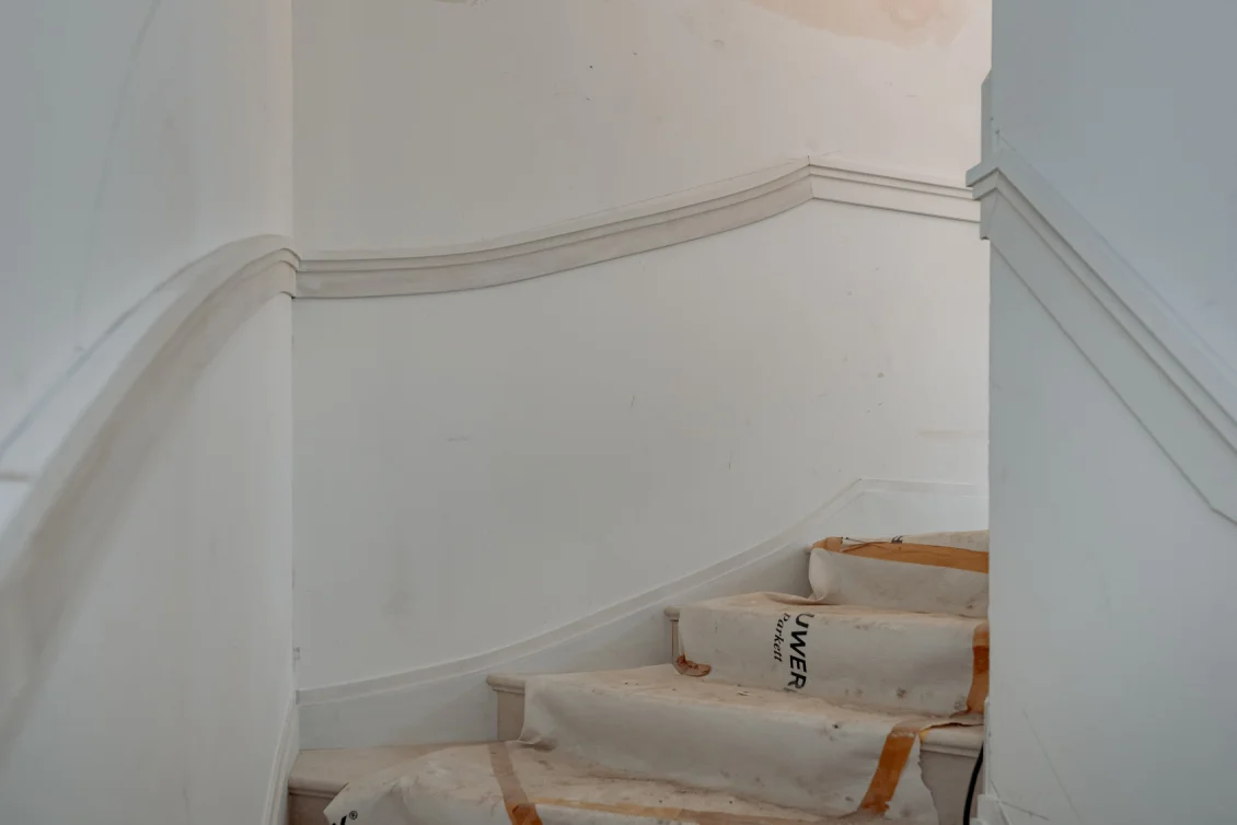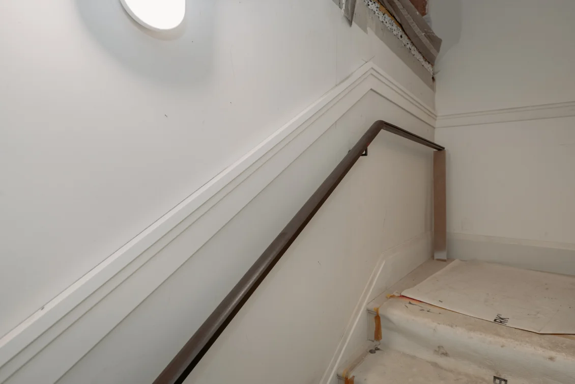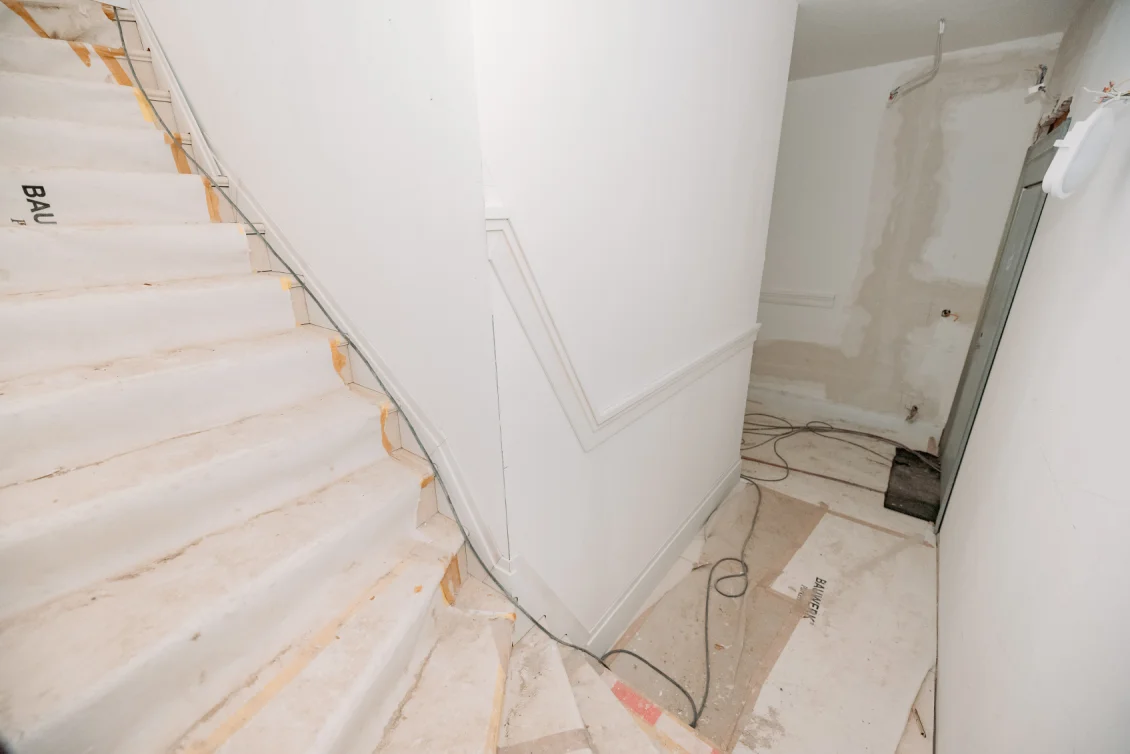 Im Treppenhaus wurden die ersten Treppenwangen und Verkleidungen montiert. Die Wangen werden dabei sorgfältig an die Rundungen der Natursteinstufen angepasst – eine handwerklich anspruchsvolle Arbeit, die das hochwertige Erscheinungsbild des Treppenhauses prägt.
