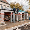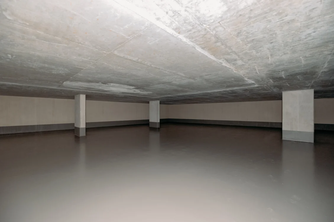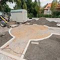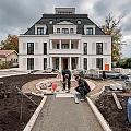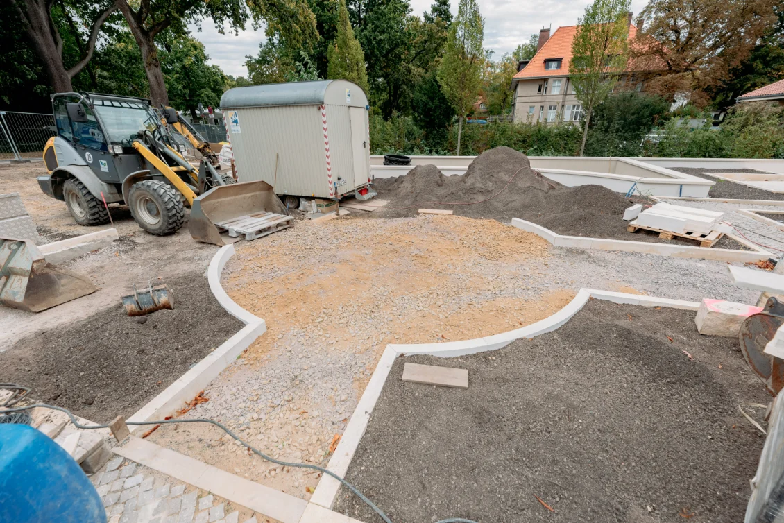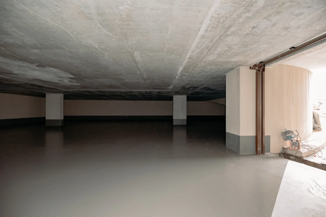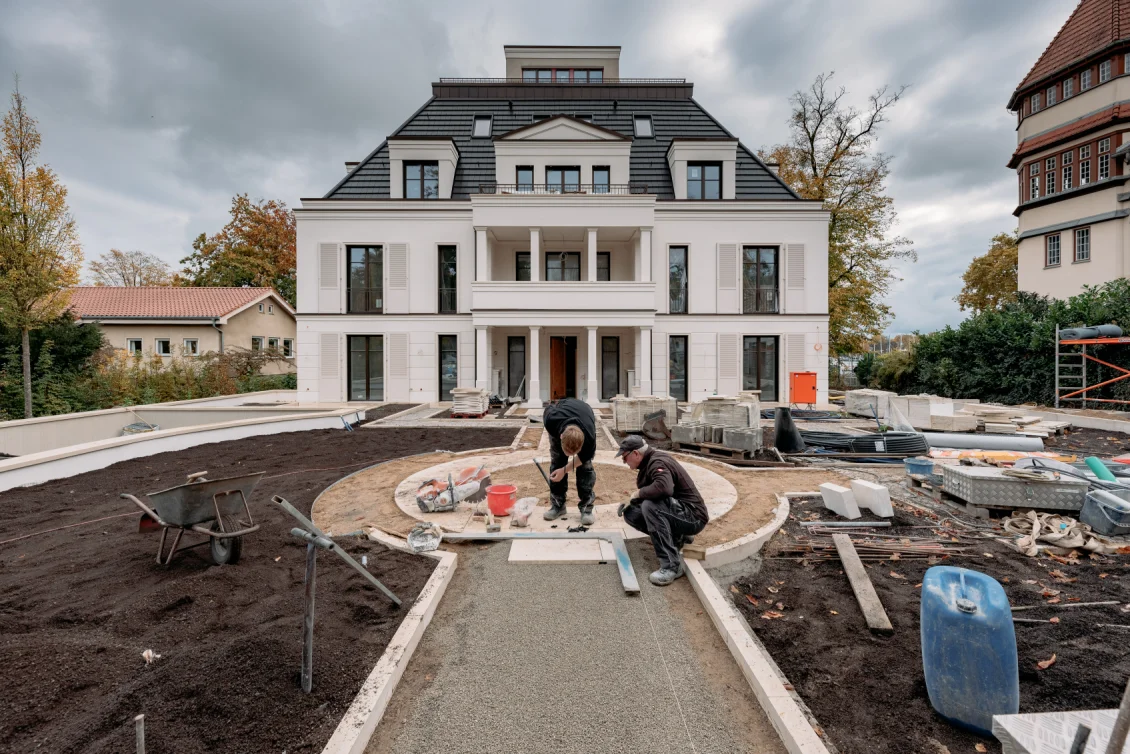 Die Tiefgarage erhielt ihre endgültige Beschichtung, die den Beton langlebig und widerstandsfähig macht. Lediglich die Markierungen für die einzelnen Parkplätze stehen noch aus, die künftig für klare Orientierung sorgen werden. Im Vorgarten wurden die maßgefertigten runden Natursteinplatten verlegt. Sie bilden eine harmonische Fläche, in deren Mitte der zukünftige Springbrunnen den gestalterischen Mittelpunkt markieren wird.