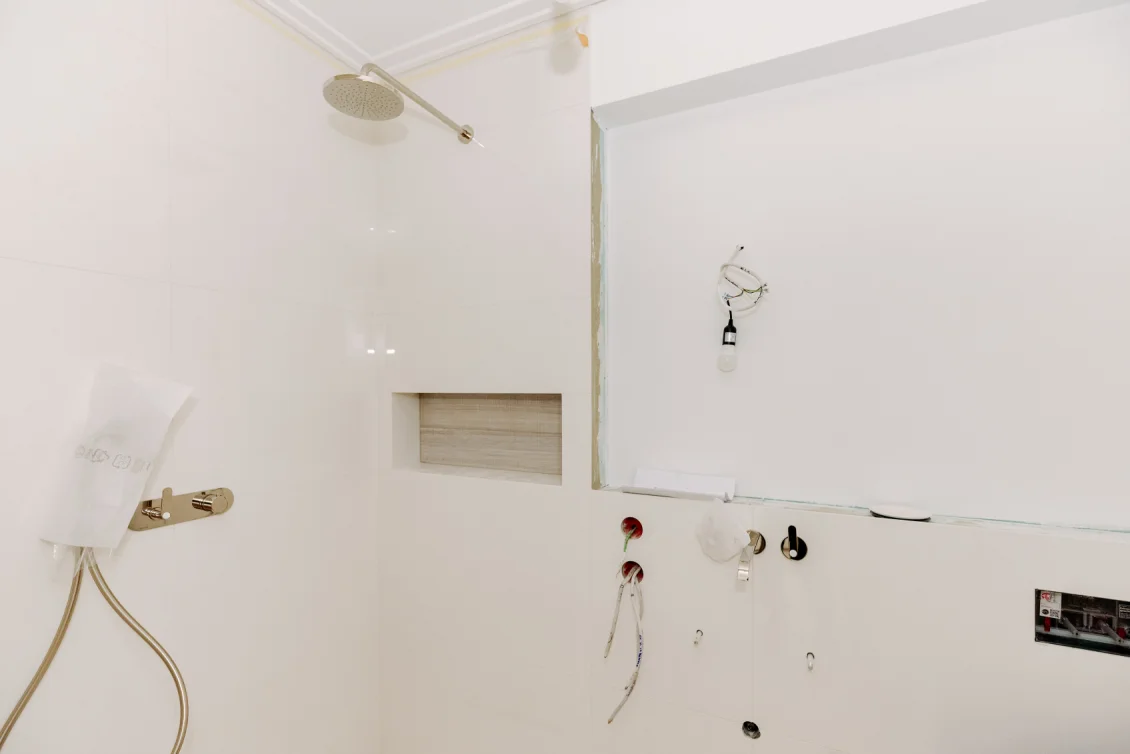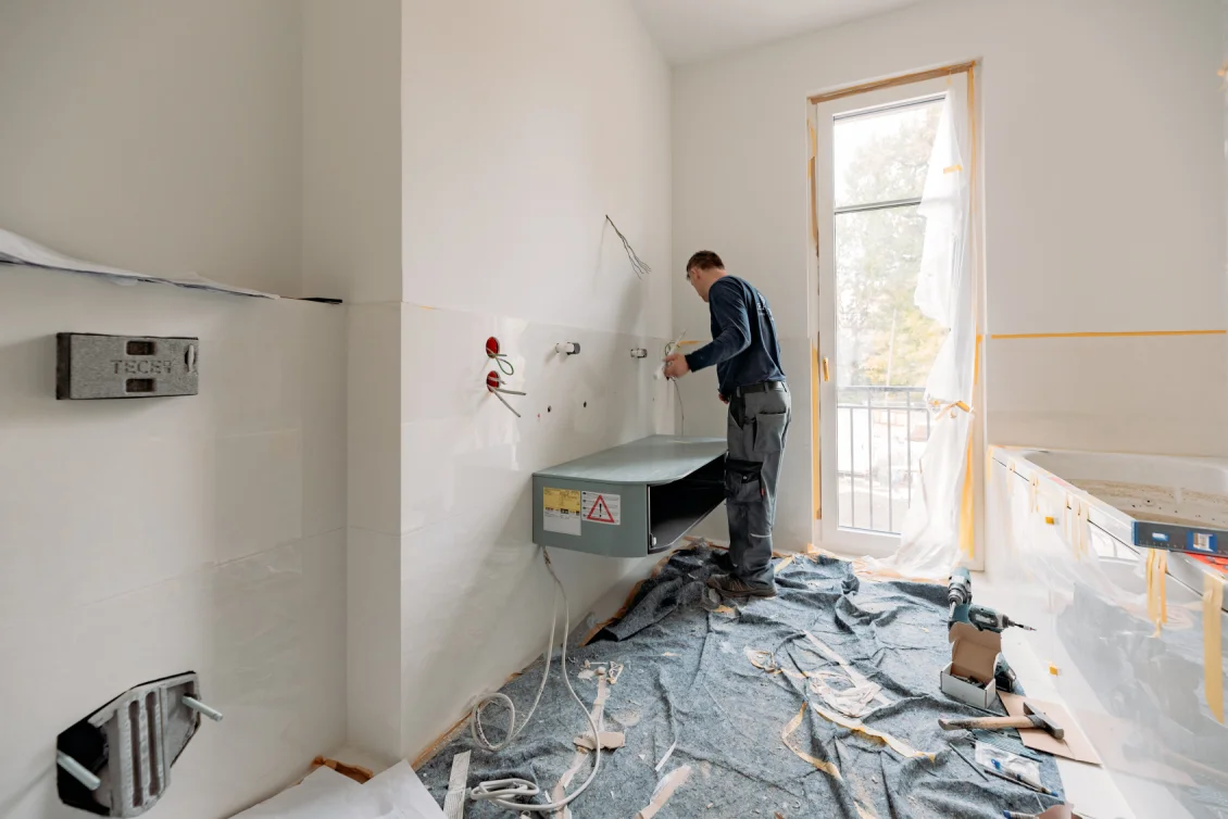 Die Montage weiterer Badobjekte und Armaturen wird fortgeführt. Gleichzeitig werden zusätzliche haustechnische Anlagen installiert und an die Hausanschlüsse angeschlossen. Damit schreitet die technische Fertigstellung des Hauses weiter voran und legt den Grundstein für die spätere Nutzung.