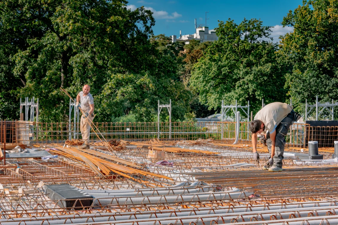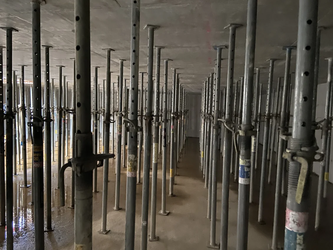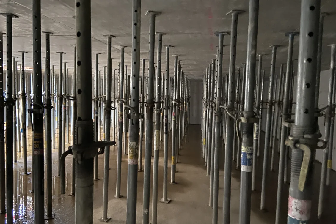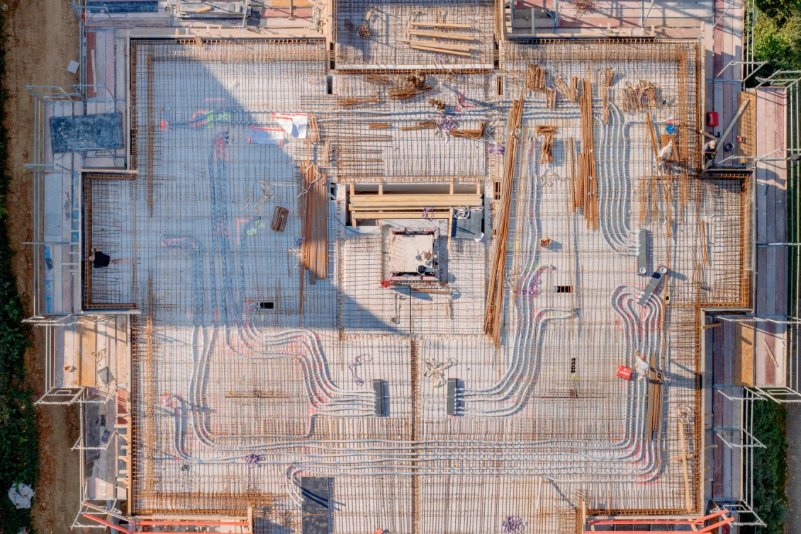 Auf beiden Seiten der Tiefgaragenrampe wird ein Schrammbord eingeschalt. Zusammen mit der Rampenheizung bleiben die Fahrzeuge später sicher auf Kurs. Ein Wald an Drehsteifen in der Tiefgarage gewährleistet die Überfahrt von schwerem Gerät, z.B. das Bohrfahrzeug für die Erdwärmeanlagen.