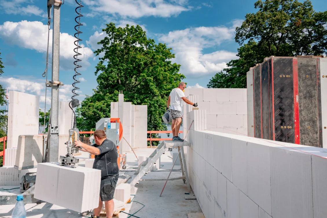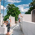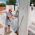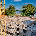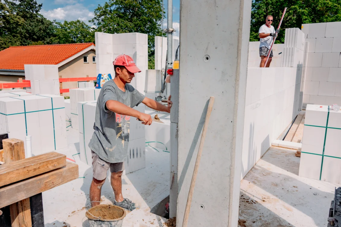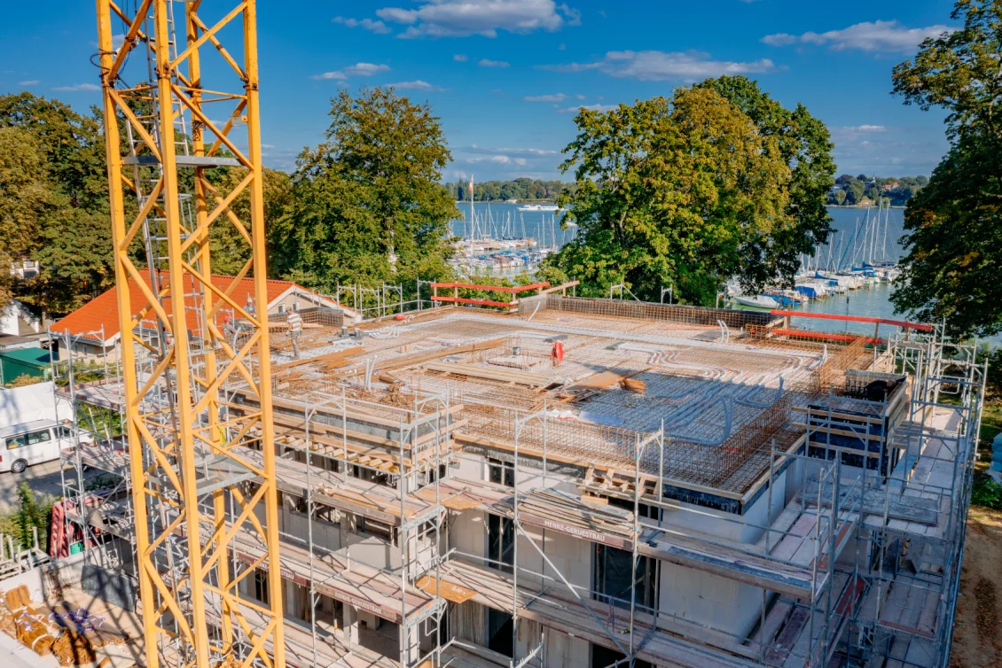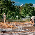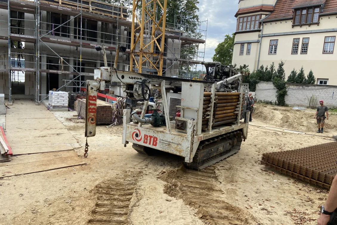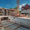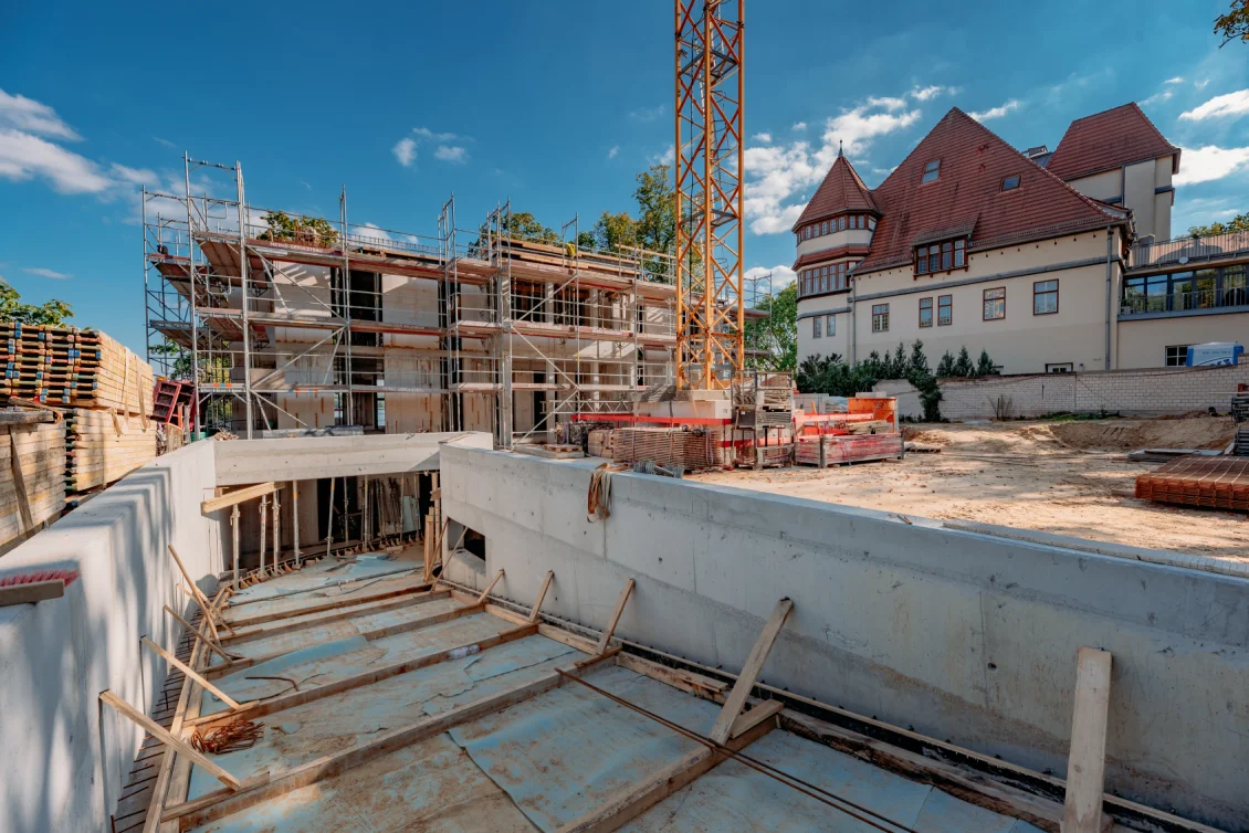 Auf beiden Seiten der Tiefgaragenrampe wird ein Schrammbord eingeschalt. Zusammen mit der Rampenheizung bleiben die Fahrzeuge später sicher auf Kurs. Ein Wald an Drehsteifen in der Tiefgarage gewährleistet die Überfahrt von schwerem Gerät, z.B. das Bohrfahrzeug für die Erdwärmeanlagen.