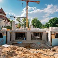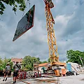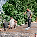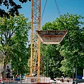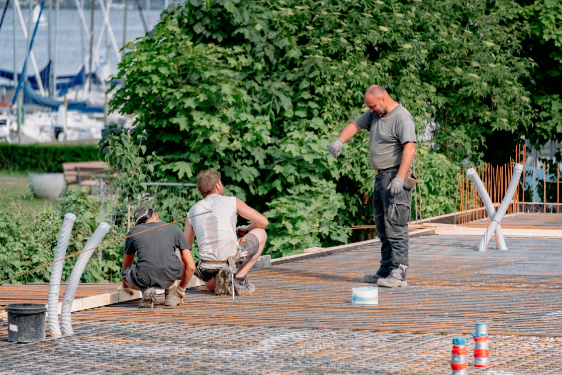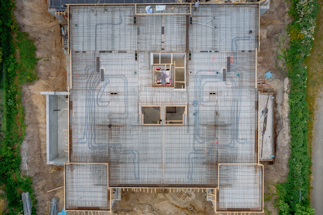 Auf die Beton-Halbfertigteile der Decke des Untergeschosses – sogenannte “Filigrandecken” – werden Lüftungsrohre und Abwasserleitungen montiert, die teilweise über bereits vorhandene Durchbrüche vorgestreckt wurden. Im Anschluss wird die obere Bewehrungslage verlegt, sodass der Aufbeton betoniert werden kann und die Decke ihre Stärke von 25 cm erhält.