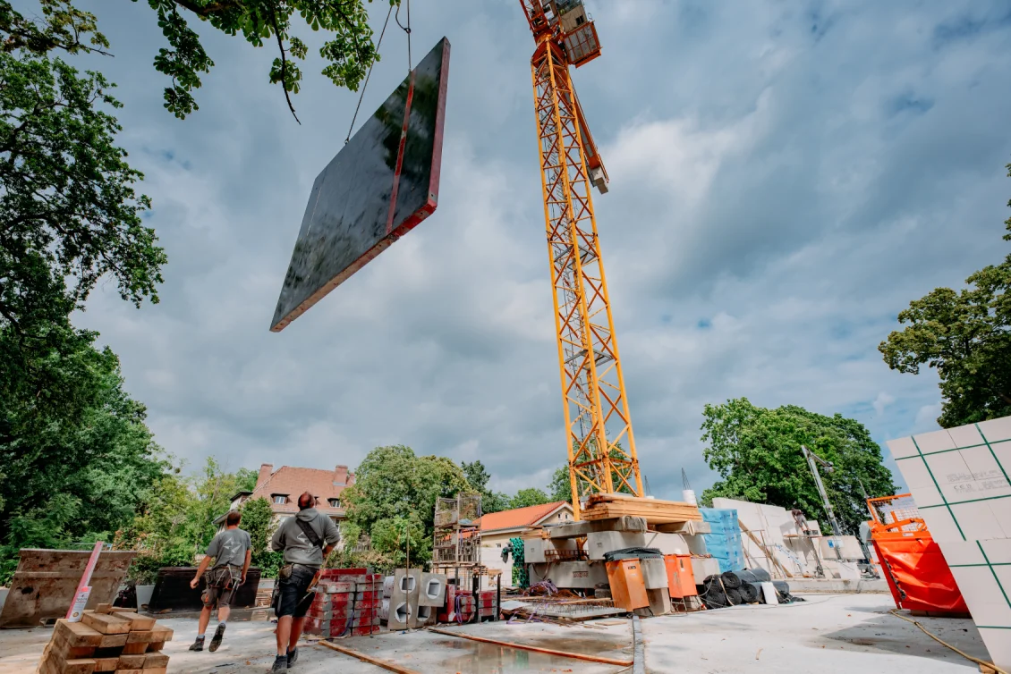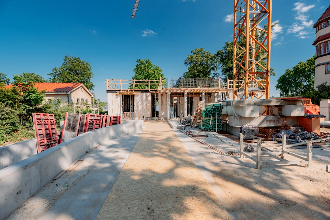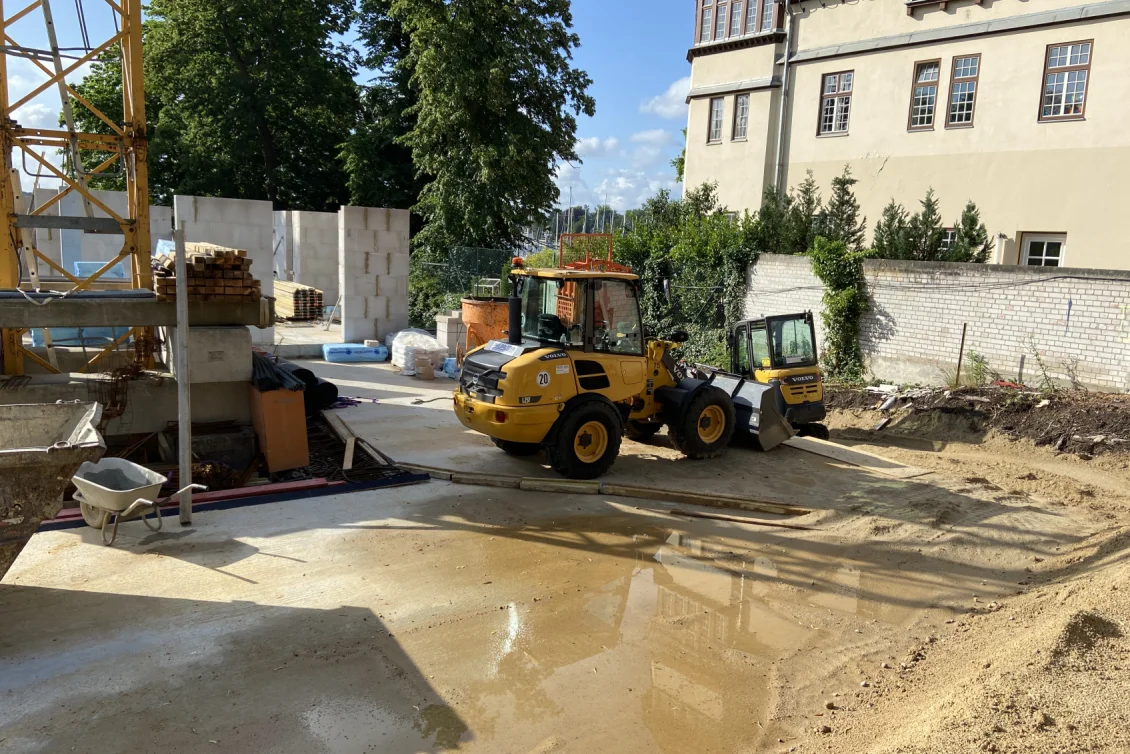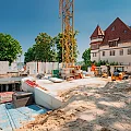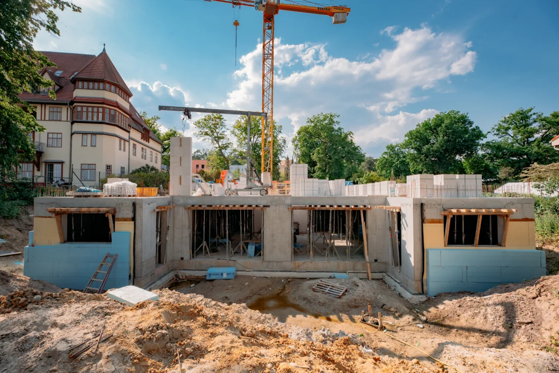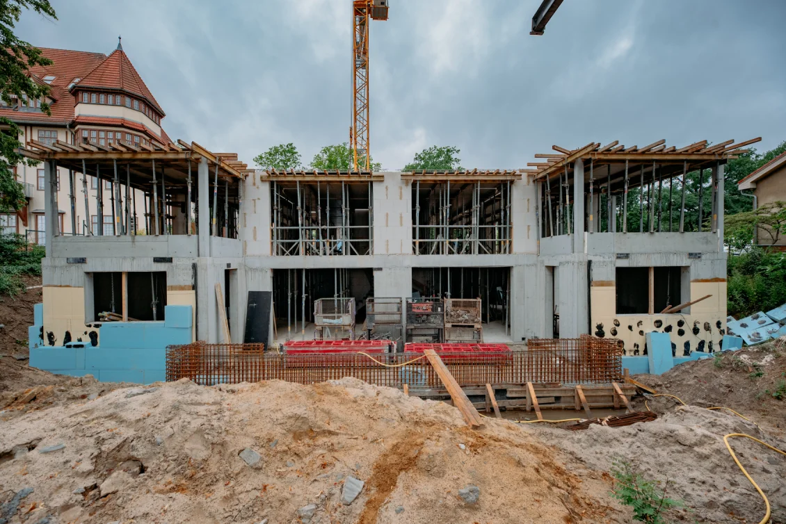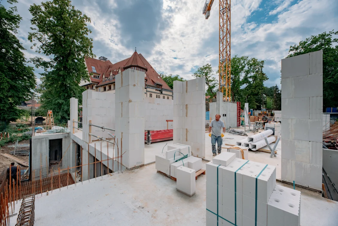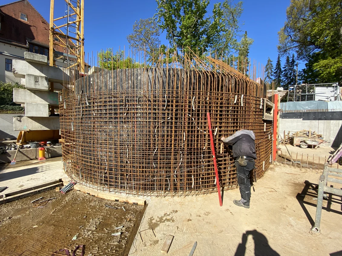 Der Rohbau der Untergeschosswände ist nahezu abgeschlossen. Aussparungen in den Wänden und Decken ermöglichen die zukünftige Leitungsführung. Für die Bodenplatten der terrassenähnlichen Lichthöfe steht die geknüpfte Bewehrung schon bereit, um später mittels Kran auf Position gebracht zu werden. Parallel dazu wird auch die Rampenwand betoniert.