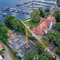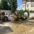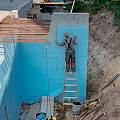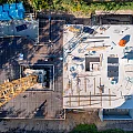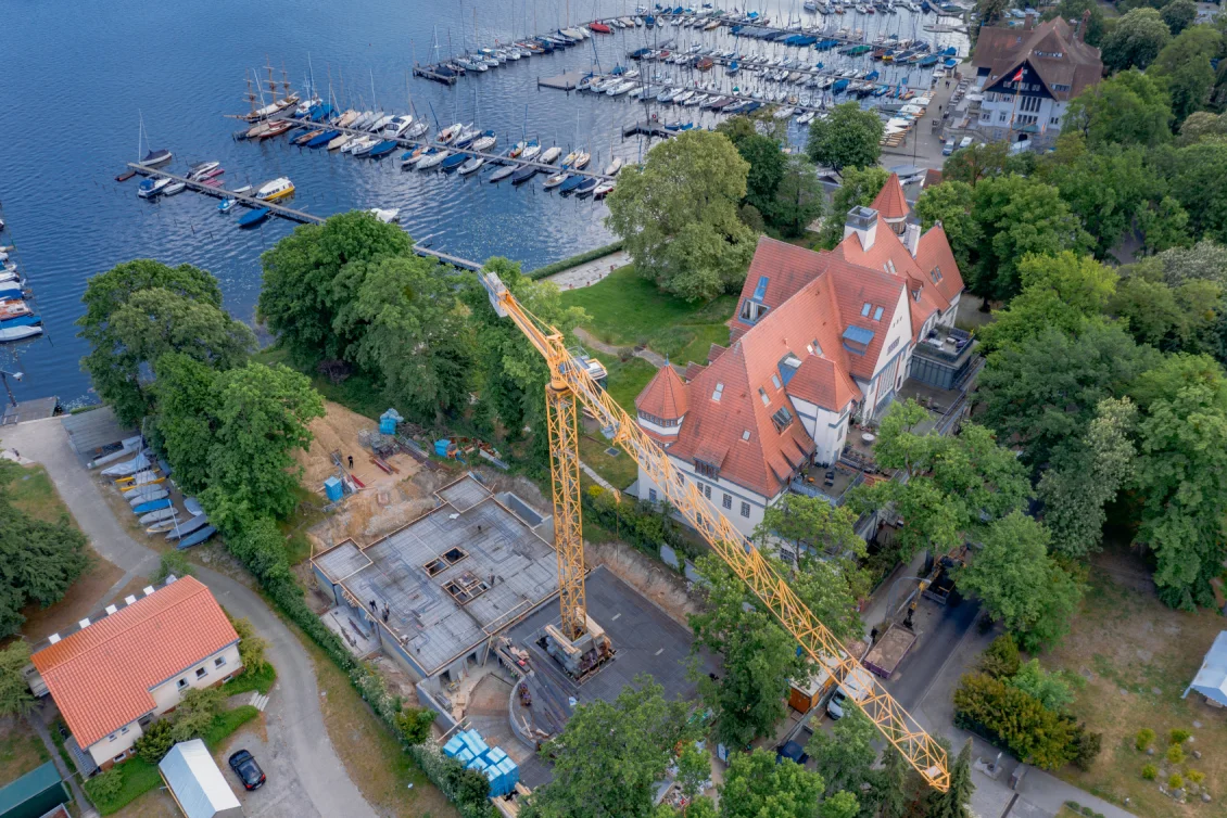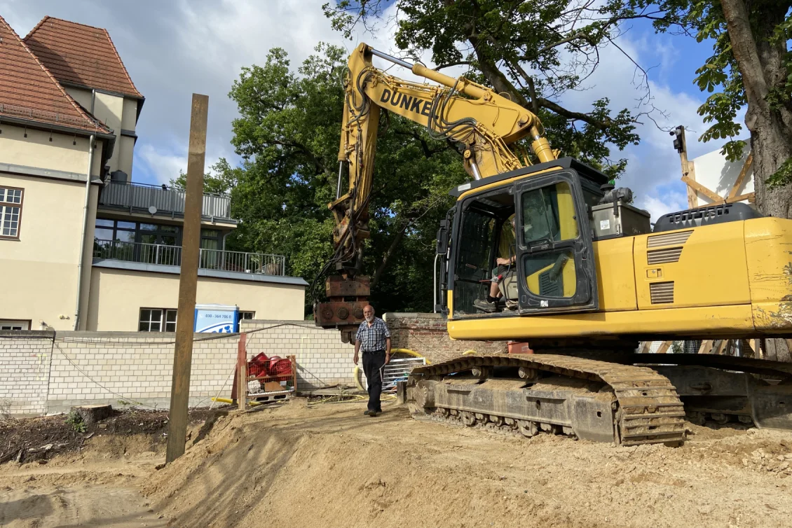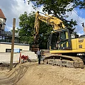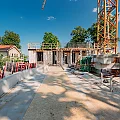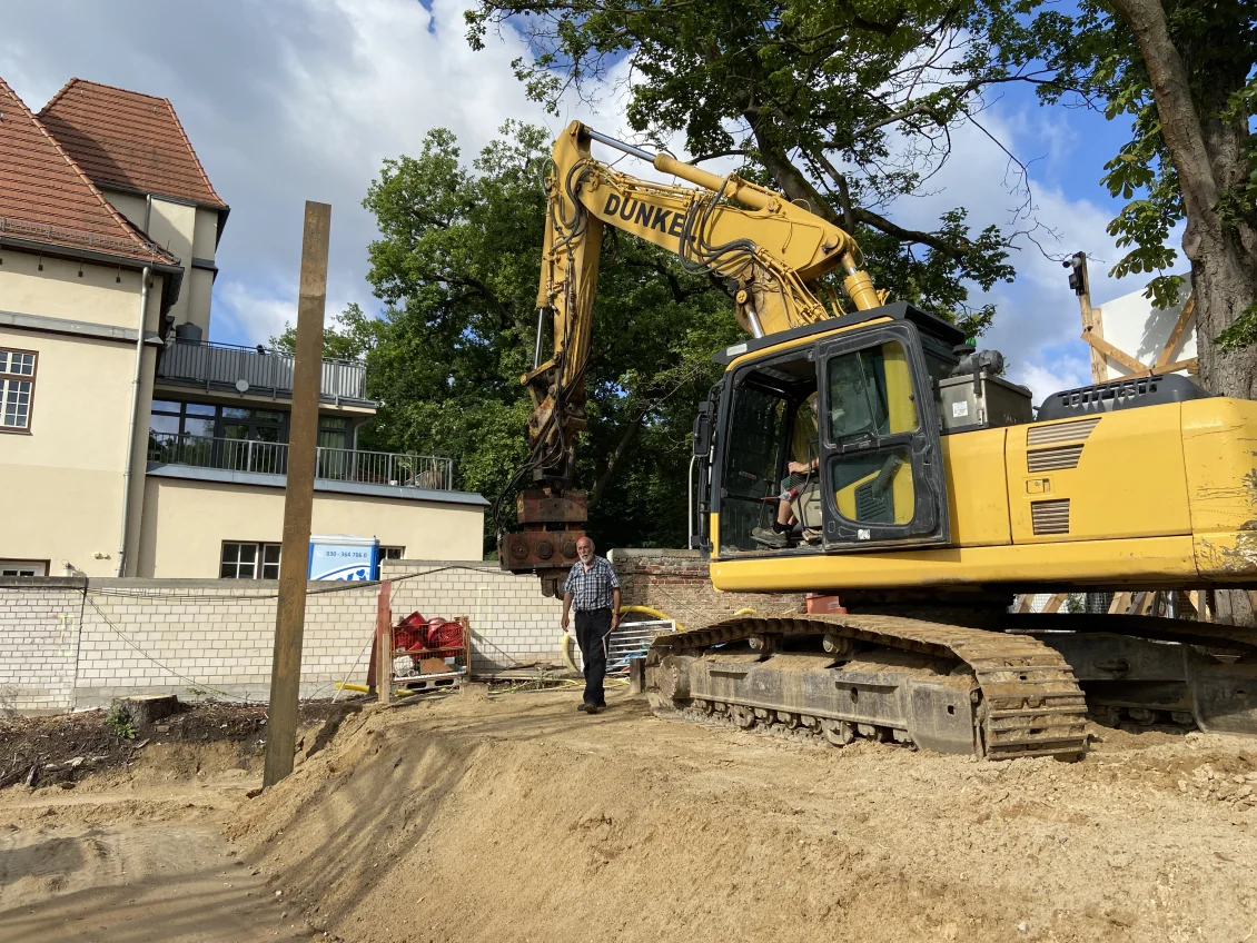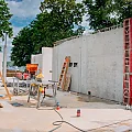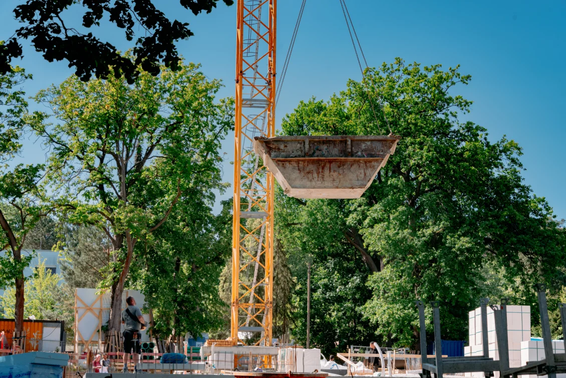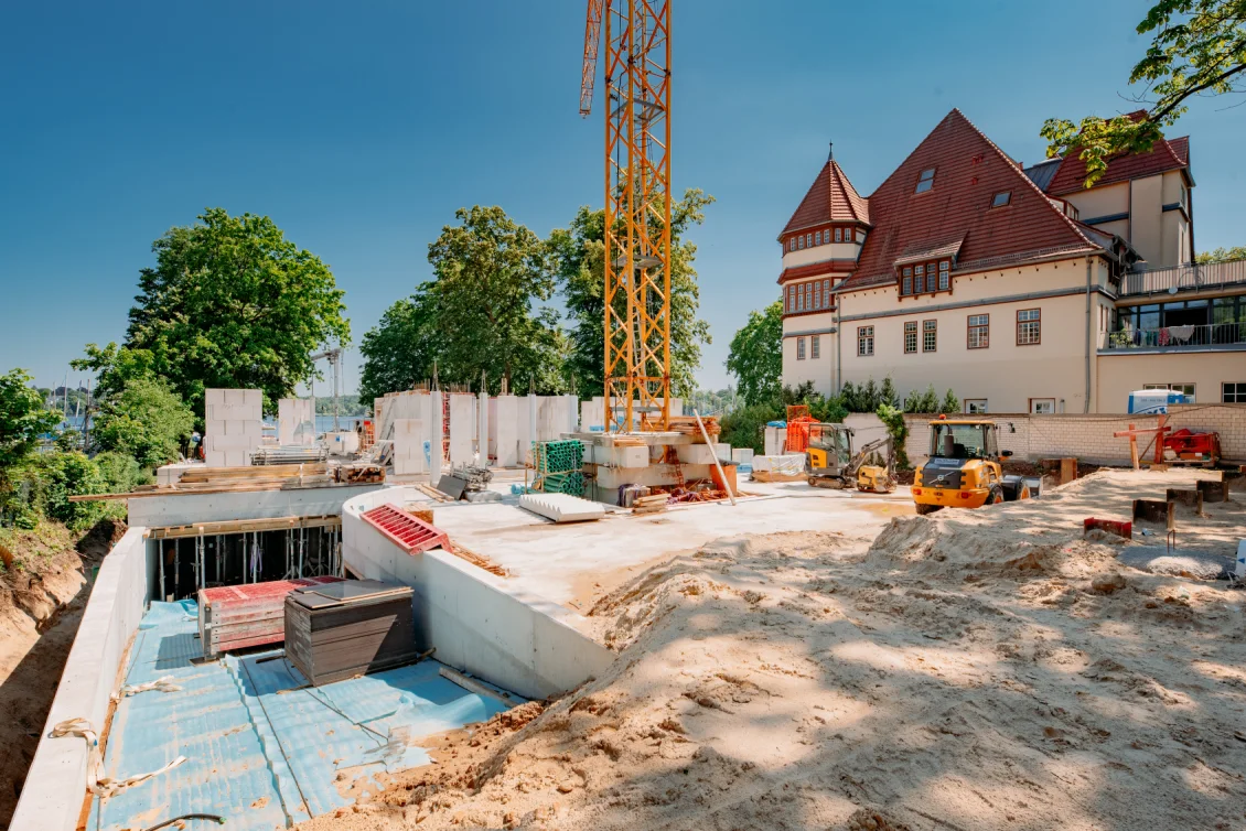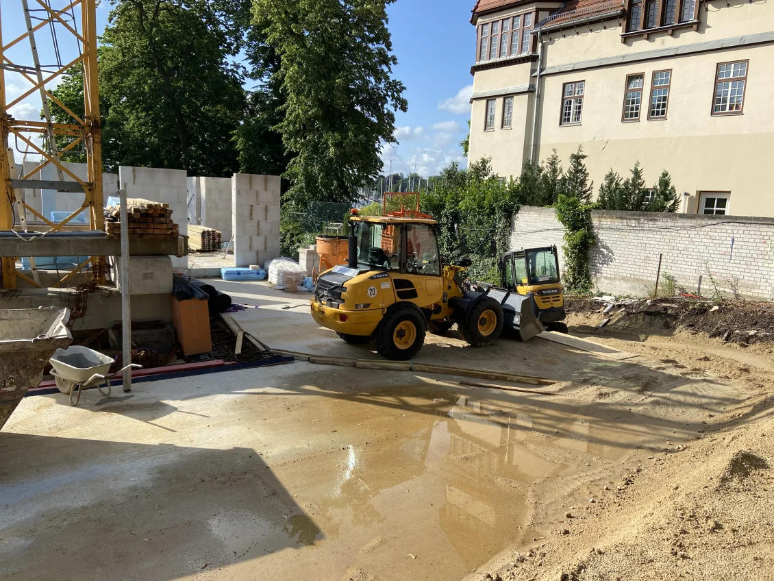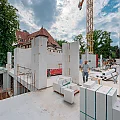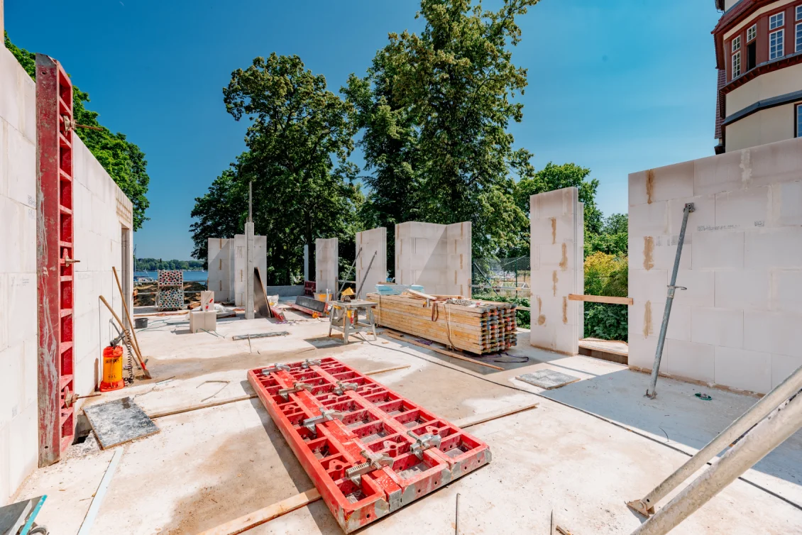 Der Rohbau der Untergeschosswände ist nahezu abgeschlossen. Aussparungen in den Wänden und Decken ermöglichen die zukünftige Leitungsführung. Für die Bodenplatten der terrassenähnlichen Lichthöfe steht die geknüpfte Bewehrung schon bereit, um später mittels Kran auf Position gebracht zu werden. Parallel dazu wird auch die Rampenwand betoniert.