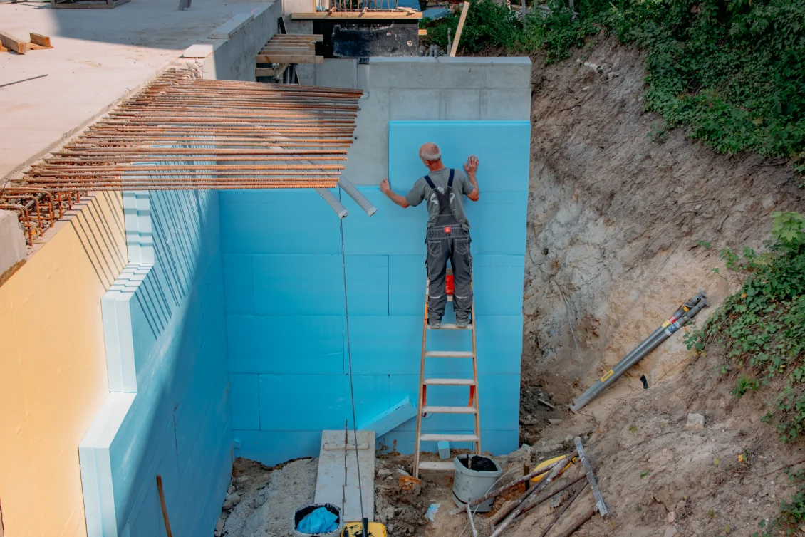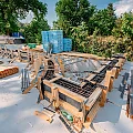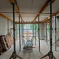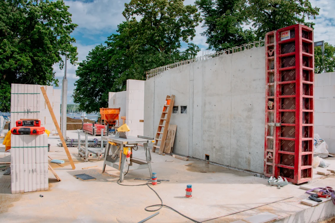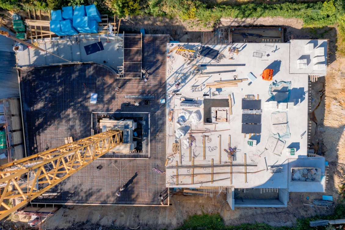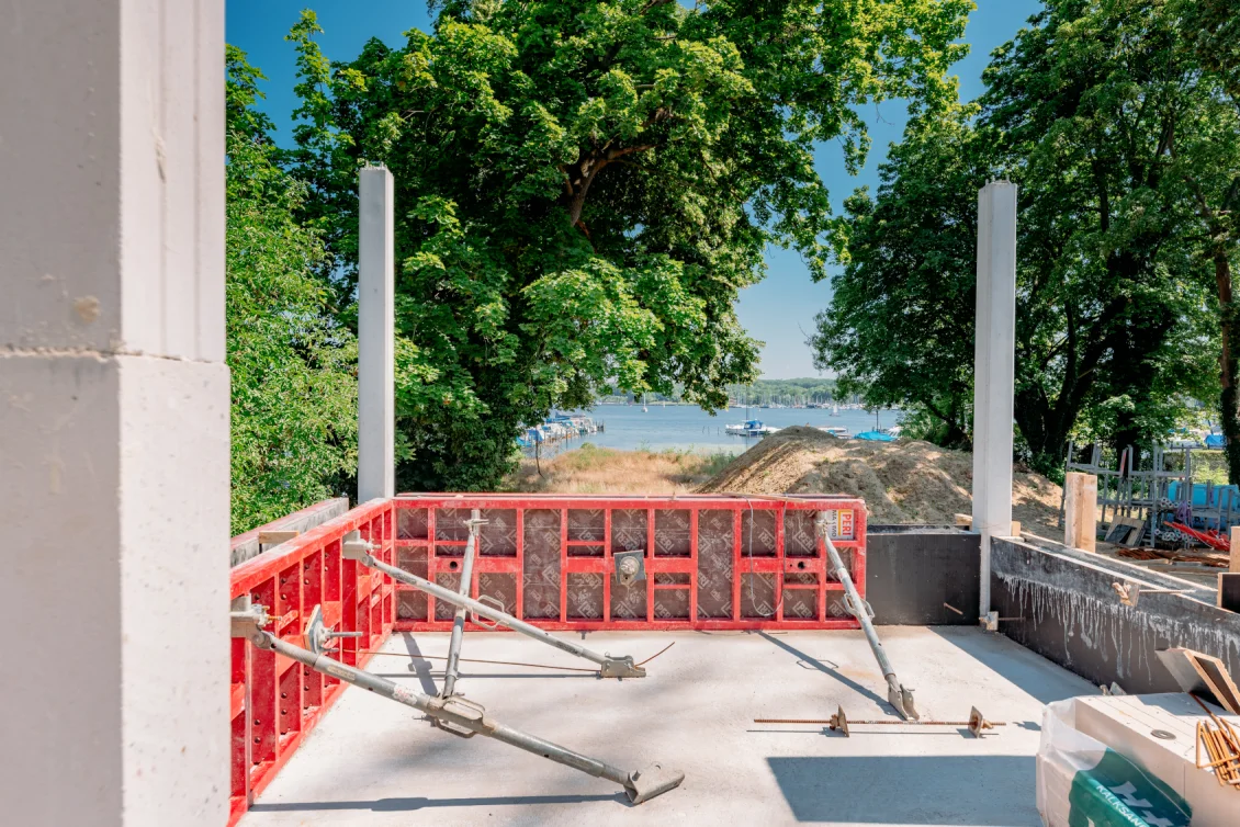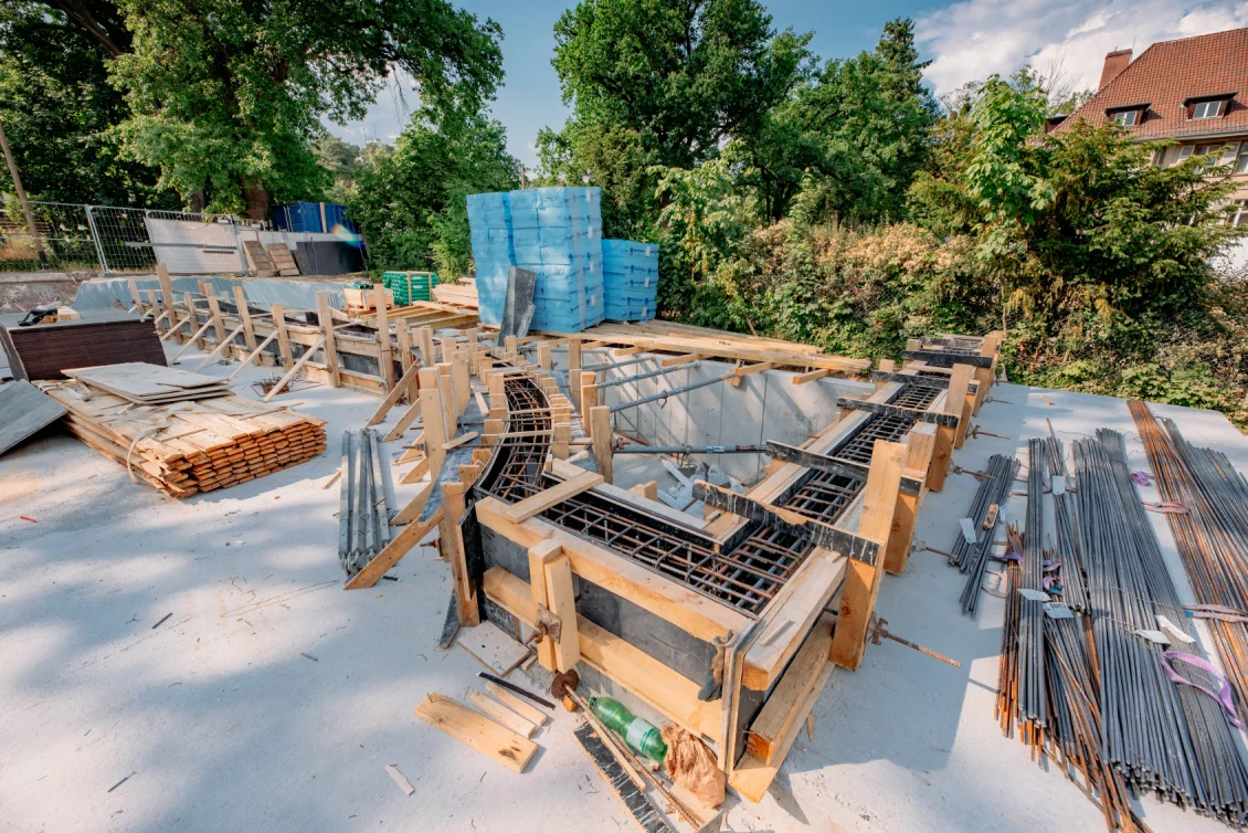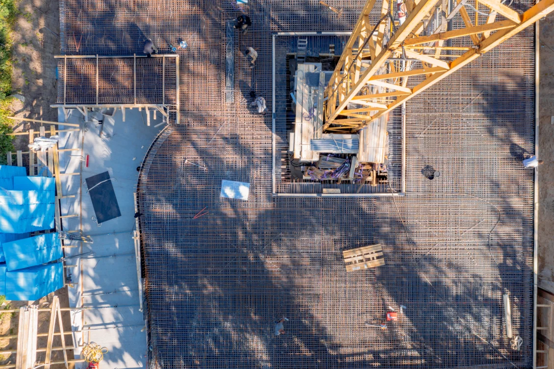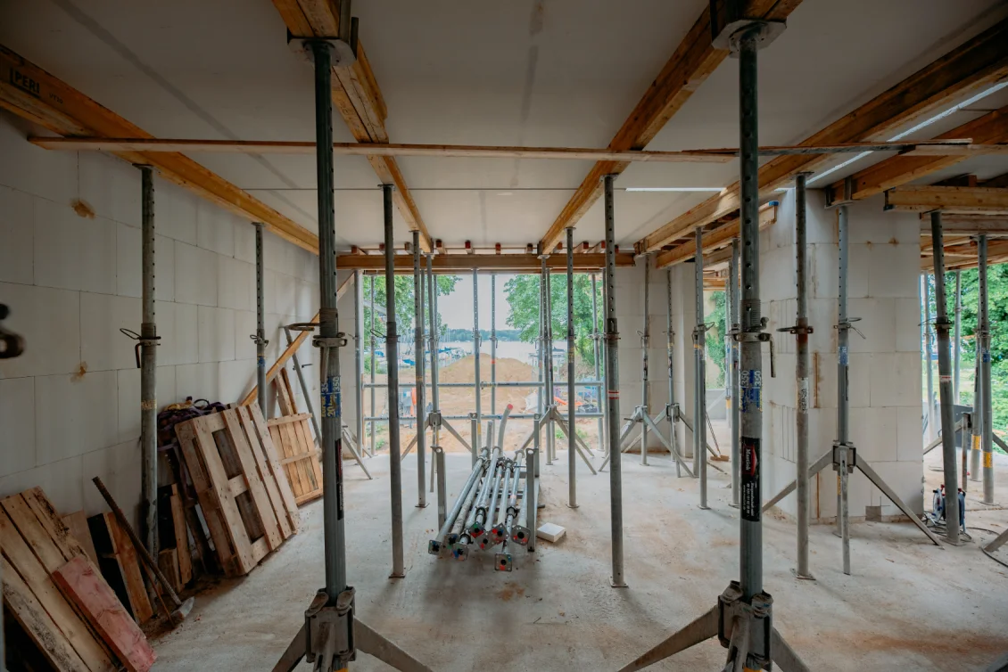Die Vorbereitungen für die Decke des Untergeschosses laufen in vollem Gange. Die Bewehrungseisen werden gemäß den vom Statiker erstellten Plänen verlegt. Die einzelnen Elemente der Filigrandecke werden durch eine temporäre Konstruktion aus Drehsteifen und Holzträgern, sogenannten “Jochen” getragen.