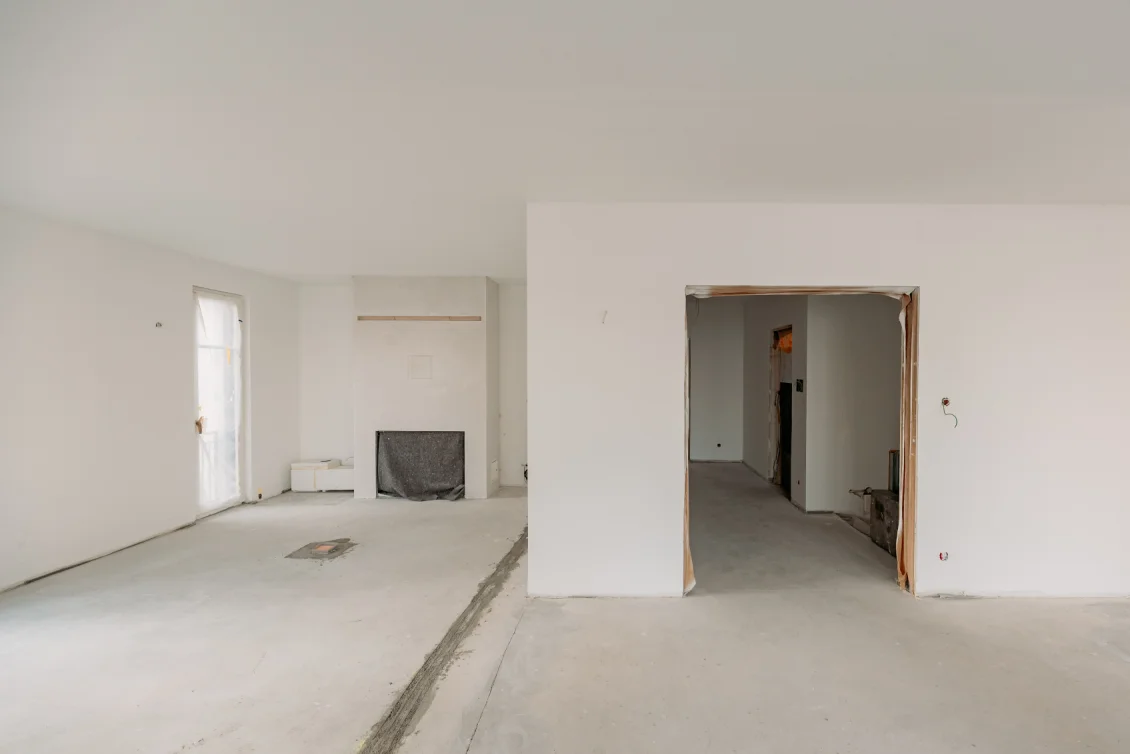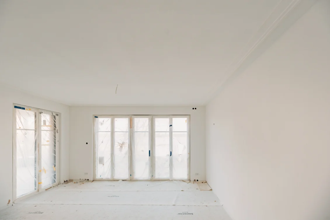 Parallel dazu schreiten die Malerarbeiten im Innenbereich voran. Die Wände erhalten ihr gleichmäßiges, helles Finish, das die großzügige Raumstruktur betont und den Räumen eine erste Ahnung ihrer finalen Atmosphäre verleiht – ein entscheidender Schritt auf dem Weg zur Vollendung.