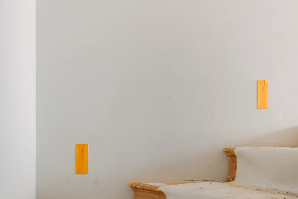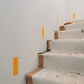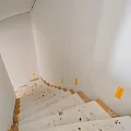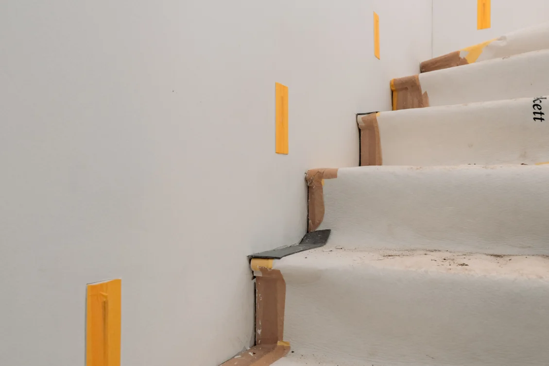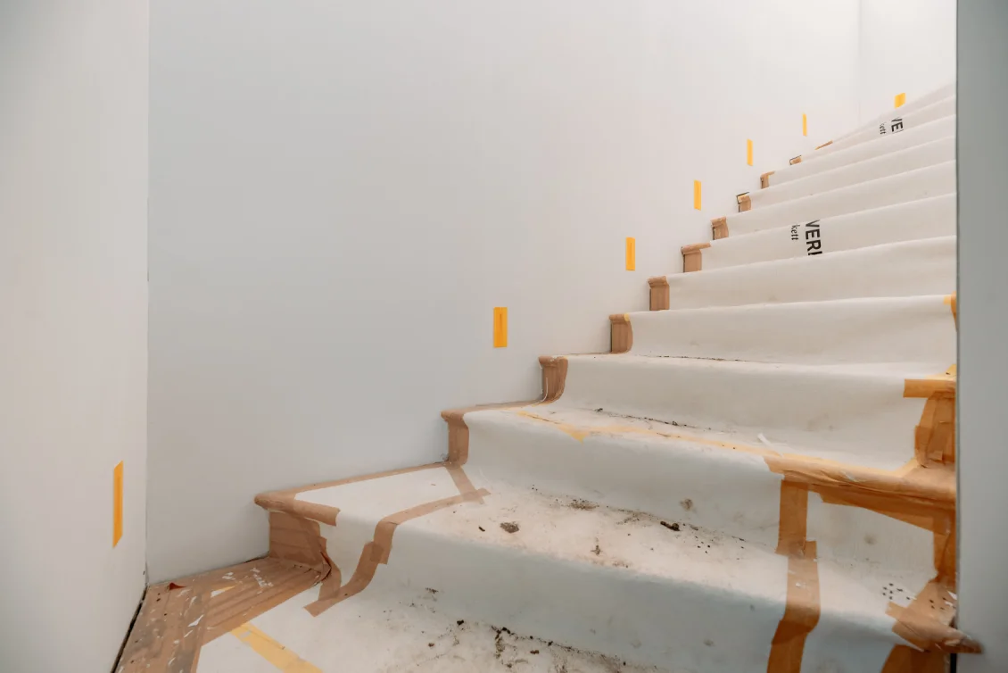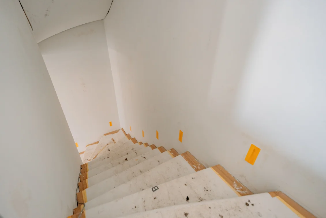 Im Treppenhaus zeigt sich ein erster Blick auf die zukünftige Beleuchtung. In die Wände eingelassene Lichtaussparungen setzen elegante Akzente und sorgen für eine stilvolle Atmosphäre. Die Treppenstufen sind weiterhin sorgfältig geschützt, während die letzten Feinarbeiten an den Wänden vorbereitet werden.