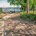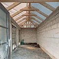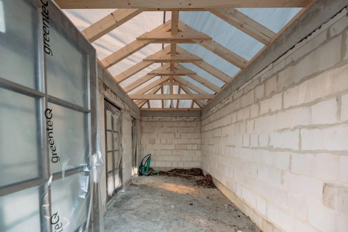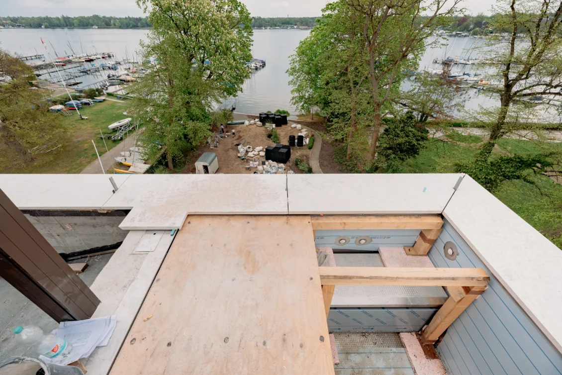 Das Bootshaus nimmt weiter Form an. Die Holzdachkonstruktion steht, derzeit noch geschützt von einer Plane, und lässt bereits die späteren architektonischen Konturen erkennen.