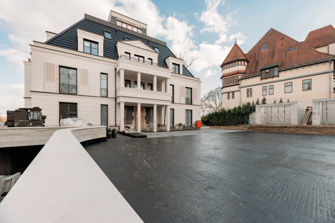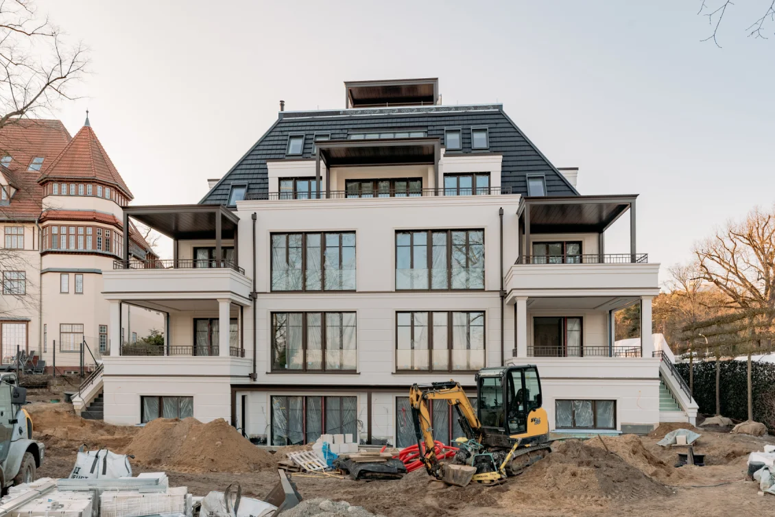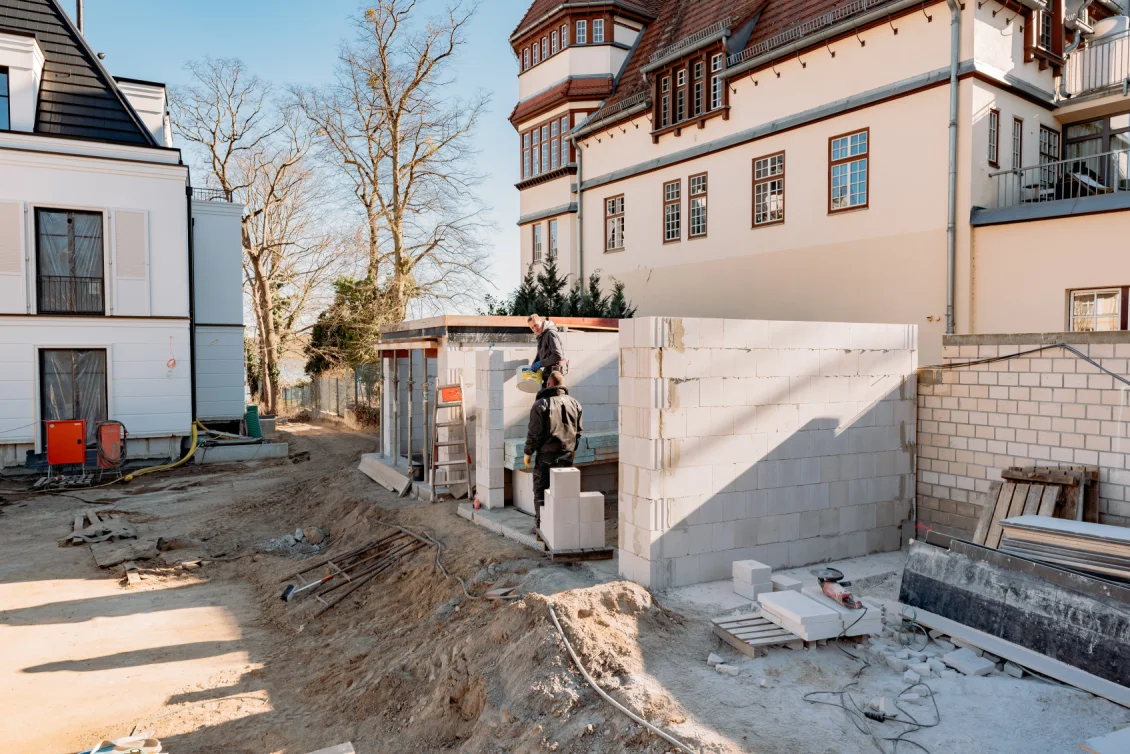 Im Innenausbau schreiten die Arbeiten mit großen Schritten voran: In einem der Bäder wurden bereits die ersten Wandflächen mit edlen, großformatigen Marmorplatten verkleidet. Die Vorbereitungen für die Sanitärinstallationen sind abgeschlossen – die Aussparungen für die späteren Armaturen sind exakt gesetzt. Auch im Außenbereich geht es weiter: Auf den Balkonen haben die Arbeiten zur Verlegung der Natursteinbeläge begonnen – sie sorgen künftig für ein hochwertiges, einheitliches Erscheinungsbild der Fassaden.