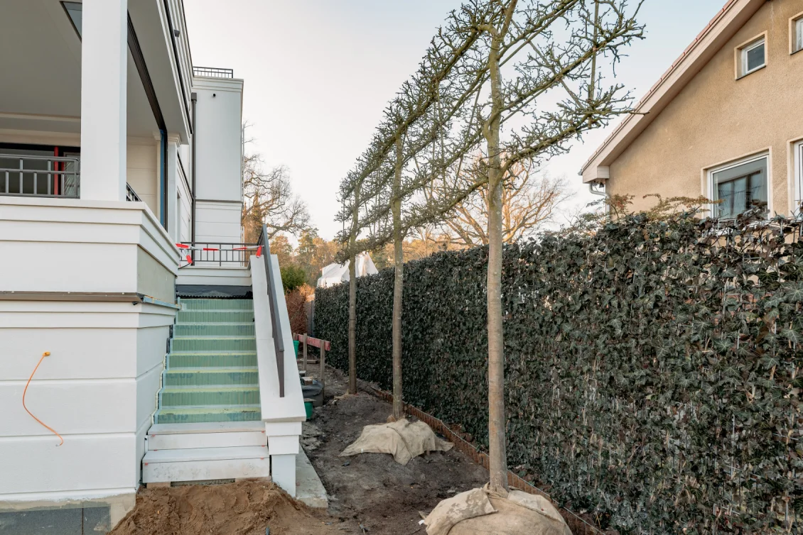 Gleichzeitig sorgen entlang der Grundstücksgrenze neu gepflanzte, formgeschnittene Bäume für Struktur und mehr Privatsphäre – ein weiterer Schritt zur Vollendung des gesamten Ensembles.