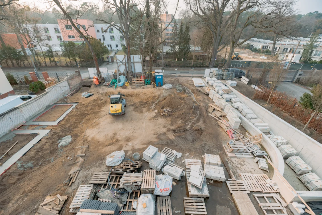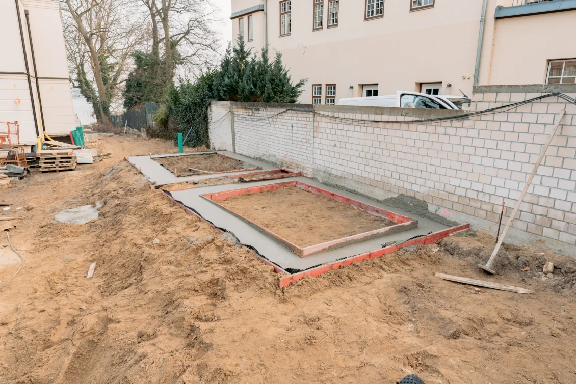 Auf der Tiefgaragendecke schreiten die Arbeiten zügig voran: Eine Schutzlage wurde flächendeckend aufgebracht und bildet die Basis für den weiteren Aufbau mit Erdsubstrat und Gehwegplatten. Parallel dazu erfolgt die Modellierung der Gartenflächen auf der Rückseite des Gebäudes. Erste Pflanzungen wurden vorgenommen und die Bewässerungsschläuche verlegt – sie sind Teil der neuen Tropfanlage, die künftig eine gleichmäßige Versorgung der Grünflächen sichert.