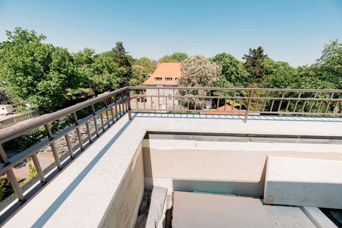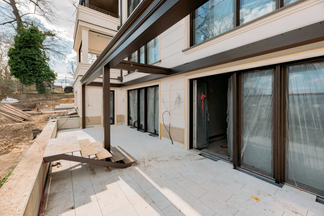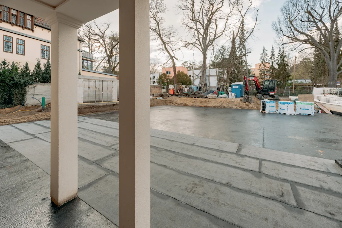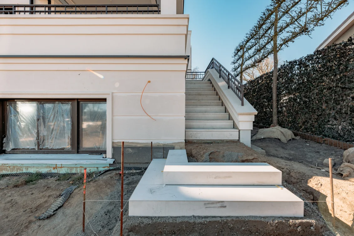 Die Terrassen und Balkone sind mit Natursteinplatten im rechtwinkligen Verband verlegt. Die fest installierte Stahlkonstruktion für die spätere Überdachung ist vollständig montiert und integriert sich harmonisch in das architektonische Gesamtbild. Im Gartenbereich laufen derzeit Tiefbauarbeiten zur Entwässerung und Versickerung – entsprechende Rohrleitungen und Sickerschächte sind bereits geliefert und eingebaut.