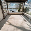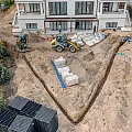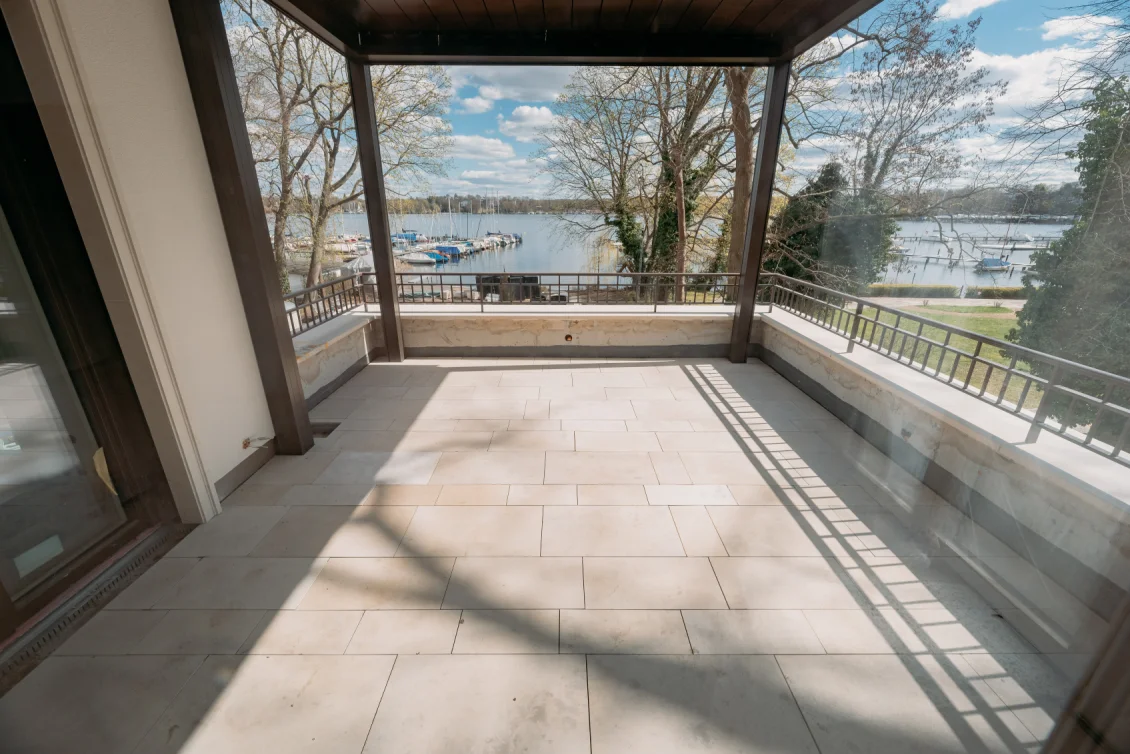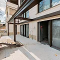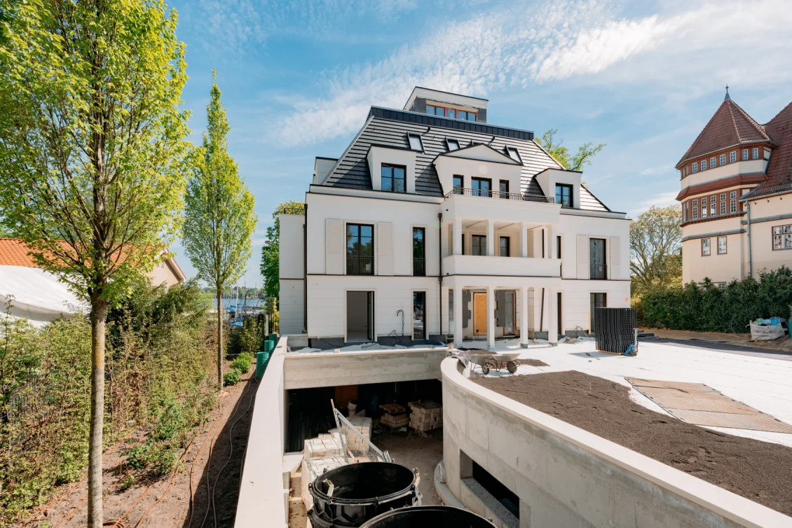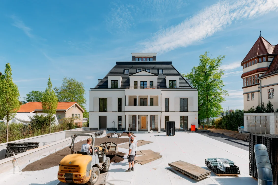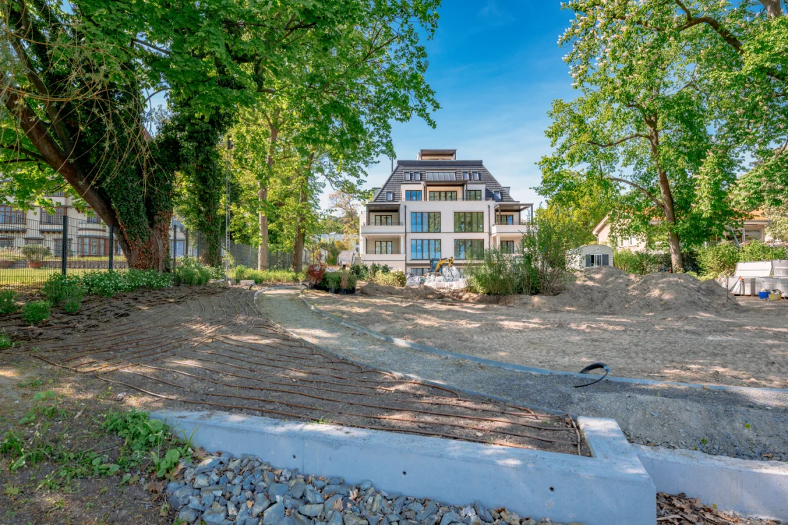 Die Terrassen und Balkone sind mit Natursteinplatten im rechtwinkligen Verband verlegt. Die fest installierte Stahlkonstruktion für die spätere Überdachung ist vollständig montiert und integriert sich harmonisch in das architektonische Gesamtbild. Im Gartenbereich laufen derzeit Tiefbauarbeiten zur Entwässerung und Versickerung – entsprechende Rohrleitungen und Sickerschächte sind bereits geliefert und eingebaut.