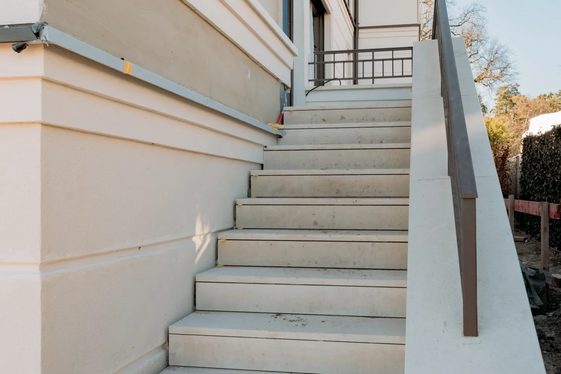 Die Terrassentreppe aus Natursteinbelag, die den Außenbereich mit dem Garten verbindet, nimmt zunehmend Gestalt an und wird bald einen stilvollen Übergang zwischen Innen- und Außenbereich schaffen.