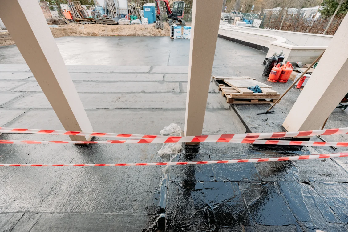 Über der Tiefgarage wurde die Teerarbeit abgeschlossen. Die Teerschicht sorgt für eine effektive Abdichtung gegen Feuchtigkeit und schützt das Betonfundament vor Witterungseinflüssen. Zudem bietet der Asphalt eine stabile Oberfläche, die den Belastungen durch Fahrzeugverkehr standhält, und verhindert Frostschäden.