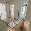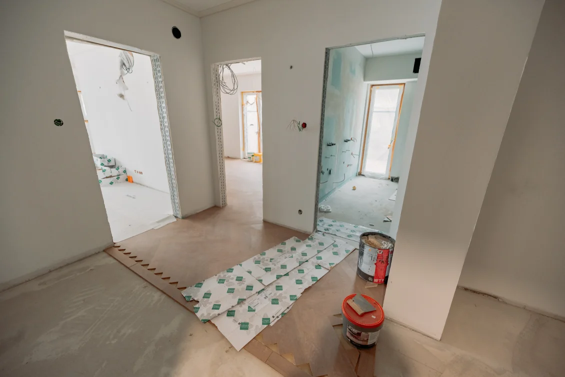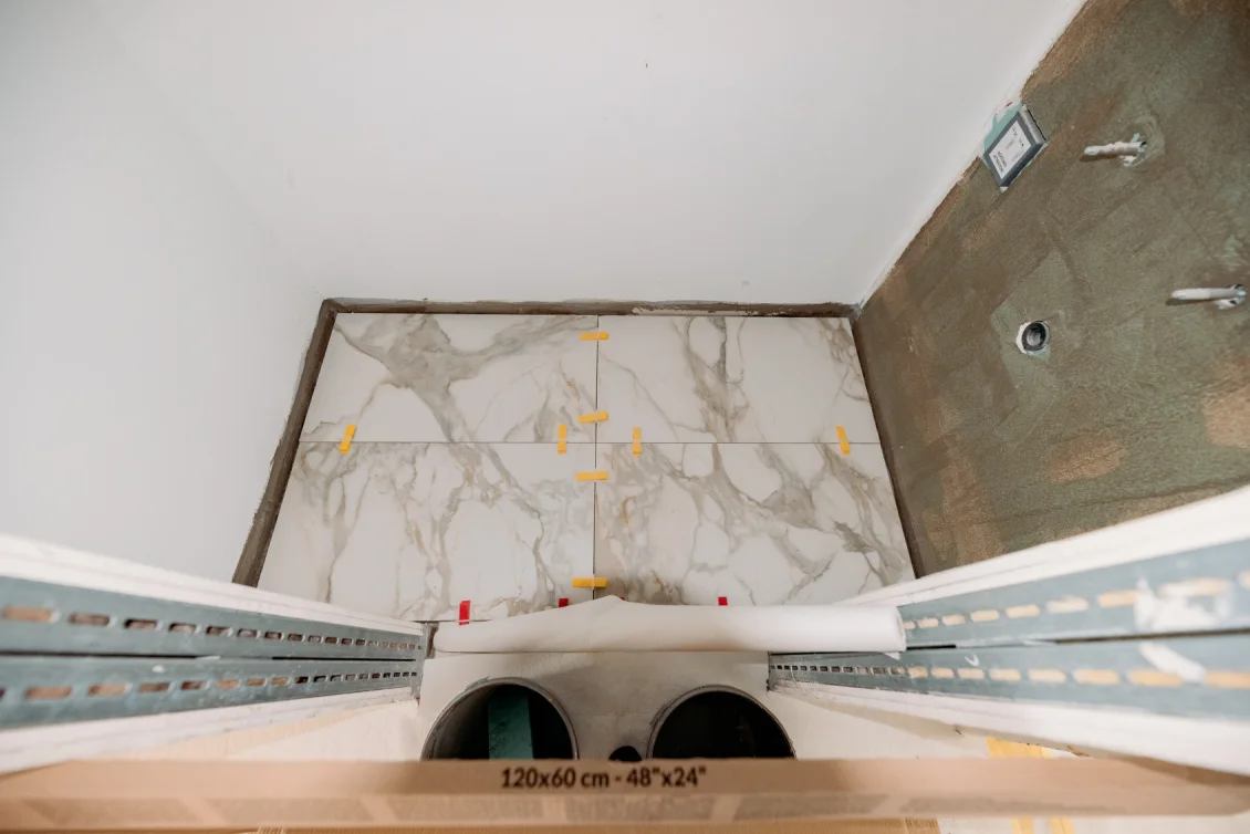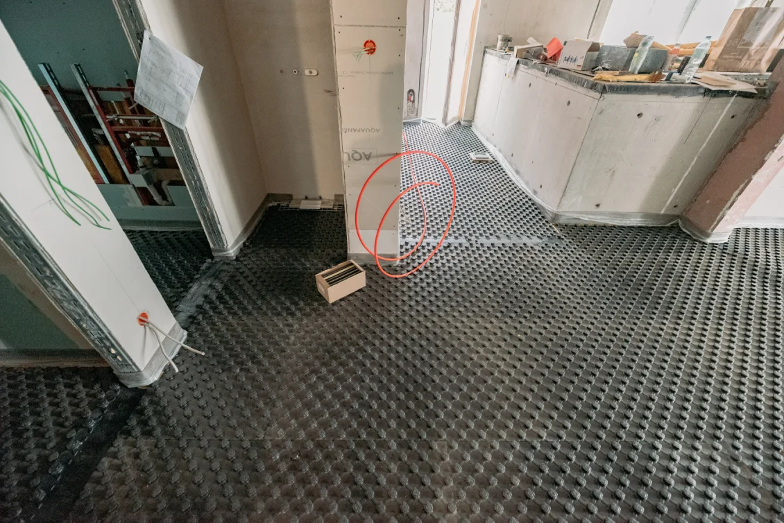 Im Untergeschoss erfolgen derzeit die Vorarbeiten für die Fußbodenheizung – Leitungsführung und Dämmung werden vorbereitet. In den Bädern hat der Ausbau begonnen: In einer der Duschen wurden bereits großformatige Marmor-Bodenplatten verlegt. Gleichzeitig wird in mehreren Wohnräumen Parkett im Fischgrätverband eingebaut.