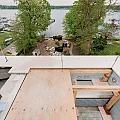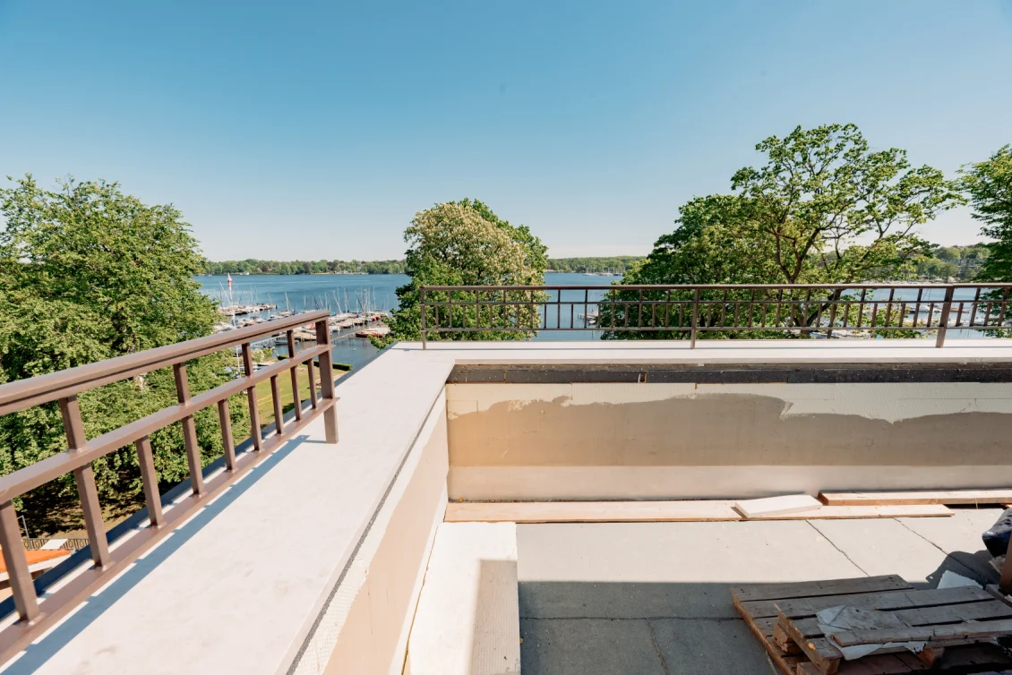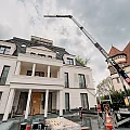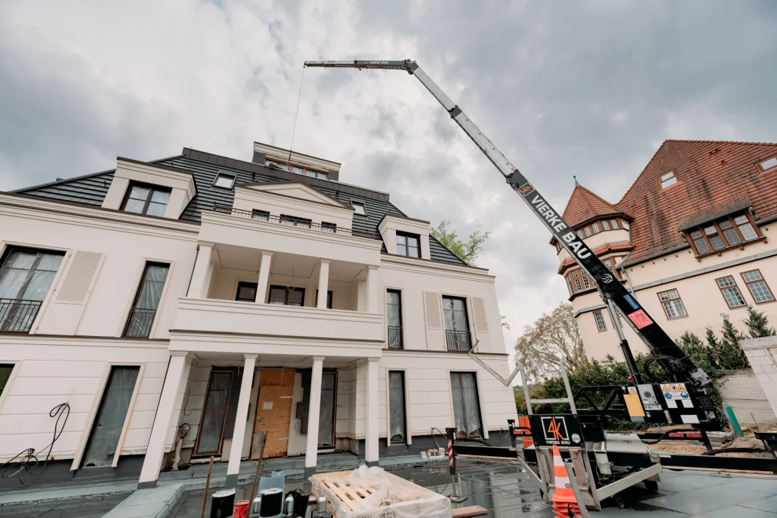 Auf der Dachterrasse wurden Natursteinplatten angeliefert, die mit Hilfe eines Krans zur Verlegung vorbereitet werden. Die Abdichtung ist bereits aufgebracht und dient als Basis für den weiteren Aufbau.