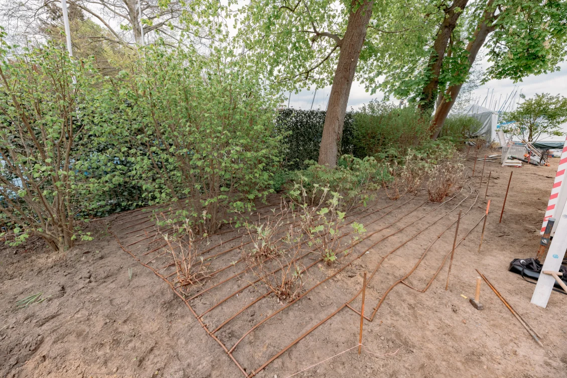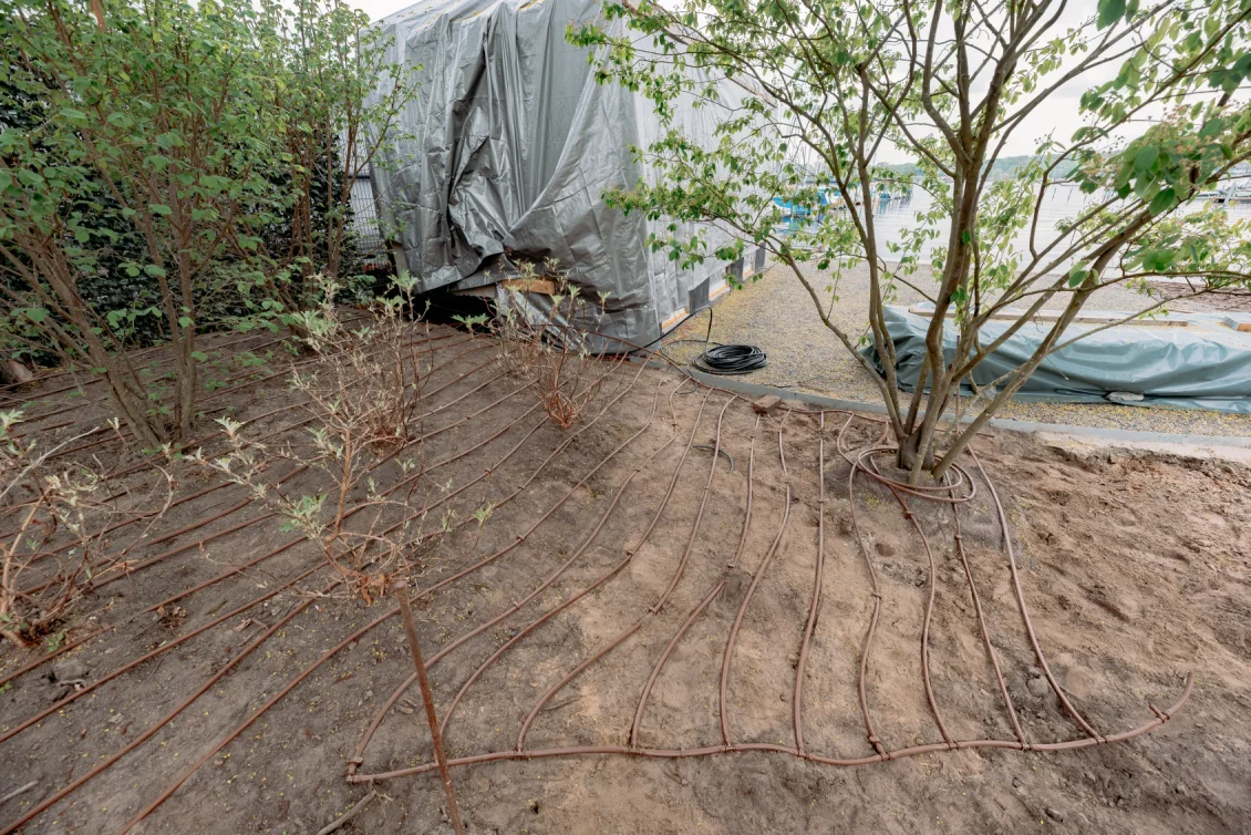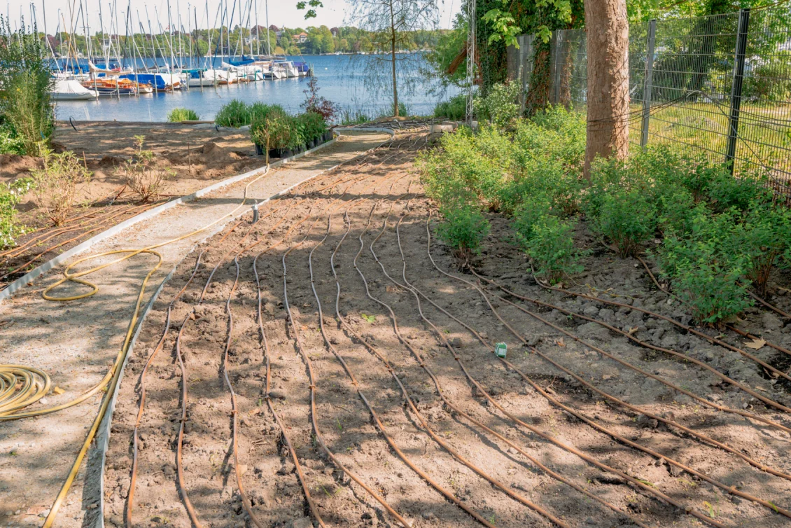 Im Garten wurde eine Tropfbewässerungsanlage installiert. Die Leitungen verlaufen bodennah und sorgen künftig für eine effiziente Versorgung der Pflanzflächen.
