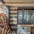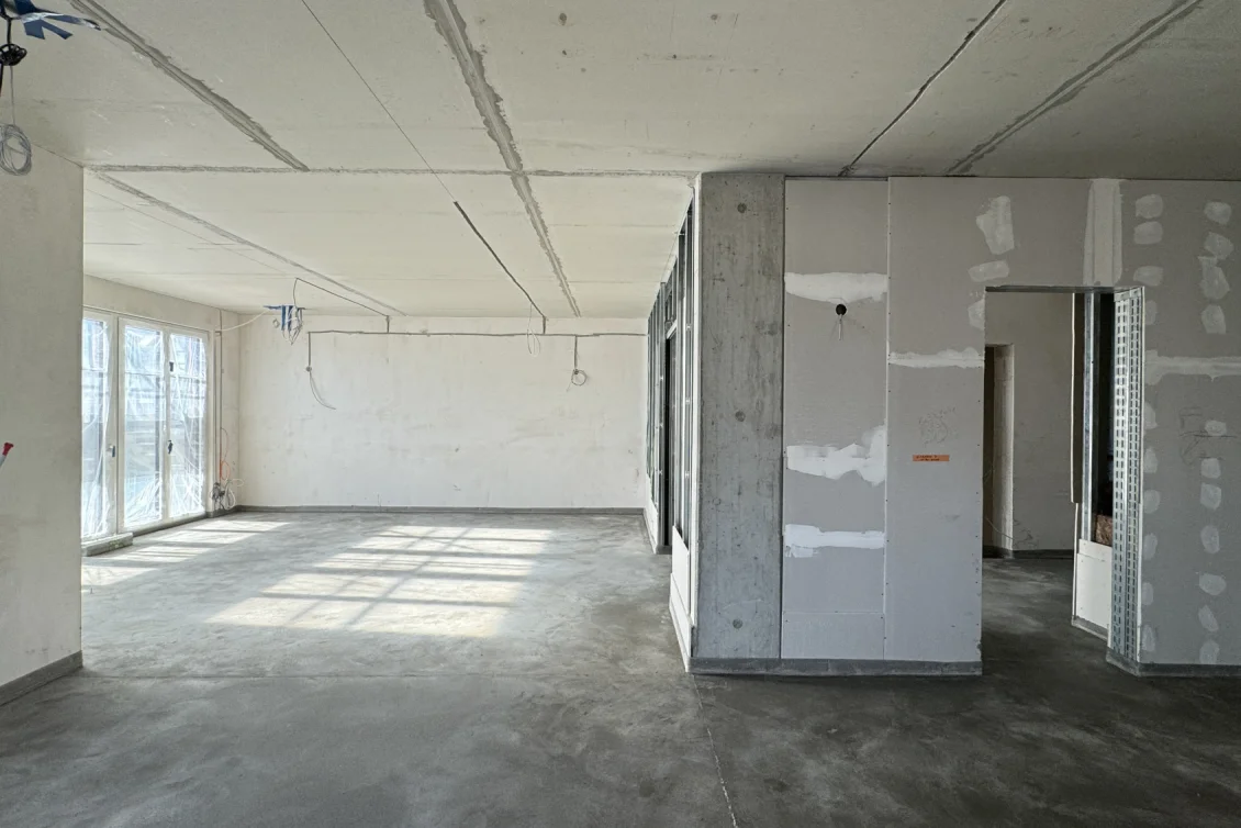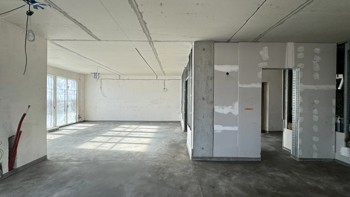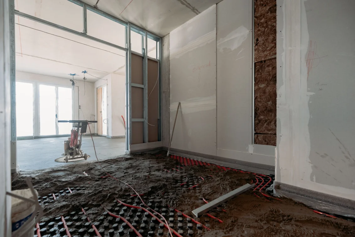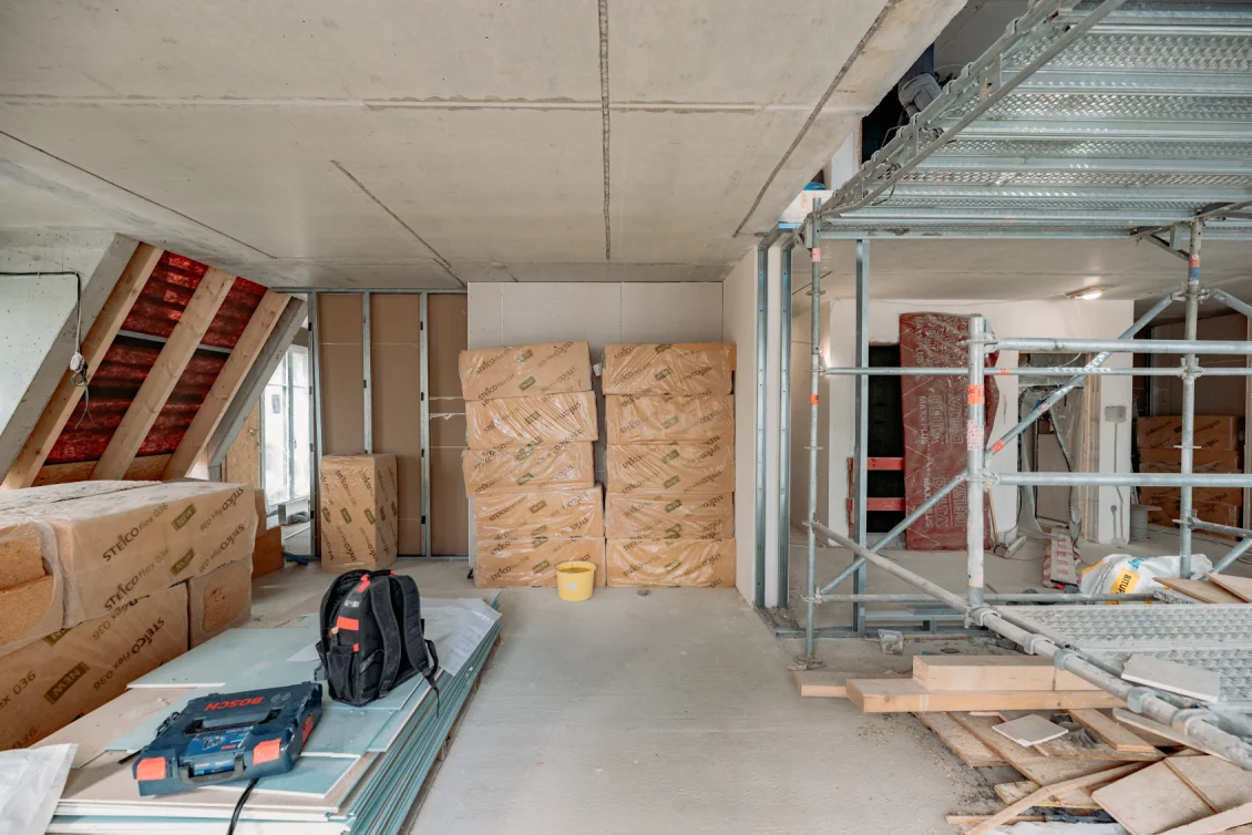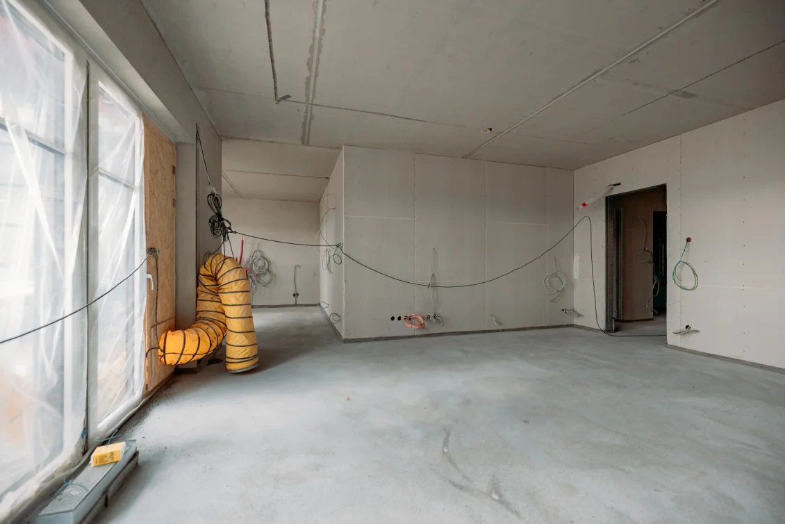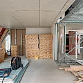 Damit in der kommenden Woche die erste Lage Estrich gegossen werden kann, werden die aktuell nur einseitig geschlossenen Trockenbauwände ‘abgestellt’. Das bedeutet, dass die Beplankung nur bis zu einer Höhe von etwa 50cm montiert wird, sodass an den Installationen in den Wänden noch gearbeitet werden kann.