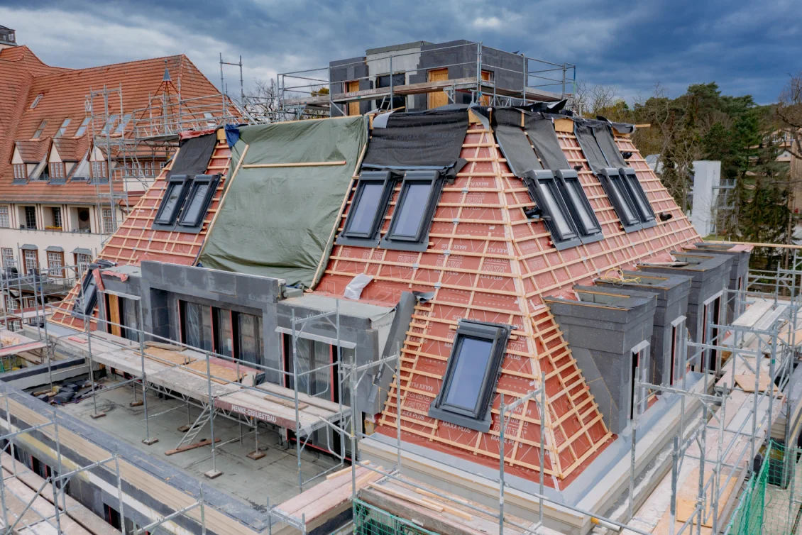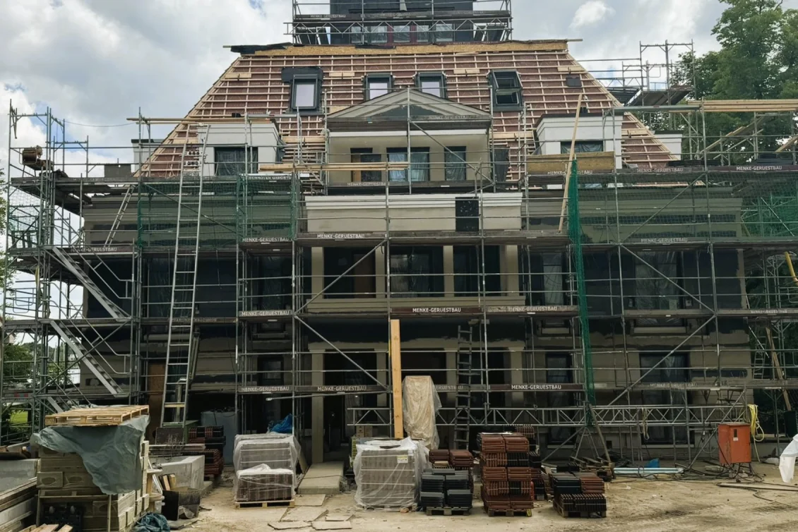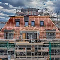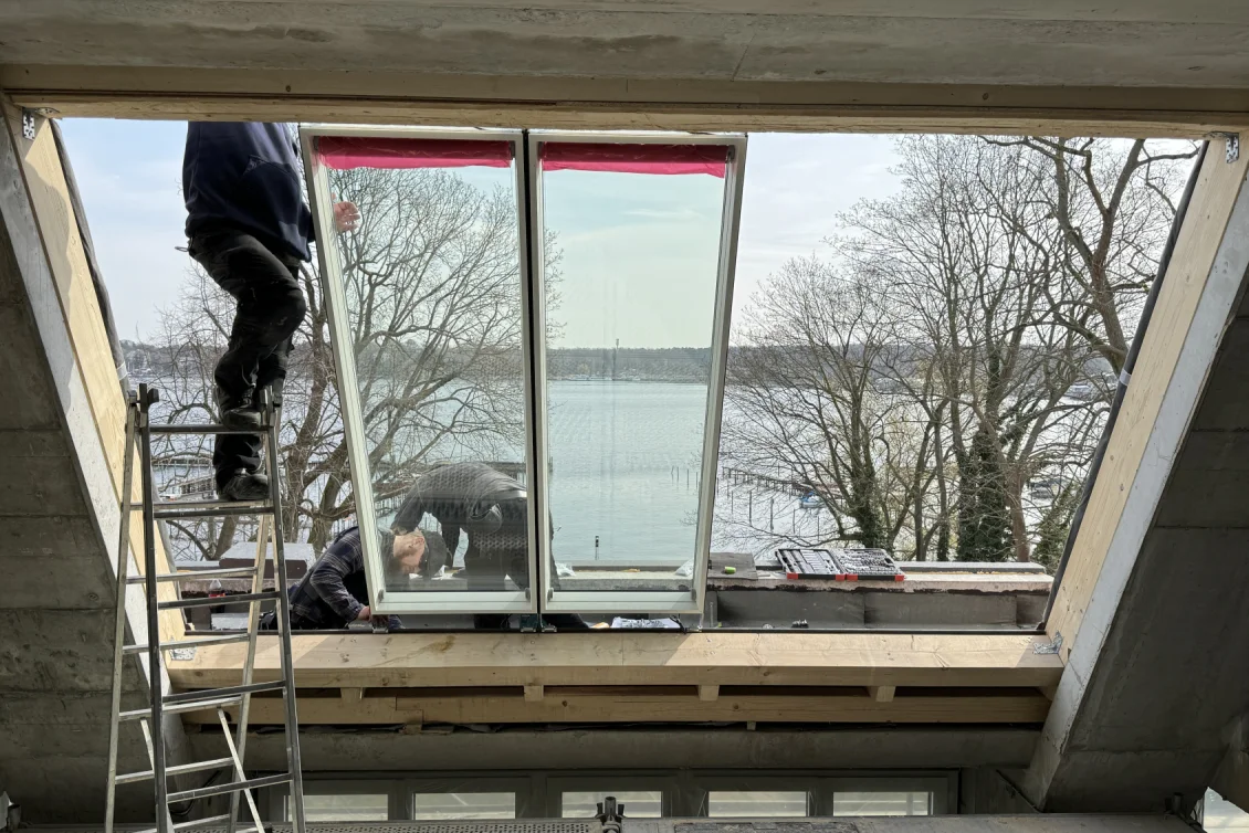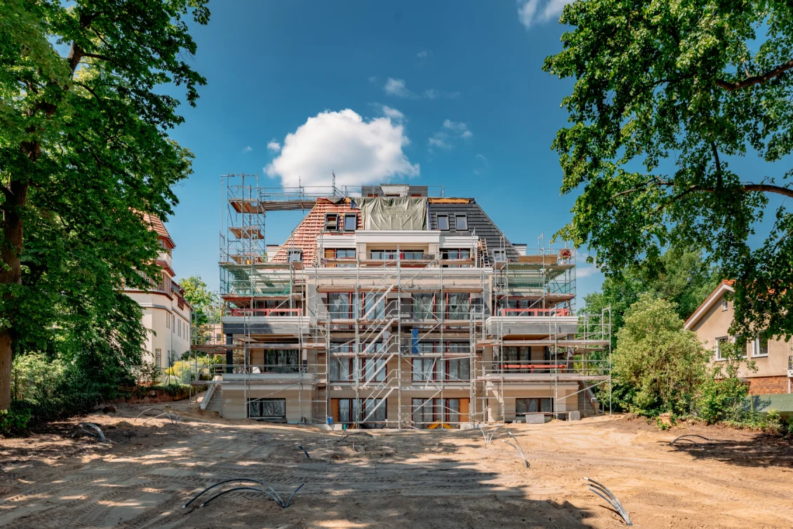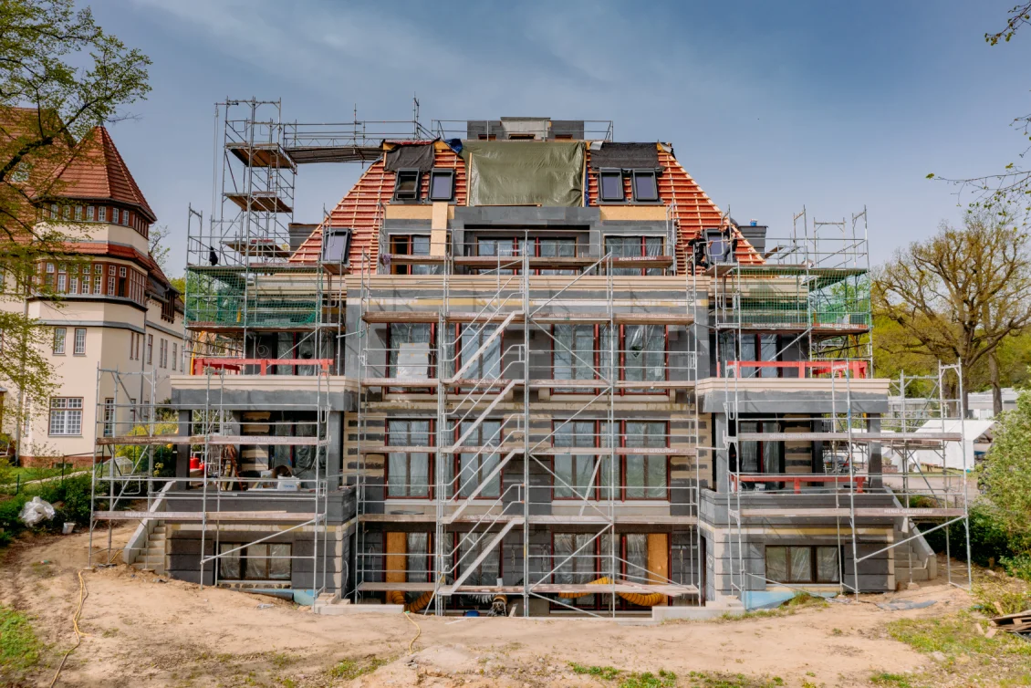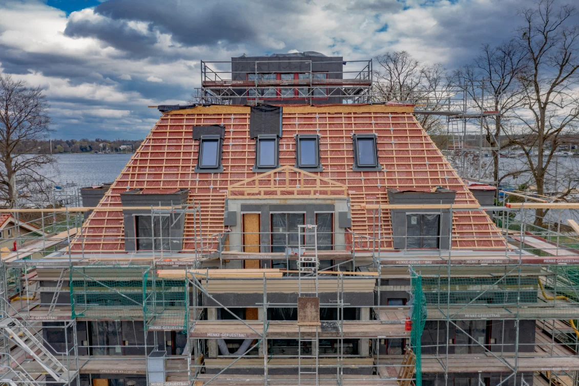 Die Arbeiten an der Fassade nehmen ihren Lauf. Hinzu kommen Bossen im Erd- und Gartengeschoss zur Strukturierung der Gebäudehülle, sowie Gesimse an den Außenwänden und den oberen Brüstungs- und Gaubenabschlüssen. Ebenfalls ein Meilenstein sind die großflächigen Dachfenster, von denen aus unsere Kunden bald den Blick auf den Wannsee genießen können.