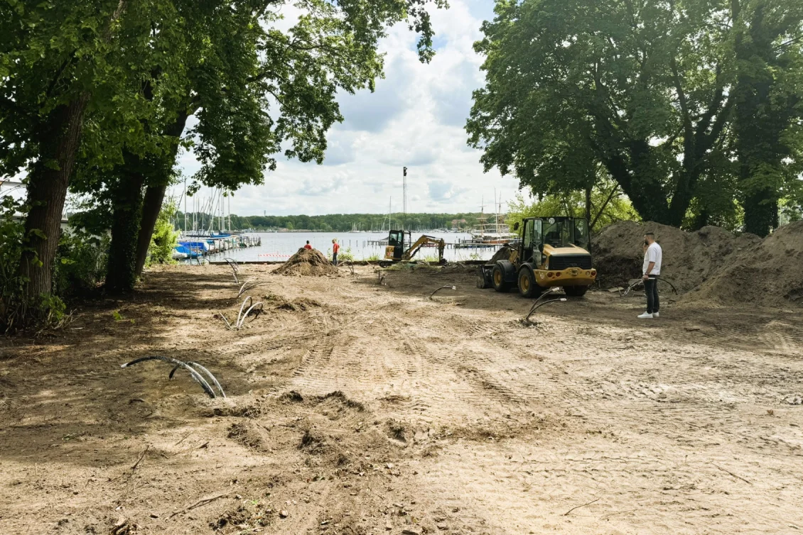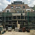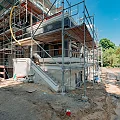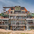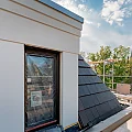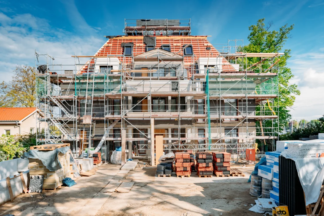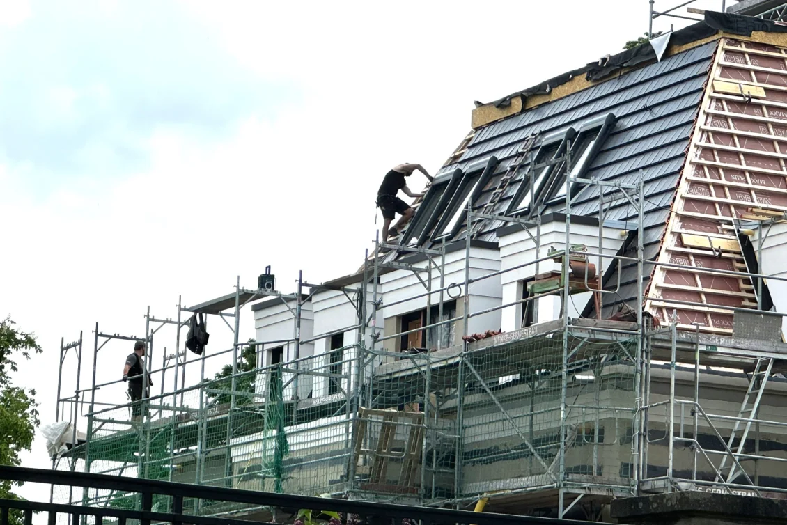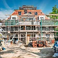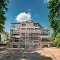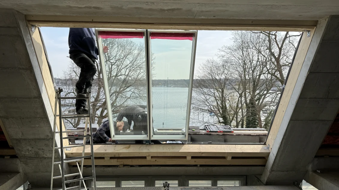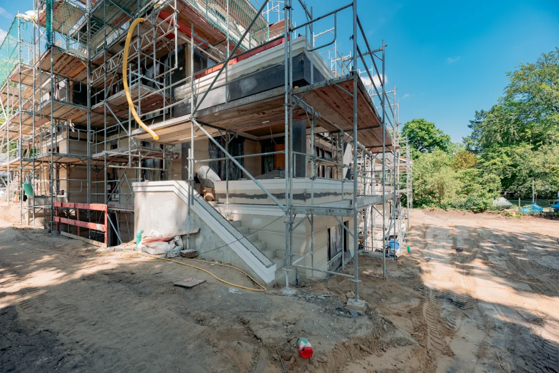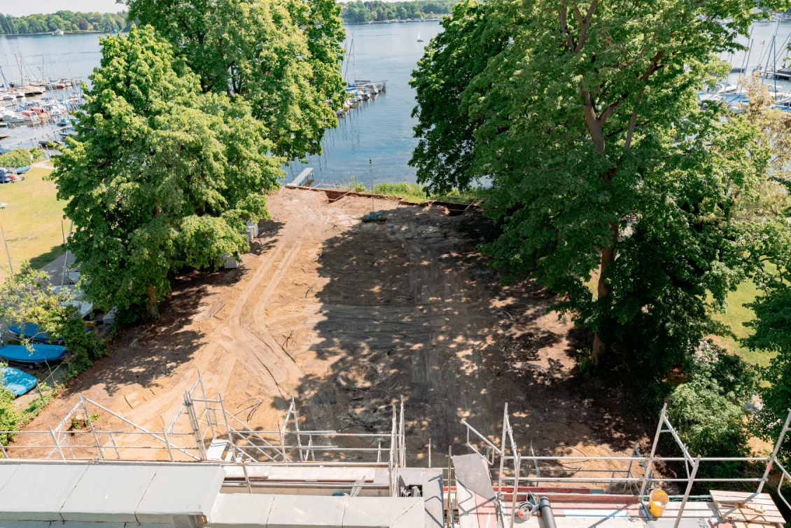 Die Arbeiten an der Fassade nehmen ihren Lauf. Hinzu kommen Bossen im Erd- und Gartengeschoss zur Strukturierung der Gebäudehülle, sowie Gesimse an den Außenwänden und den oberen Brüstungs- und Gaubenabschlüssen. Ebenfalls ein Meilenstein sind die großflächigen Dachfenster, von denen aus unsere Kunden bald den Blick auf den Wannsee genießen können.