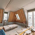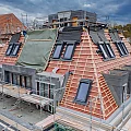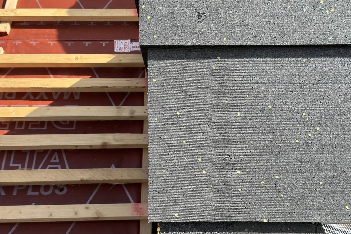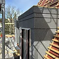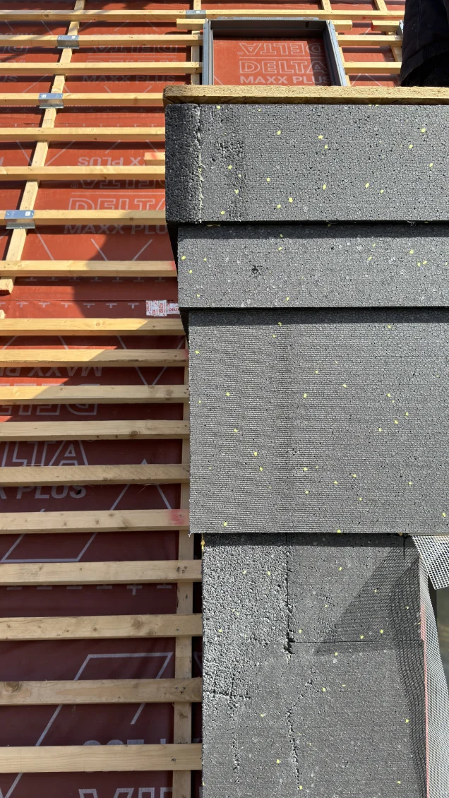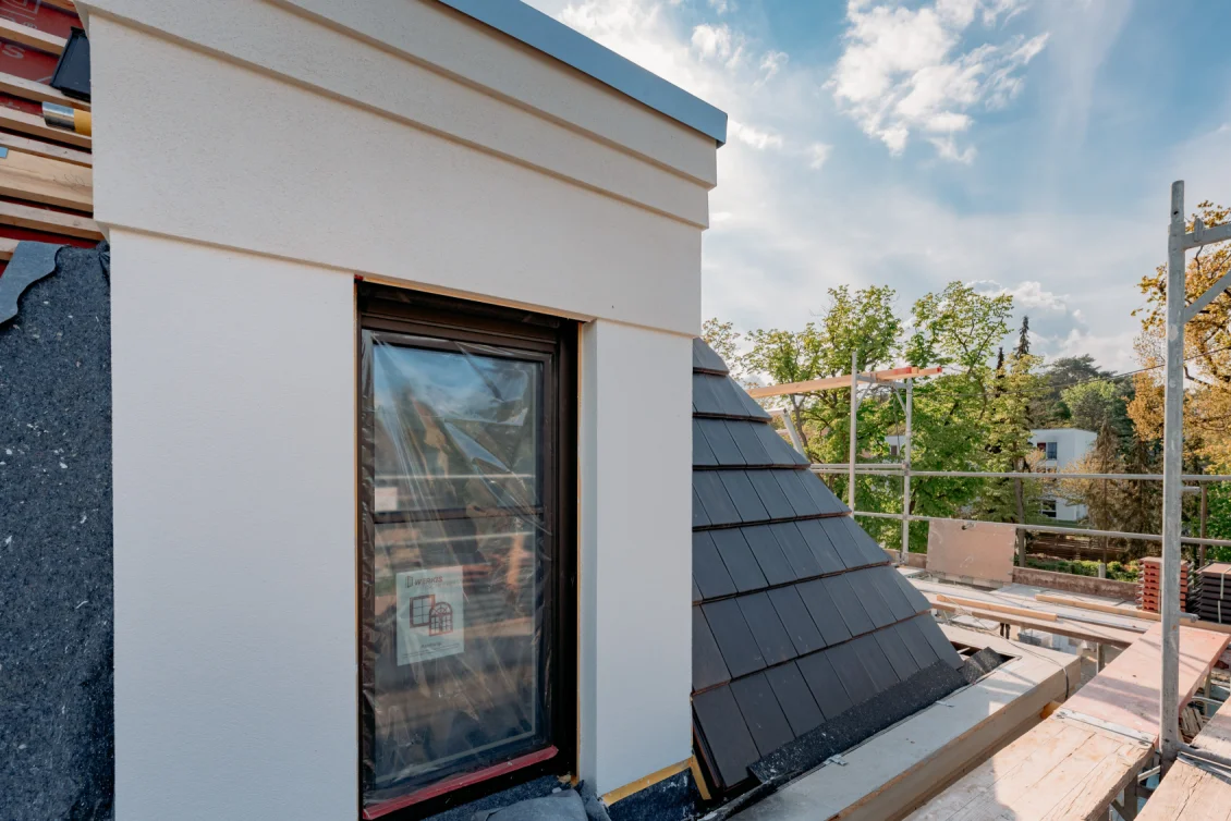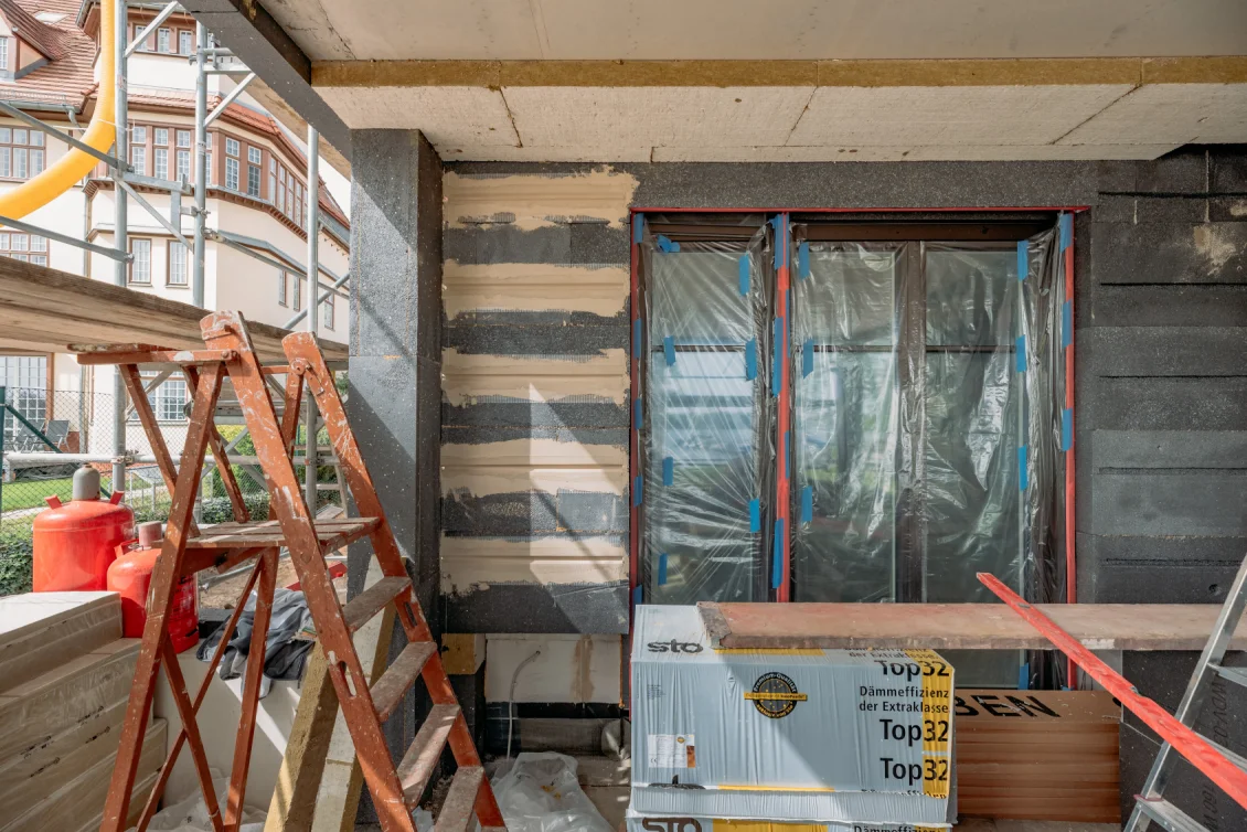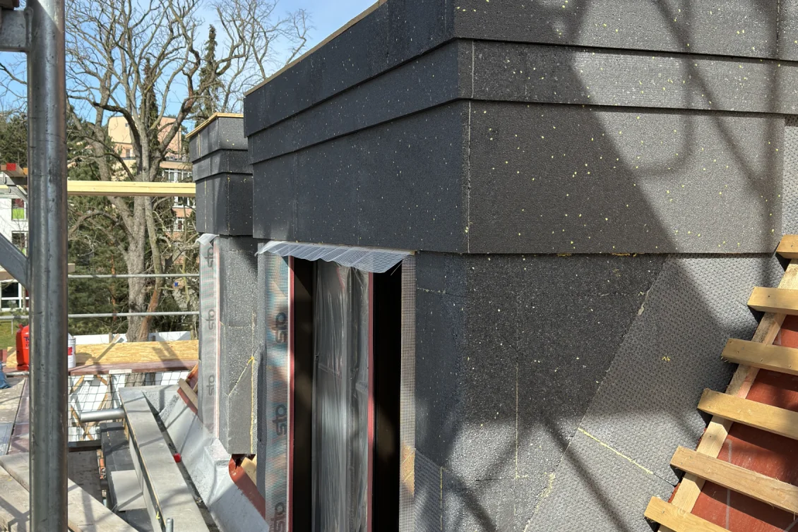 Die Gesimse und Bossen der Fassade werden armiert. Hierzu wird besonders feines Armierungsgewebe verwendet, damit exakt die gewünschte Form entsteht. Für die Dämmung der Schrägdachflächen verwenden wir Holzwolle, für eine nachhaltige Bauweise und optimalen sommerlichen Wärmeschutz.