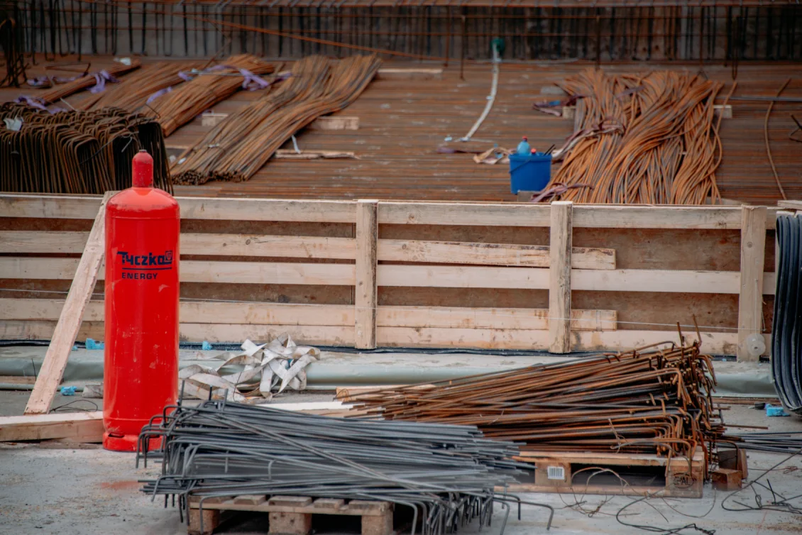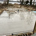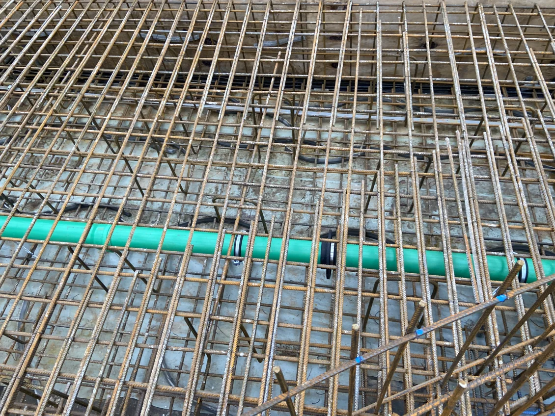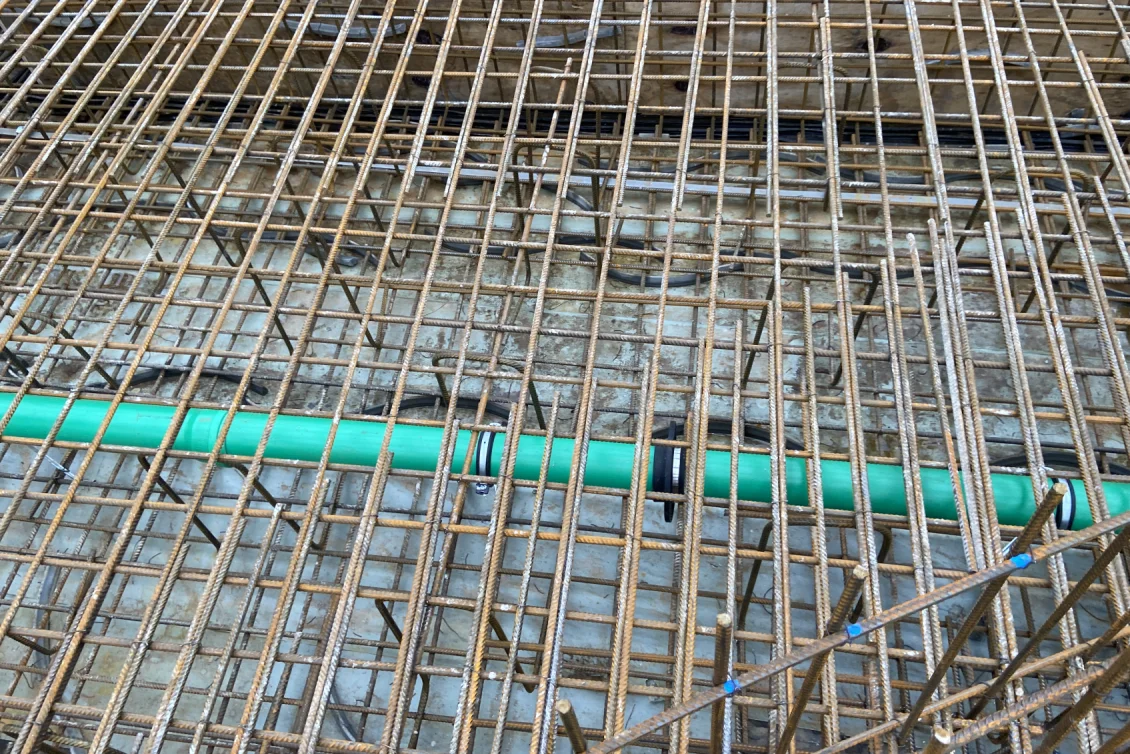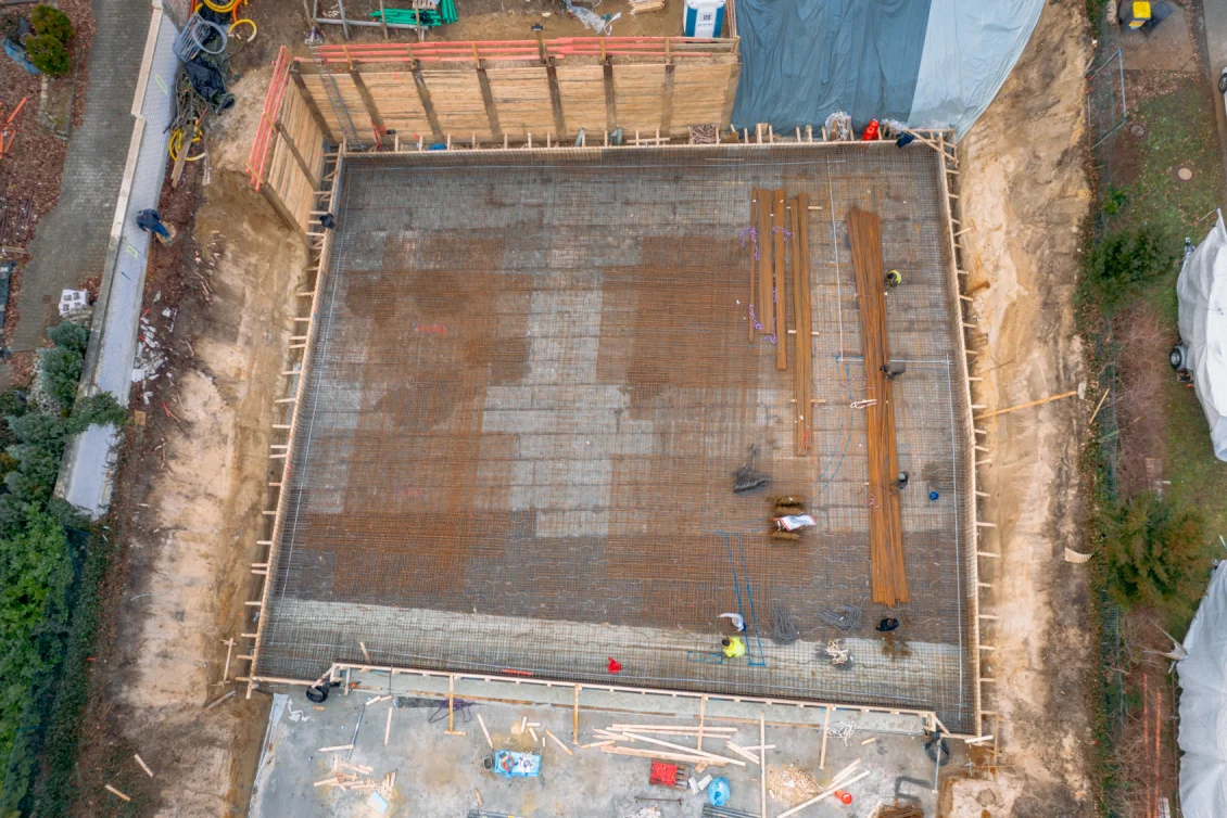 Etwa 30 Tonnen Stahl werden für die Bodenplatte als untere und obere Bewehrungslage verbaut. Für die zukünftige Rinnenentwässerung werden Abwasserrohre, die später innerhalb der Bodenplatte liegen im Gefälle verlegt und in der Höhenlage fachgerecht gesichert. Nach der Abnahme durch den Prüfstatiker erfolgt die Betonage der Bodenplatte der Tiefgarage mit anschließender Nachbehandlung des Betons, um diesen vor Austrocknung zu schützen.