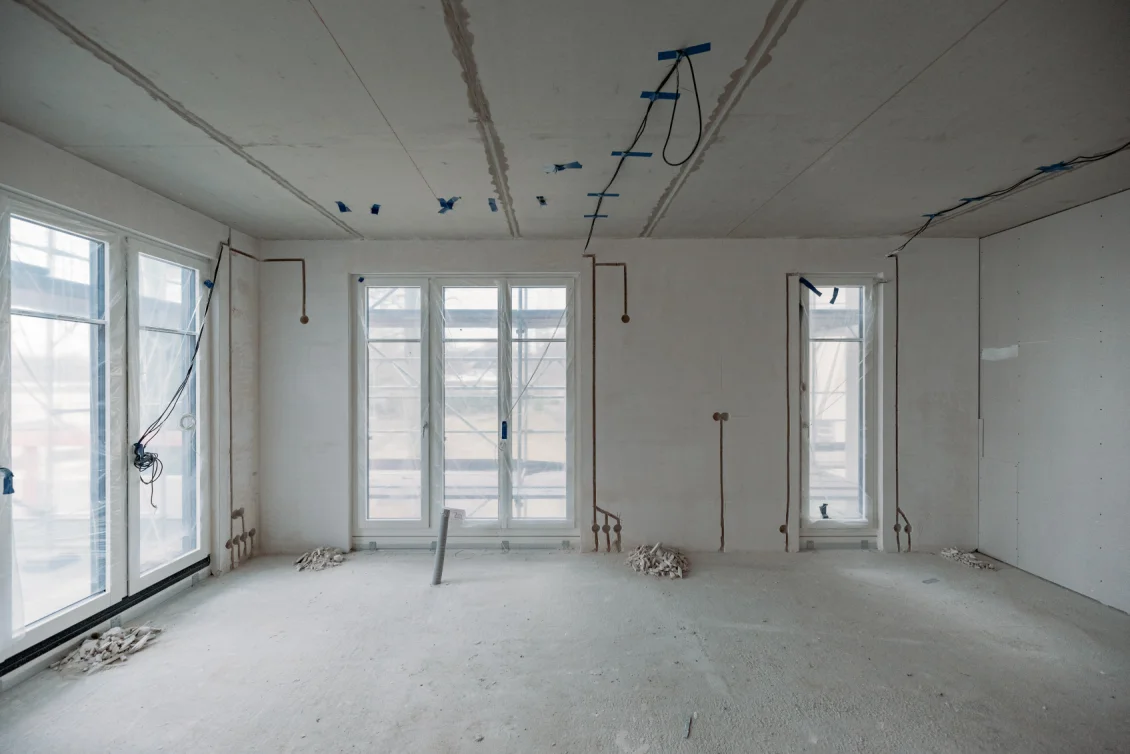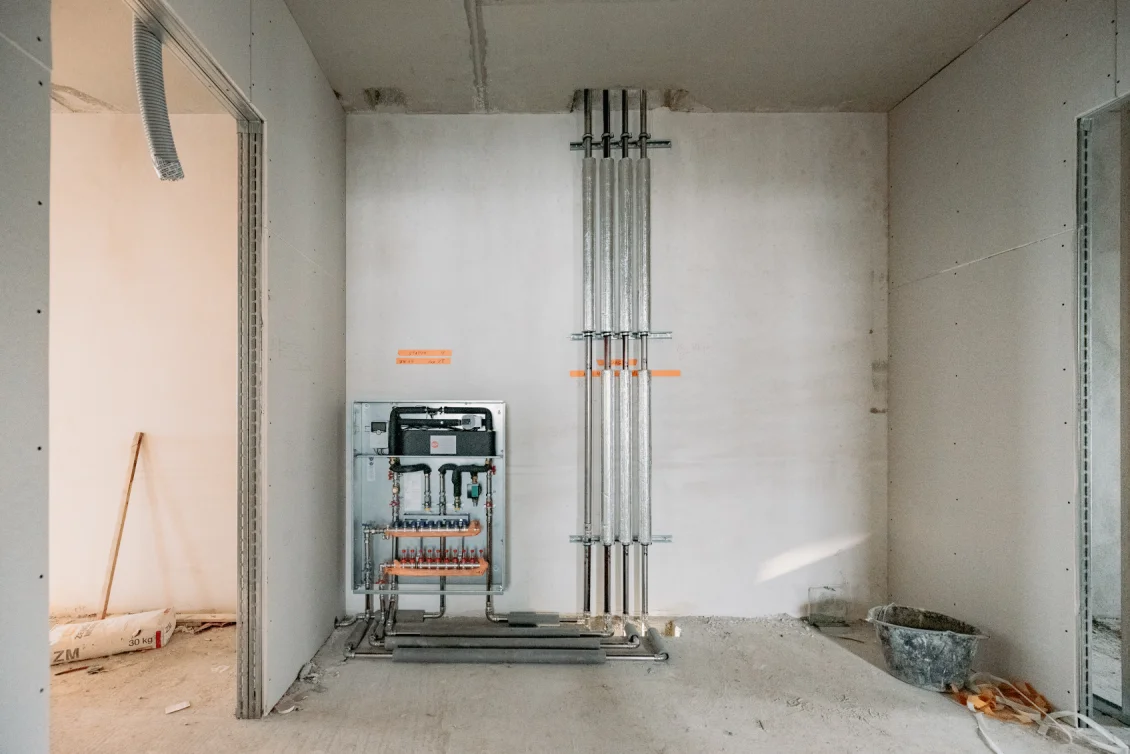 Neben den Trockenbauarbeiten haben auch die Installationen der haustechnischen Anlagen und die Vorbereitungen für die Elektroinstallationen begonnen. Jede Wohnung erhält je Geschoss eine sogenannte Wohnungsstation, die als als Verteiler für Fußbodenheizung und Trinkwasserversorgung fungiert.