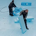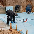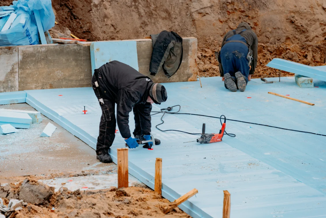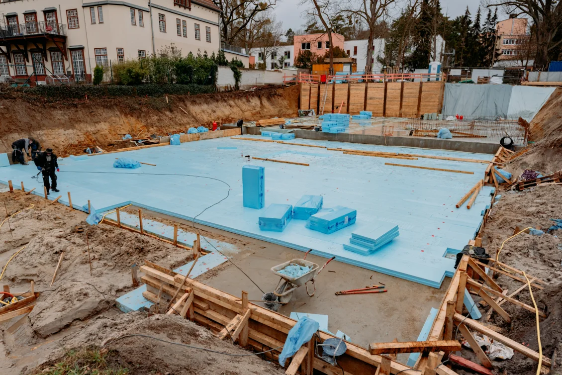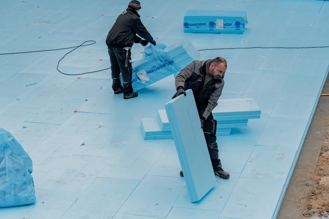 Die Dämmung der Bodenplatte des Wohngebäudes muss besonders druckfest sein, um die Lasten der bis zu 45 cm starken Betonschicht aufzunehmen.