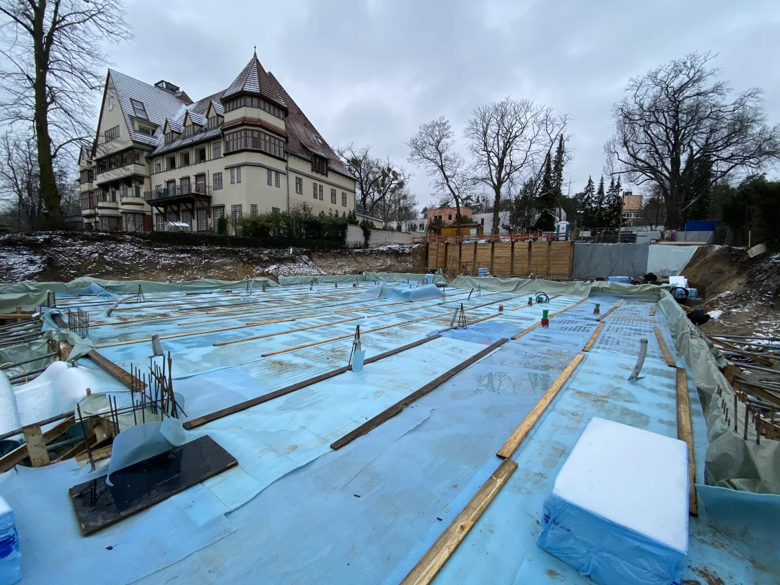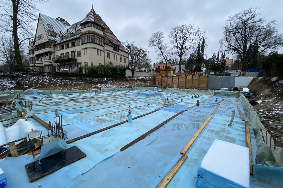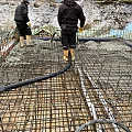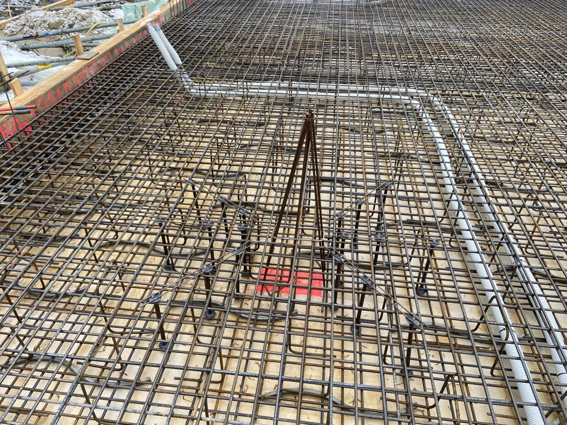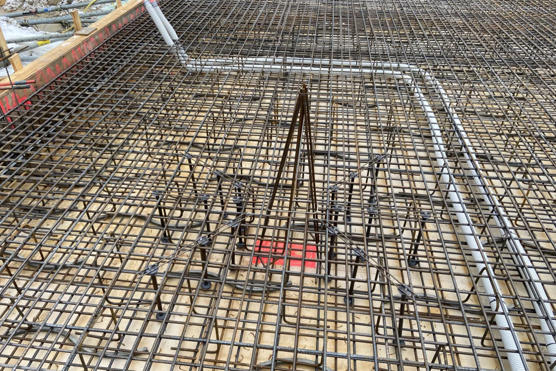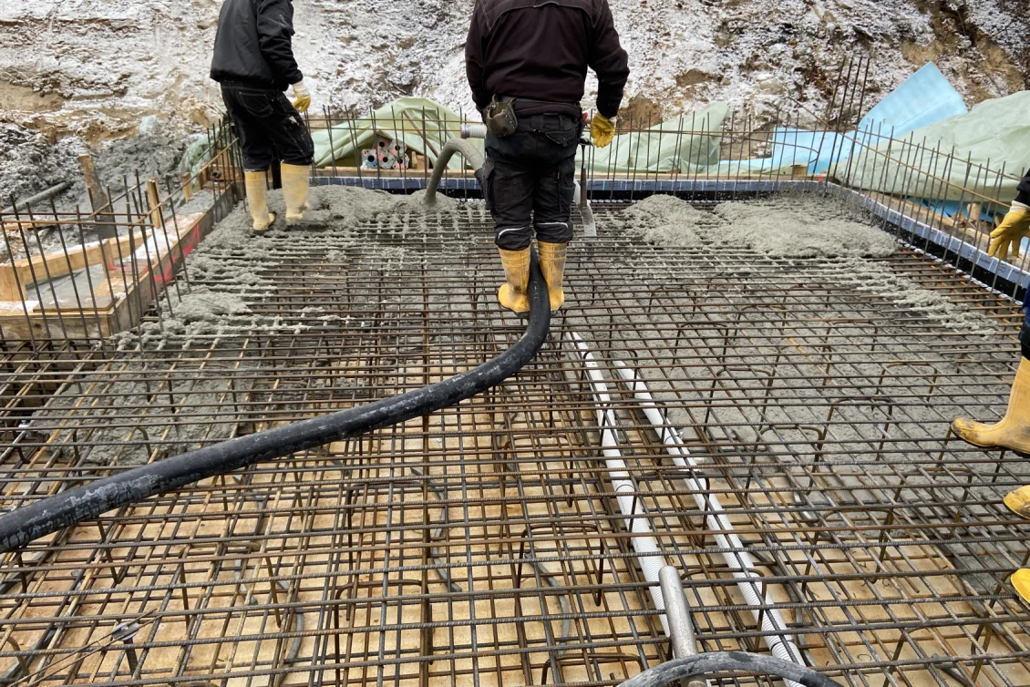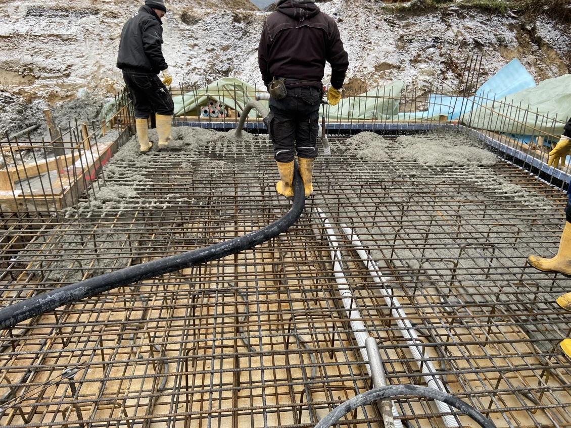 Als Durchstanz- und Querkraftbewehrung werden Bereiche unter den geplanten Stahlbetonstützen mittels Dübelleisten verstärkt. Nun erfolgt die Betonage der Bodenplatte des Wohnhauses. Für die anschließende Nachbehandlung des Betons wird ein sichtbarer Wasserfilm aufgebracht, der durch eine dampfdichte Folie aufrechterhalten wird. Die Dauer der Nachbehandlung hängt von der Festigkeitsentwicklung des Betons ab.