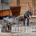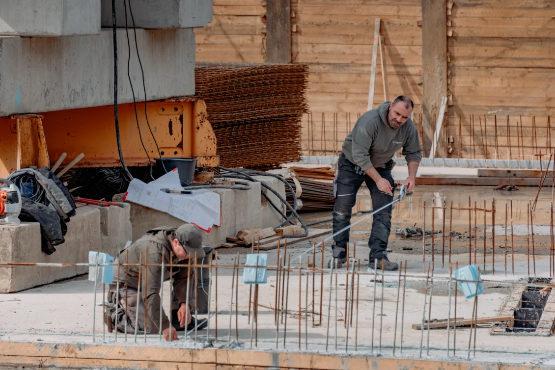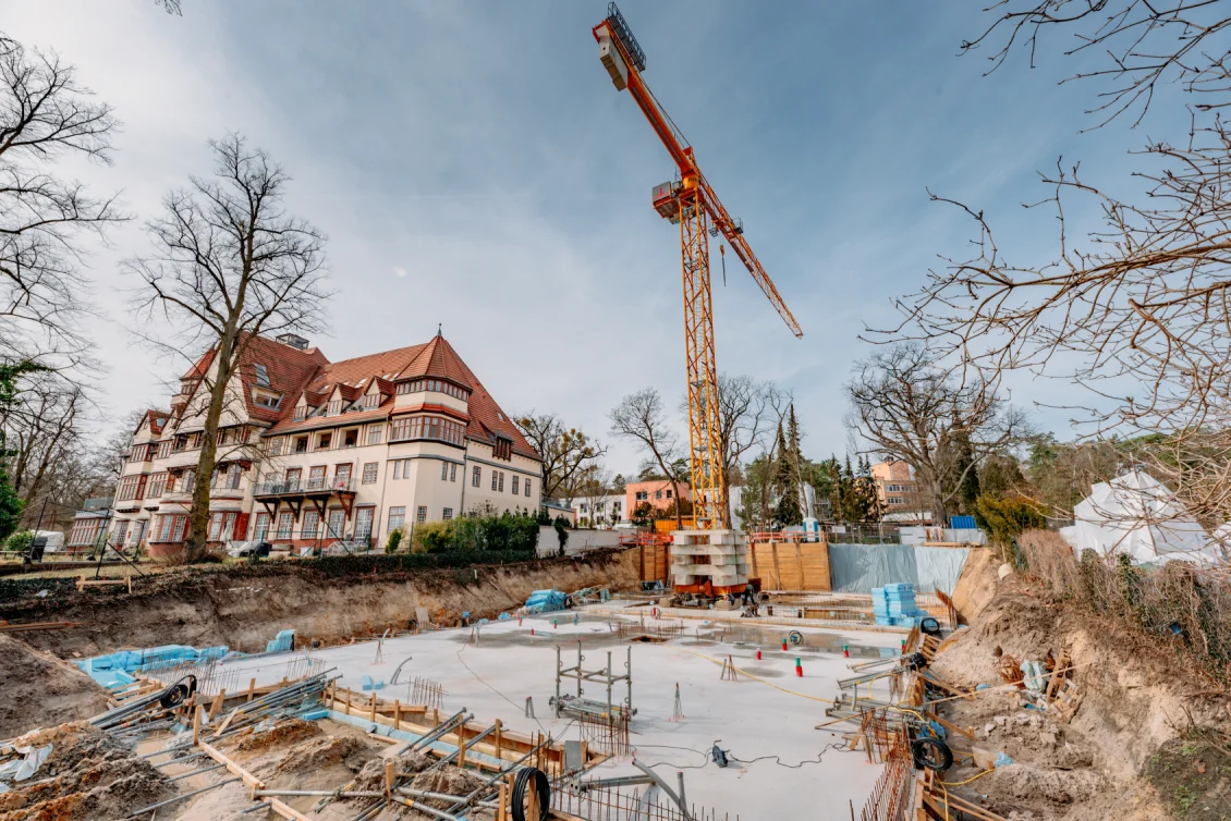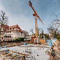 Pünktlich zum Frühlingsanfang wird der Baukran gestellt und leistet wertvolle Montagehilfe. Dank sonnigen Wetters trocknet die Bodenplatte ab und so werden im Untergeschoss bereits die Wände eingemessen.
