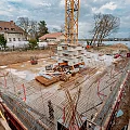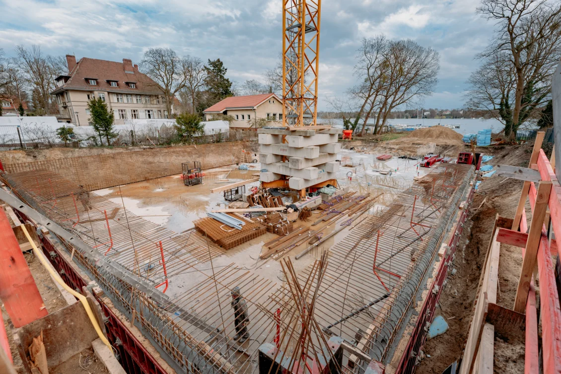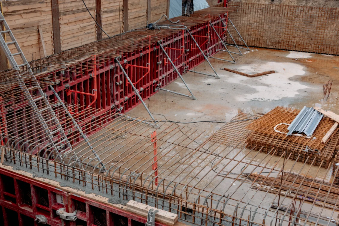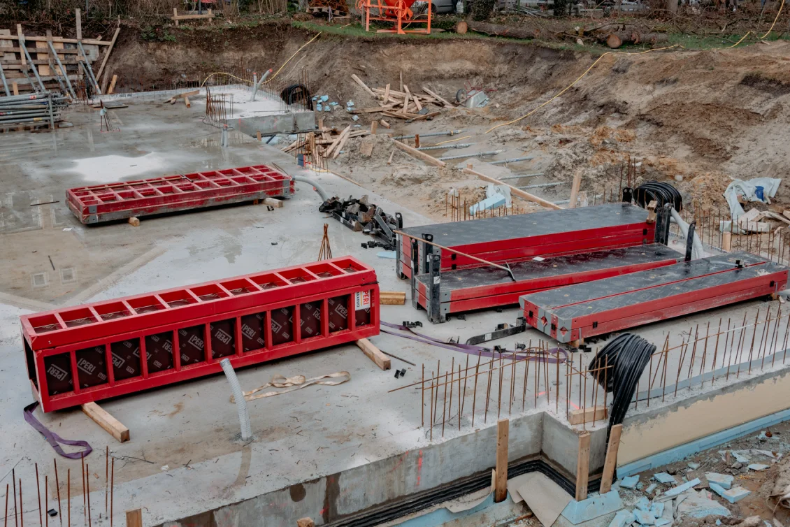 Sobald das Einmessen abgeschlossen ist, erfolgen alle erforderlichen Vorkehrungen zur Errichtung der Wände der Tiefgarage sowie des Untergeschosses des Wohngebäudes. Hierfür werden Bewehrungsstahl, Schalungselemente, Maschinen und Werkzeuge angeliefert.