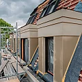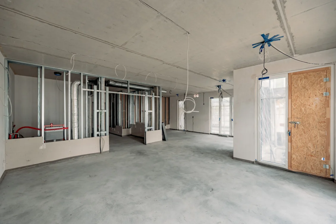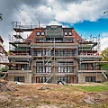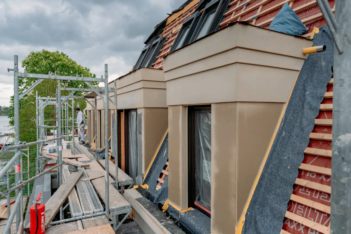 Der Fortschritt der Fassadenarbeiten lässt sich gut an den hellen Putzflächen erkennen, welche die dunklen Dämmflächen bekleiden. Innerhalb des Gebäudes wurde ein weiteres Geschoss mit Estrich versehen.