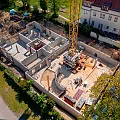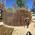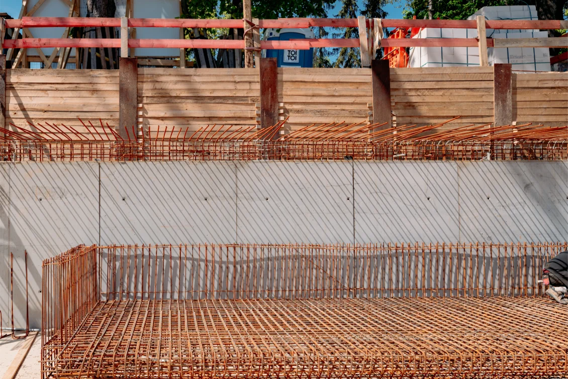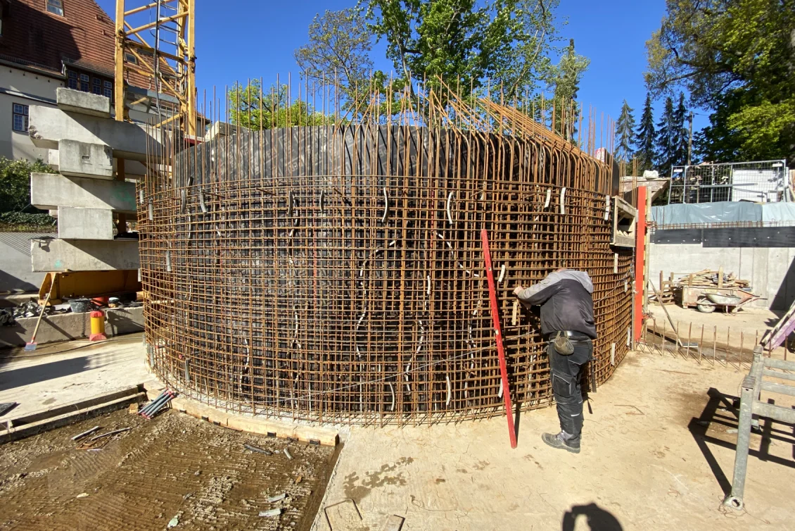 Der Rohbau der Untergeschosswände ist nahezu abgeschlossen. Aussparungen in den Wänden und Decken ermöglichen die zukünftige Leitungsführung. Für die Bodenplatten der terrassenähnlichen Lichthöfe steht die geknüpfte Bewehrung schon bereit, um später mittels Kran auf Position gebracht zu werden. Parallel dazu wird auch die Rampenwand betoniert.