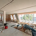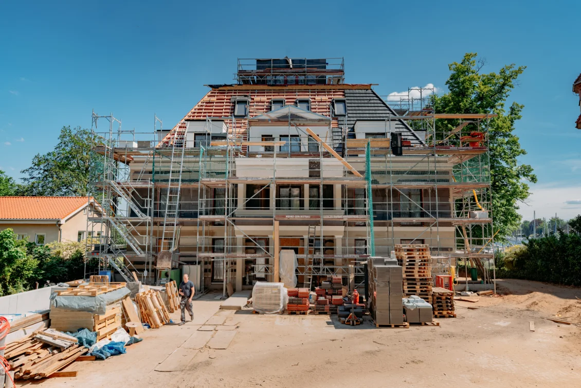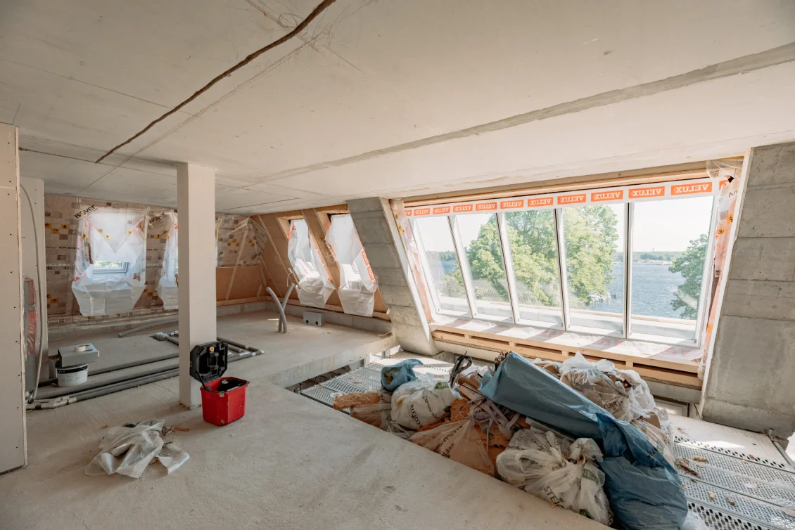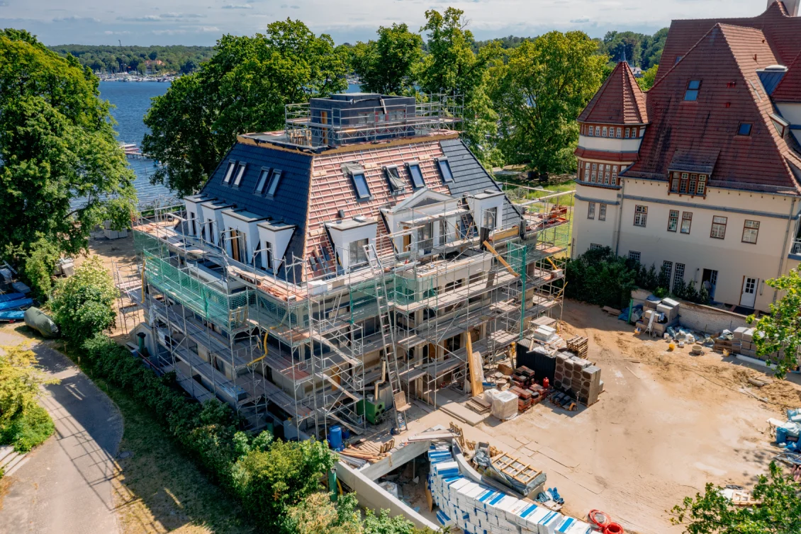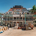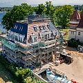 Die Arbeiten am Dach und der Fassaden werden fortgeführt. Die Fassaden werden armiert und mit den Zierelementen, wie Gesimsen und Kapitellen bekleidet. Im Gebäude werden die Dachschrägen mit nachhaltiger Holzwolle ausgedämmt, welche auch einen guten sommerlichen Wärmeschutz bietet.