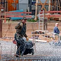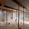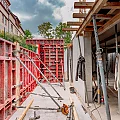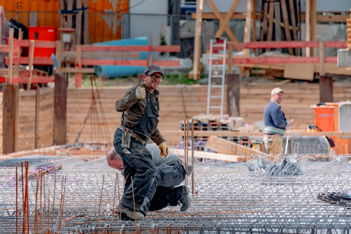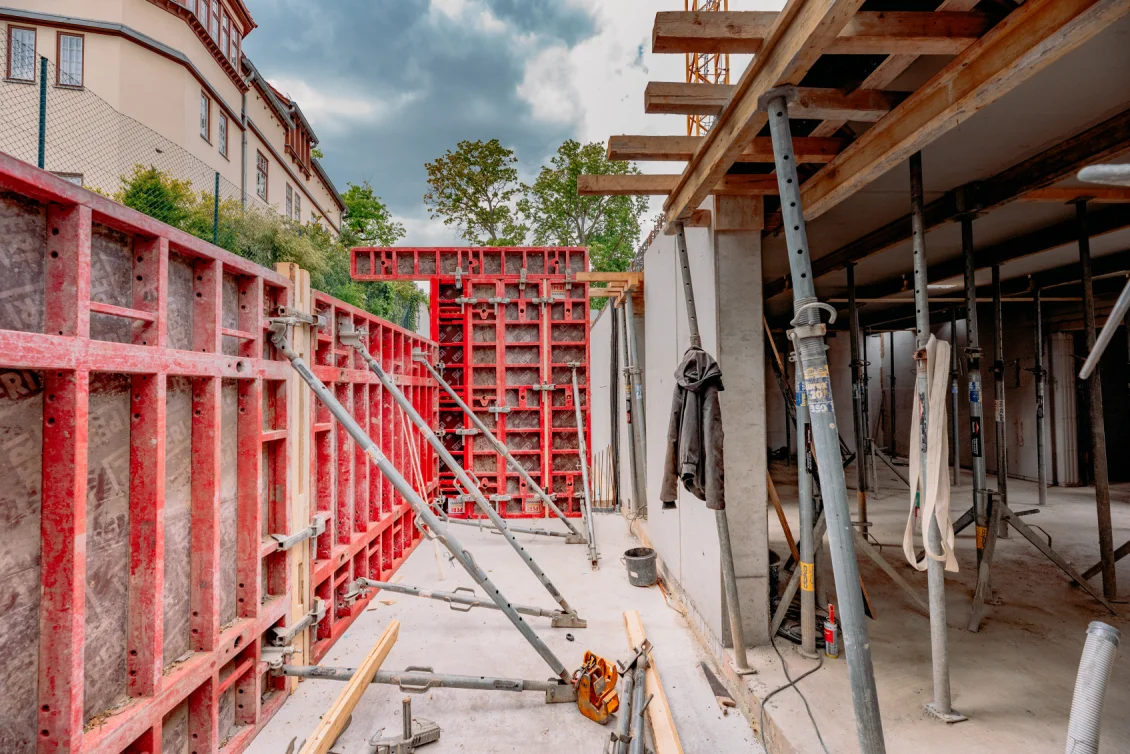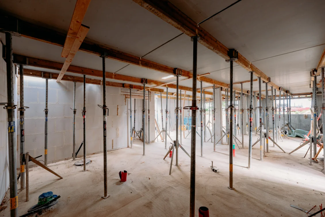 Die Vorbereitungen für die Decke des Untergeschosses laufen in vollem Gange. Die Bewehrungseisen werden gemäß den vom Statiker erstellten Plänen verlegt. Die einzelnen Elemente der Filigrandecke werden durch eine temporäre Konstruktion aus Drehsteifen und Holzträgern, sogenannten “Jochen” getragen.