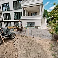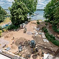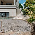 Im Gartenbereich haben die Arbeiten zur Vorbereitung der befestigten Außenflächen begonnen. Vor der Natursteintreppe, die vom Garten zur erhöhten Terrasse führt, wurde bereits eine Kiesschicht eingebracht – als Unterbau für die kommenden Belagsarbeiten. Erste Markierungen deuten auf den geplanten Verlauf von Einfassungen und weiteren Gestaltungselementen hin.