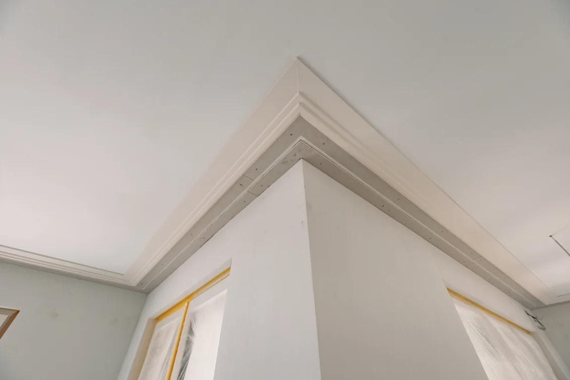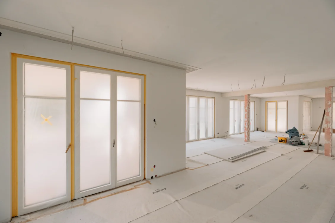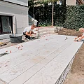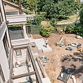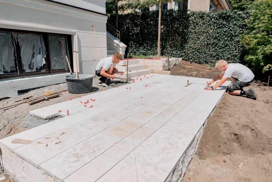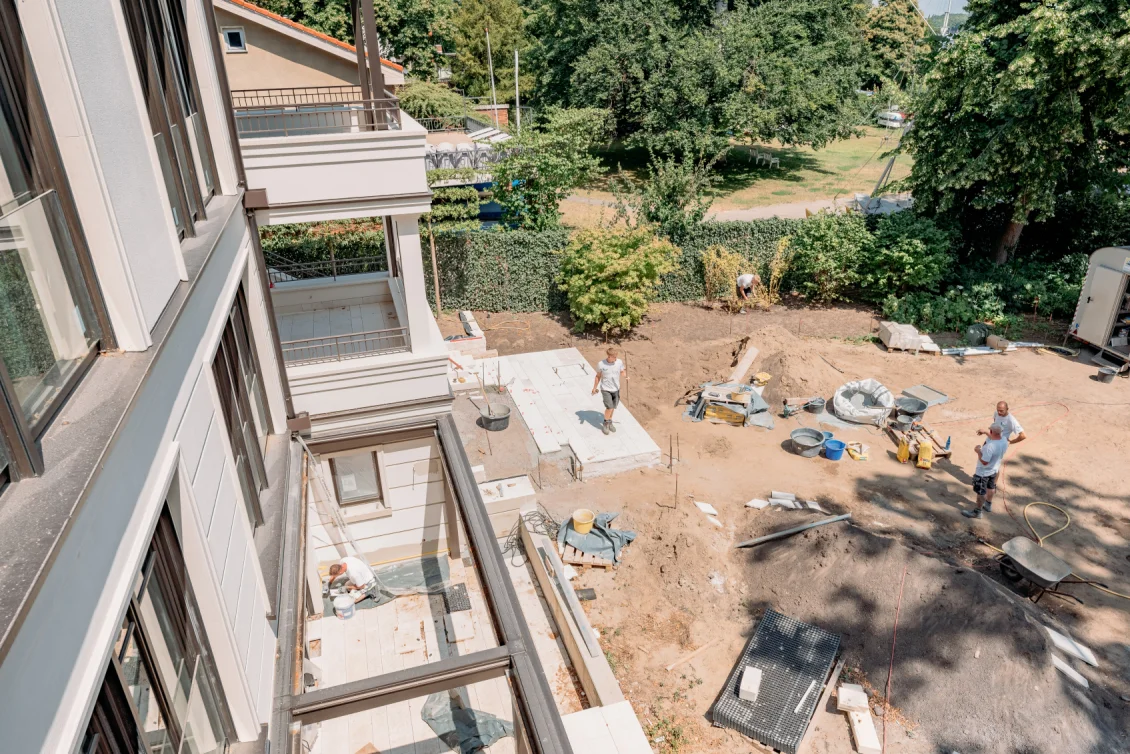 Im Innenbereich wurden die Stuckarbeiten abgeschlossen: Entlang der Deckenränder wurden Zierprofile montiert, die künftig den Übergang zwischen Wand und Decke elegant akzentuieren. Auch im Gartenbereich geht es voran: Erste Plattenbeläge aus Naturstein in gebundener Verlegeart werden sorgfältig verlegt, rote Abstandshalter sichern gleichmäßige Fugen. Die Arbeiten erfolgen in direktem Anschluss an das Gebäude und markieren den Start der befestigten Außenflächen.