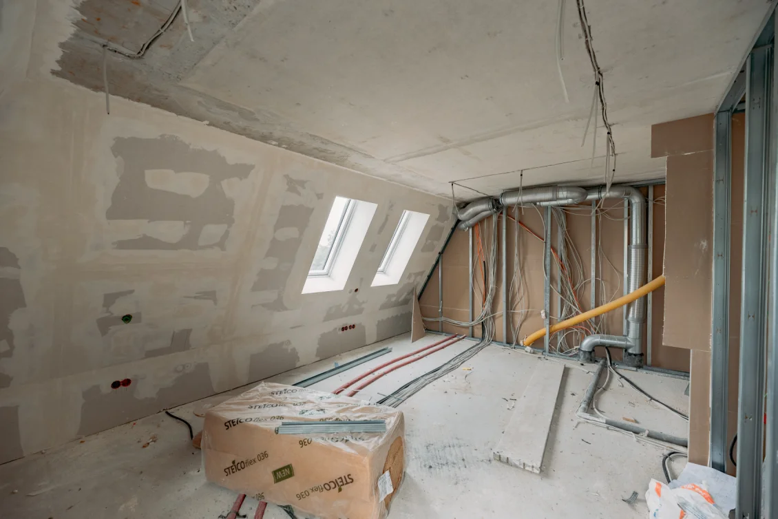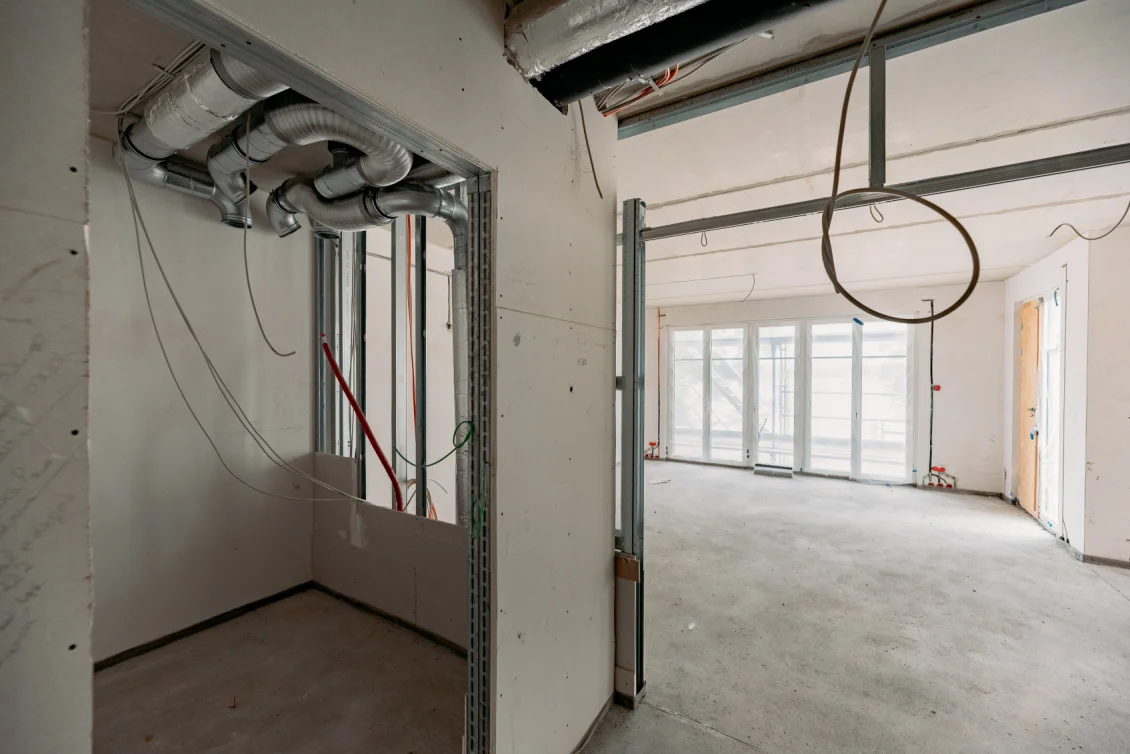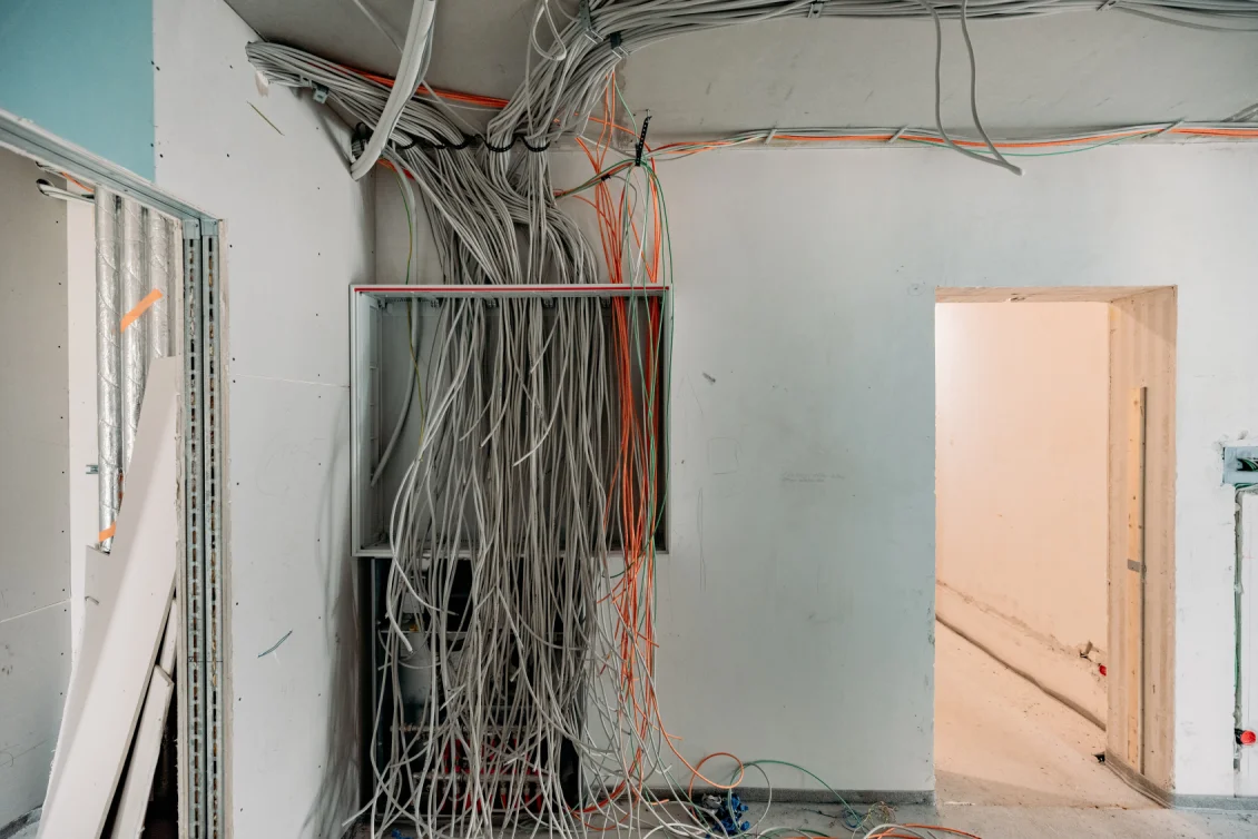 Die Lüftungsleitungen werden zu den Positionen der Klimageräte geführt, die dann nur noch angeschlossen werden müssen. Parallel dazu werden die vielen Elektroleitungen in die Verteilerschränke gelegt und für das spätere Aufklemmen feinsäuberlich sortiert.