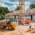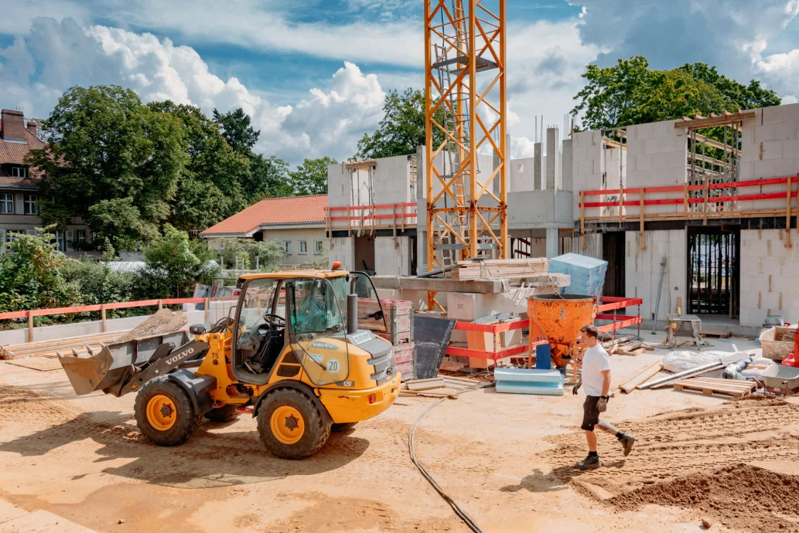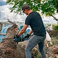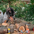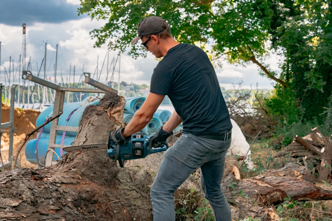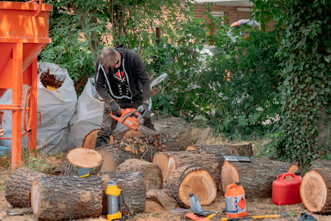 Die Gebäudeseiten sind verfüllt und befahrbar, so dass zwischendurch auch die gelagerten Baumstämme transportgerecht geschnitten und vom Radlader zur Straße gebracht werden. Dort finden sich schnell dankbare Abnehmer.