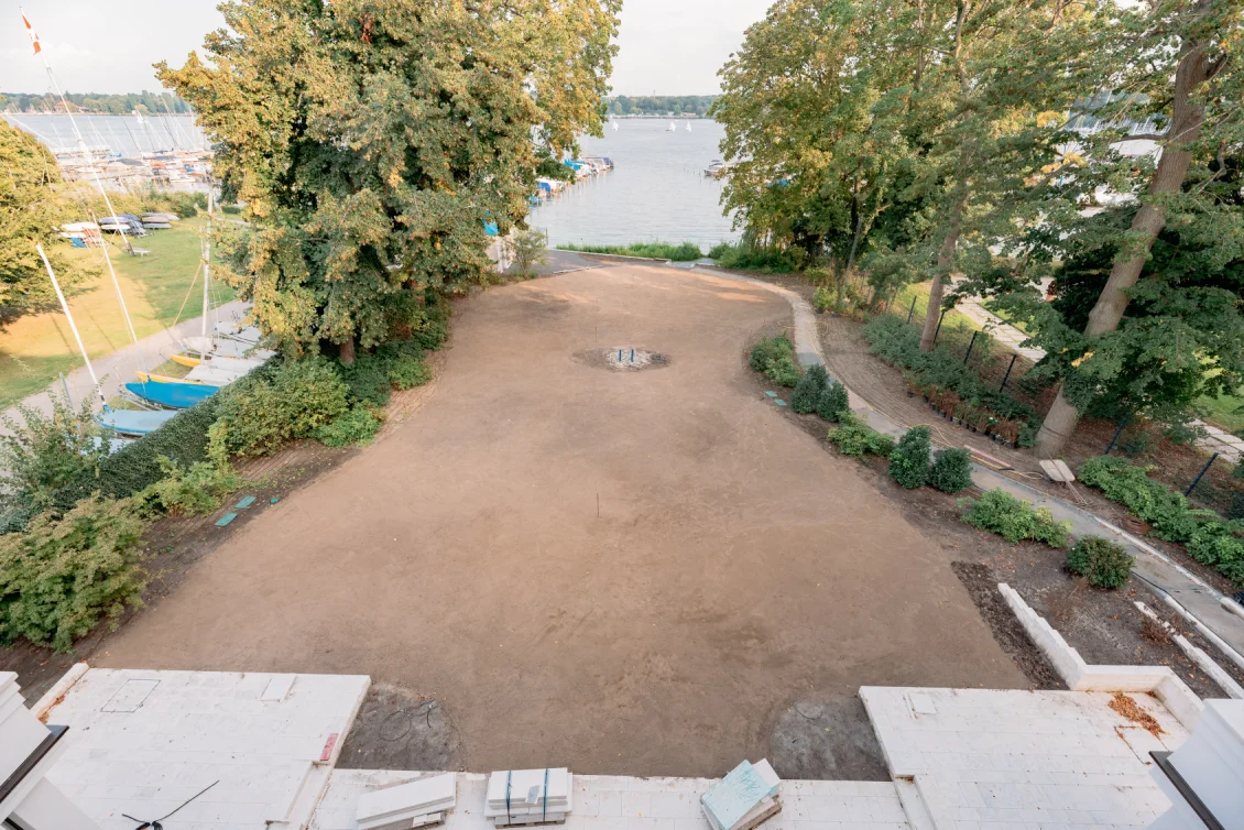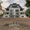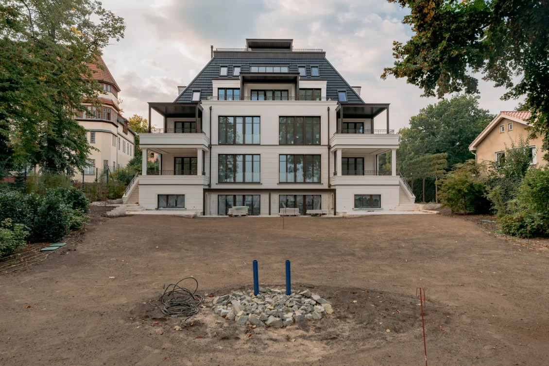 Im Innenbereich werden die Innentüren eingebaut und verleihen den Räumen erstmals ihre endgültige Aufteilung und Wirkung. Gleichzeitig wurden im Außenbereich die Gartenflächen vorbereitet und der Boden sorgfältig ausgerichtet, sodass nun die Grundlage für die Verlegung des Rasens geschaffen ist. Schritt für Schritt nimmt auch das Umfeld des Hauses Gestalt an.