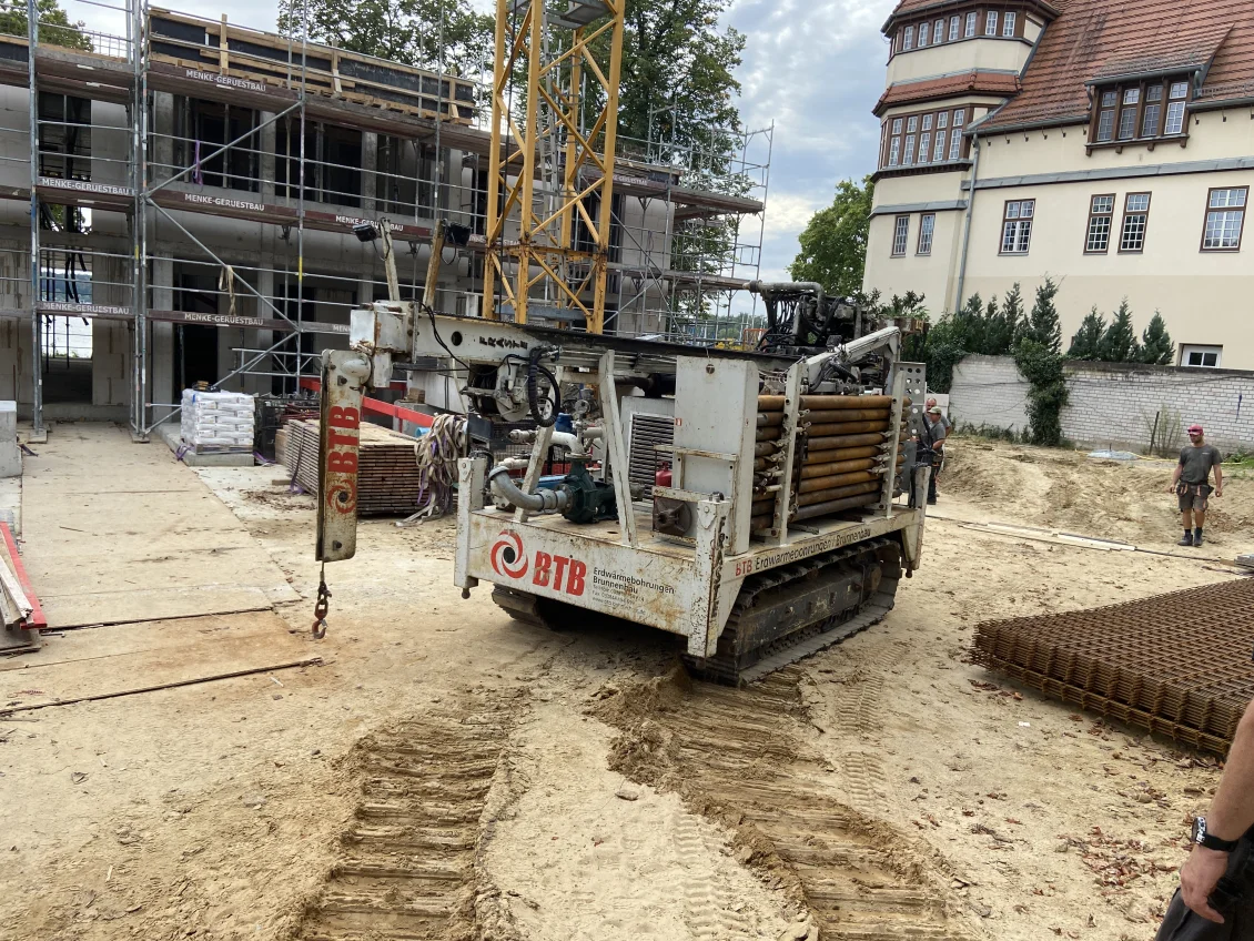 Auf beiden Seiten der Tiefgaragenrampe wird ein Schrammbord eingeschalt. Zusammen mit der Rampenheizung bleiben die Fahrzeuge später sicher auf Kurs. Ein Wald an Drehsteifen in der Tiefgarage gewährleistet die Überfahrt von schwerem Gerät, z.B. das Bohrfahrzeug für die Erdwärmeanlagen.