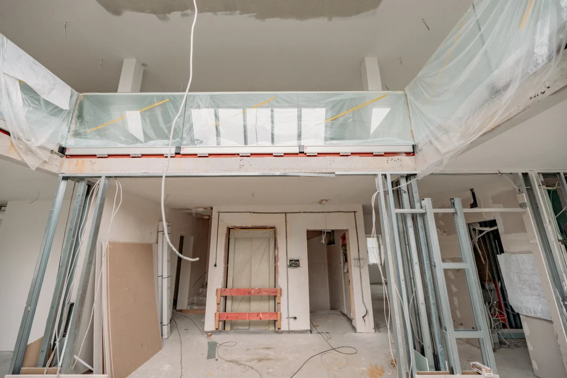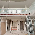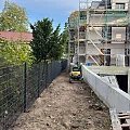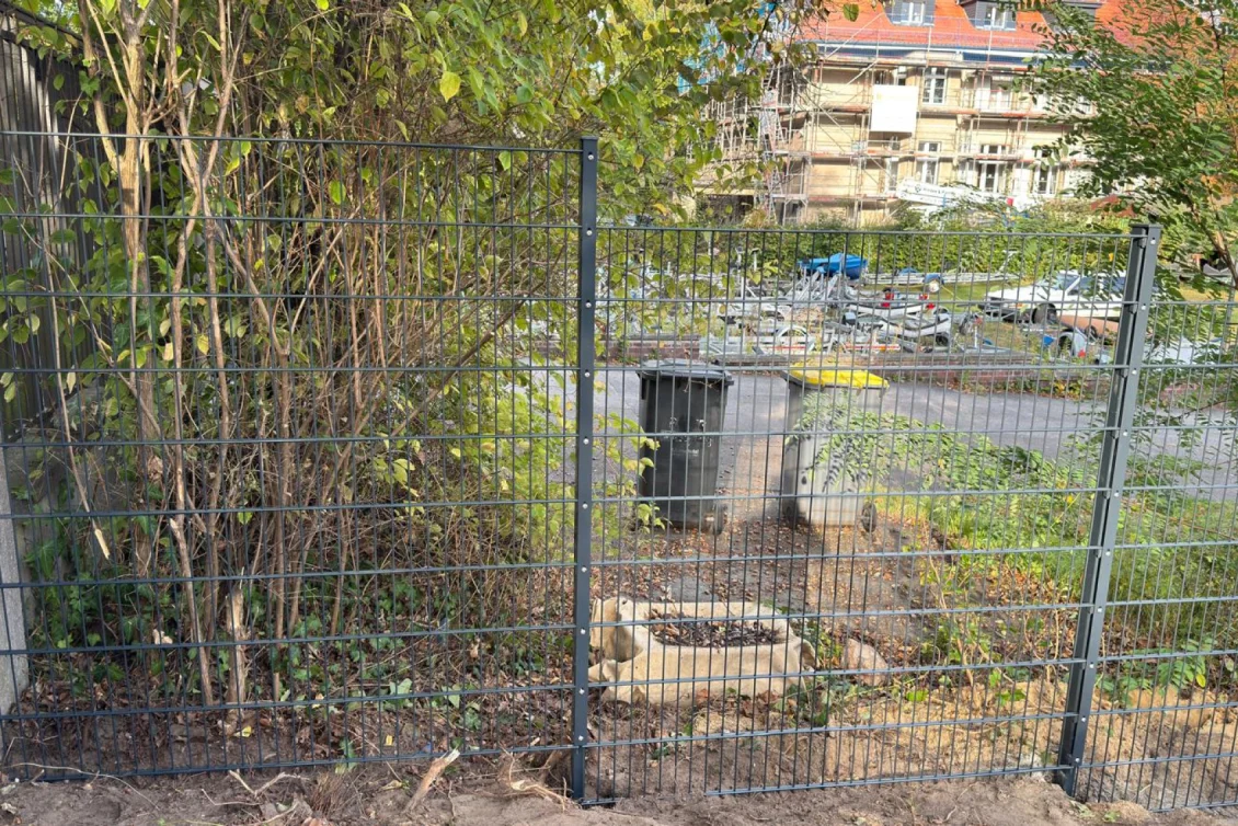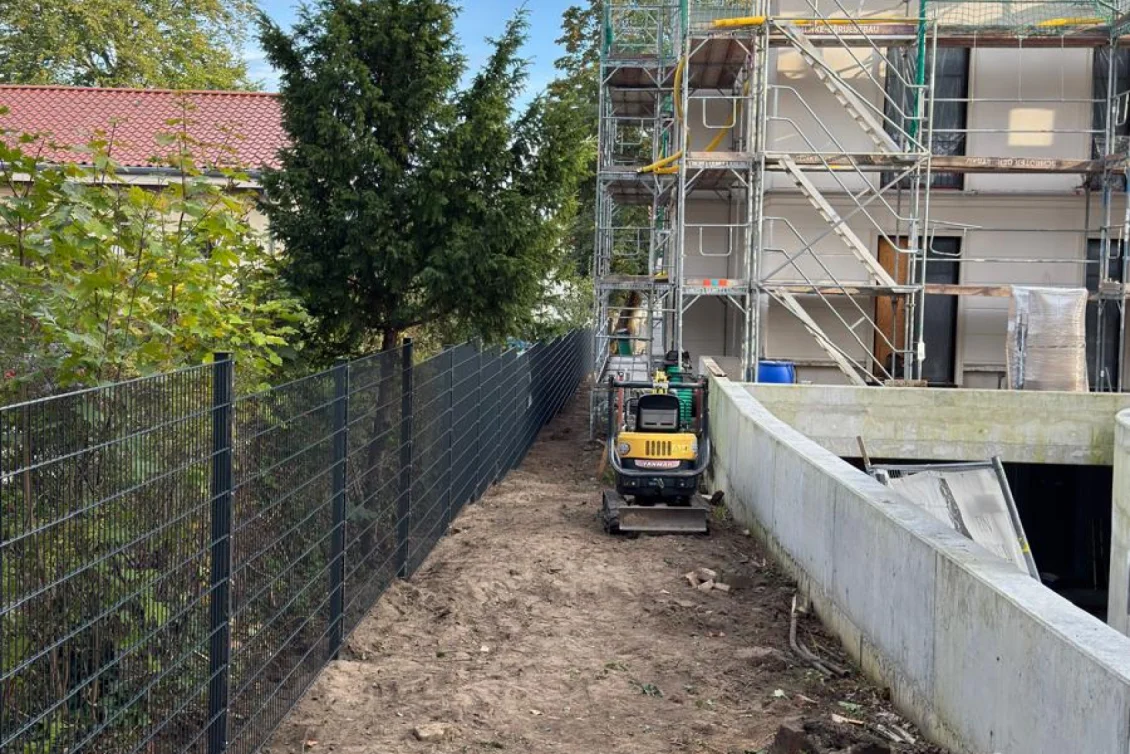 Am lichtdurchfluteten Luftraum von Galerie- zu Dachgeschoss wird die Glasabsturzsicherung in die dafür vorgesehene Konstruktion eingehängt. Im Außenbereich wird parallel die alte Zaunanlage weiter demontiert und, nachdem die Grundstücksgrenze genau abgesteckt wurde, ein neuer Zaun aufgestellt.