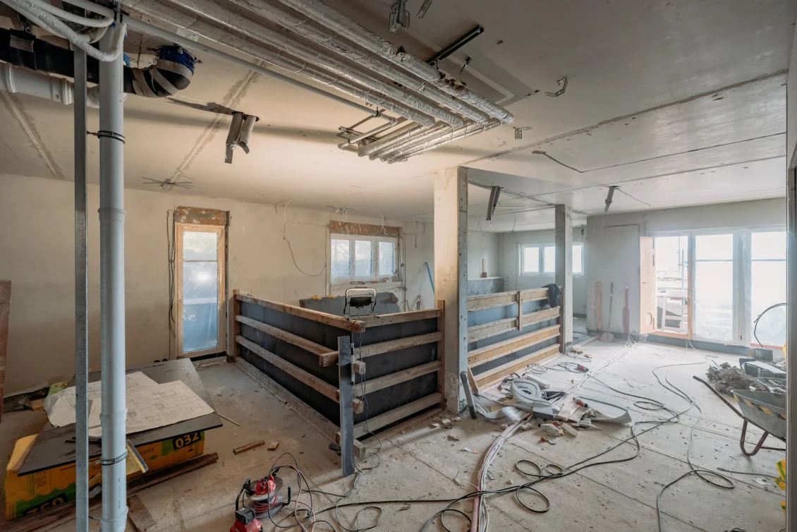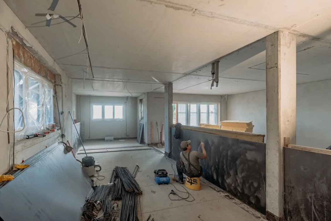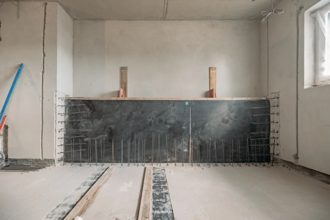 Im Untergeschoss soll ein Privatpool entstehen, dafür wird im ersten Schritt die Schalung der Wände vorbereitet. Die Bewehrungseisen für die Stahlbetonwände des Pools müssen in die Bestandsaußenwände und Bodenplatte eingebracht werden.