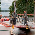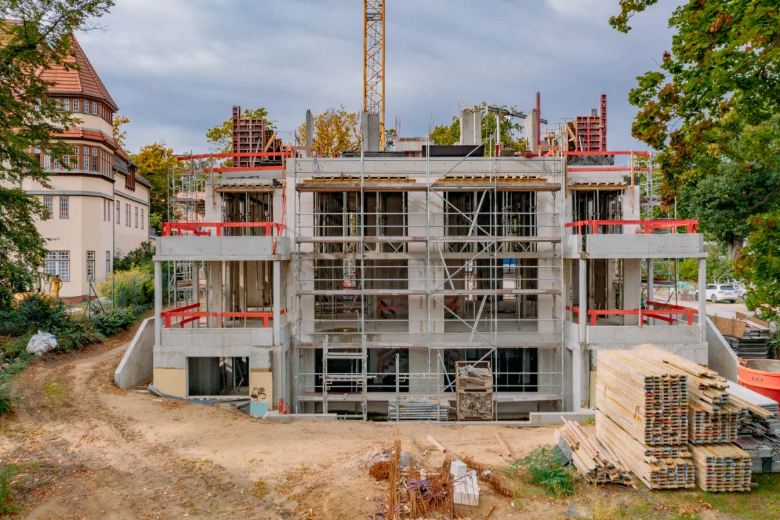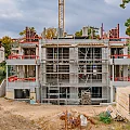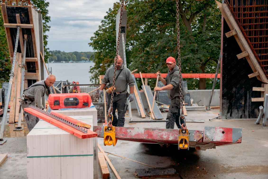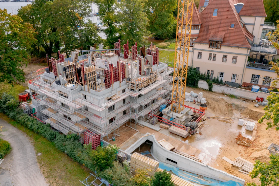 Das Arbeiten an den Wänden im Dachgeschoss sind weitestgehend abgeschlossen. Vom Wasser aus gesehen, lassen sich die großen Fensteröffnungen erkennen, die später für beste Aussichten aus den Wohnungen sorgen werden.