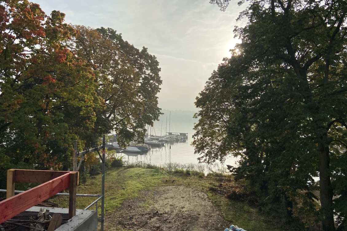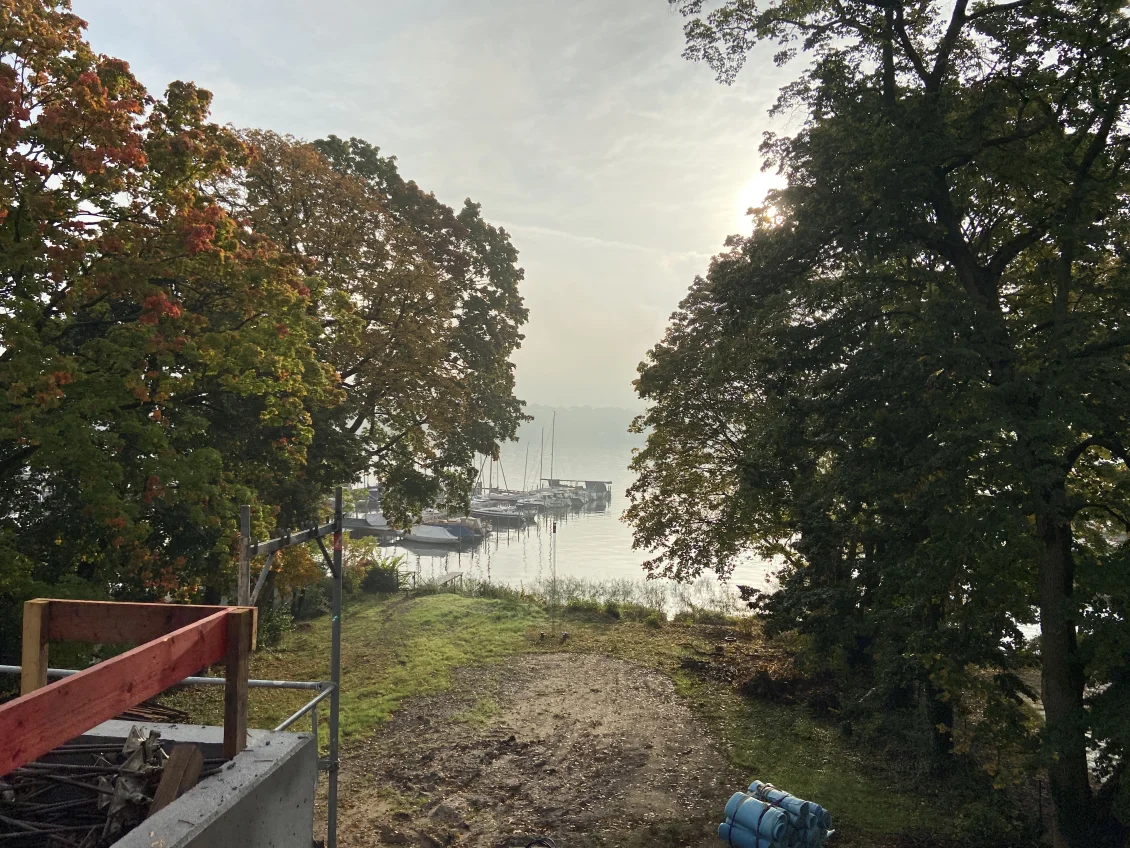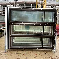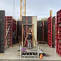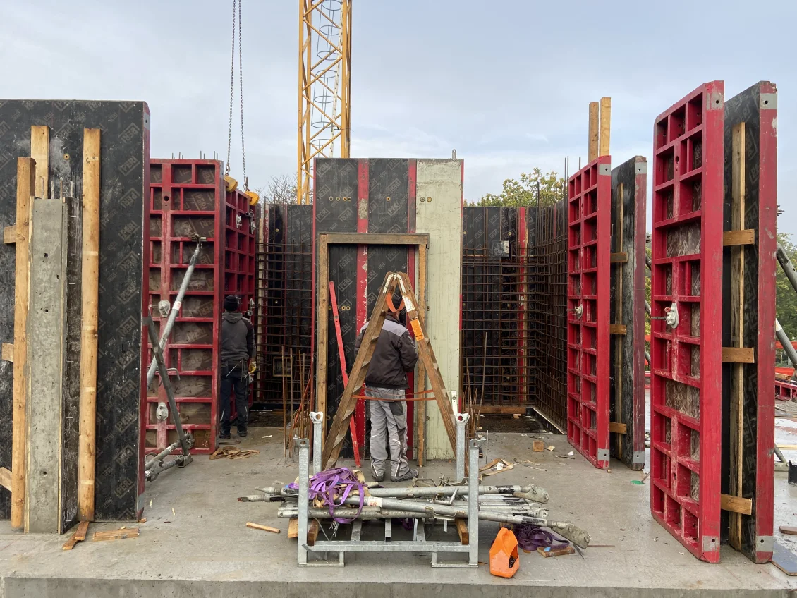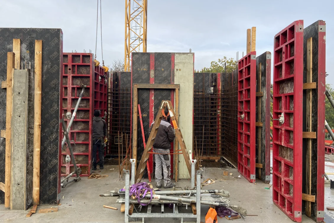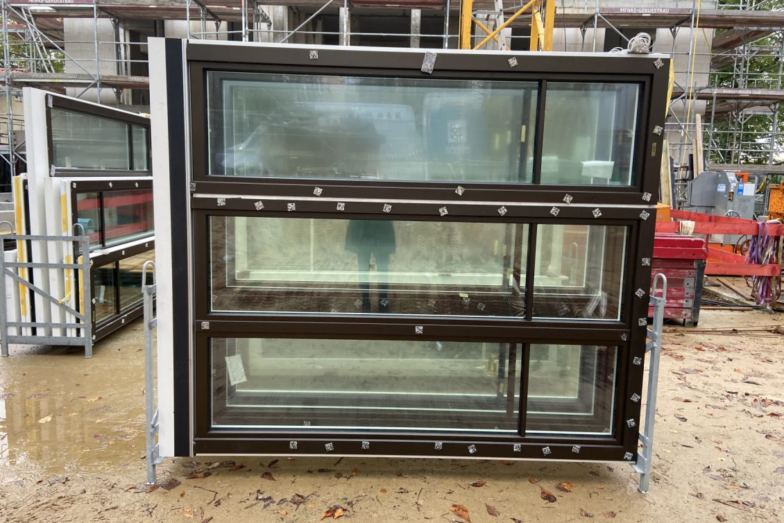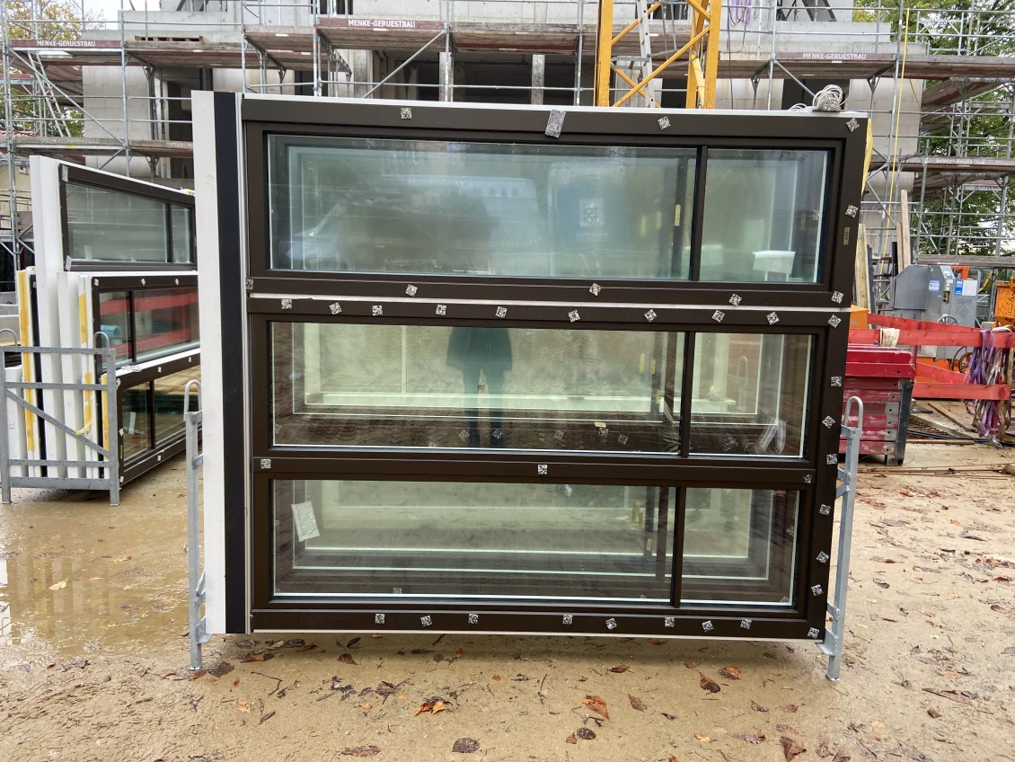 Im Galeriegeschoss sind die Arbeiten an der Bewehrung und Schalung der Aufzugswände in vollem Gange. Die ersten Fenster in edlem Bronzeton für das Untergeschoss und das Erdgeschoss sind eingetroffen, sorgfältig zugewiesen und werden nun zum Montageort transportiert.