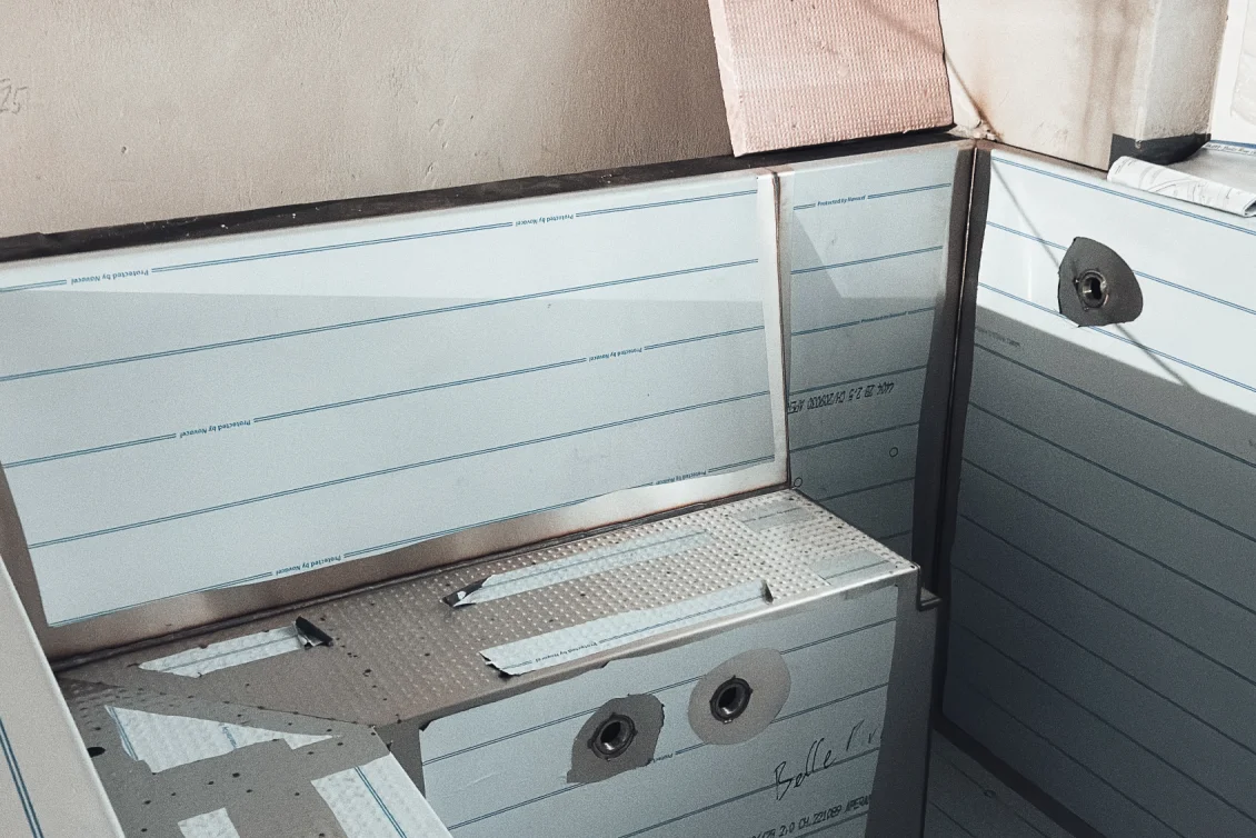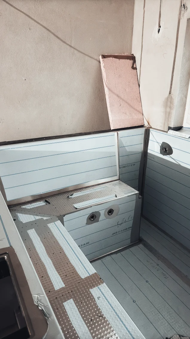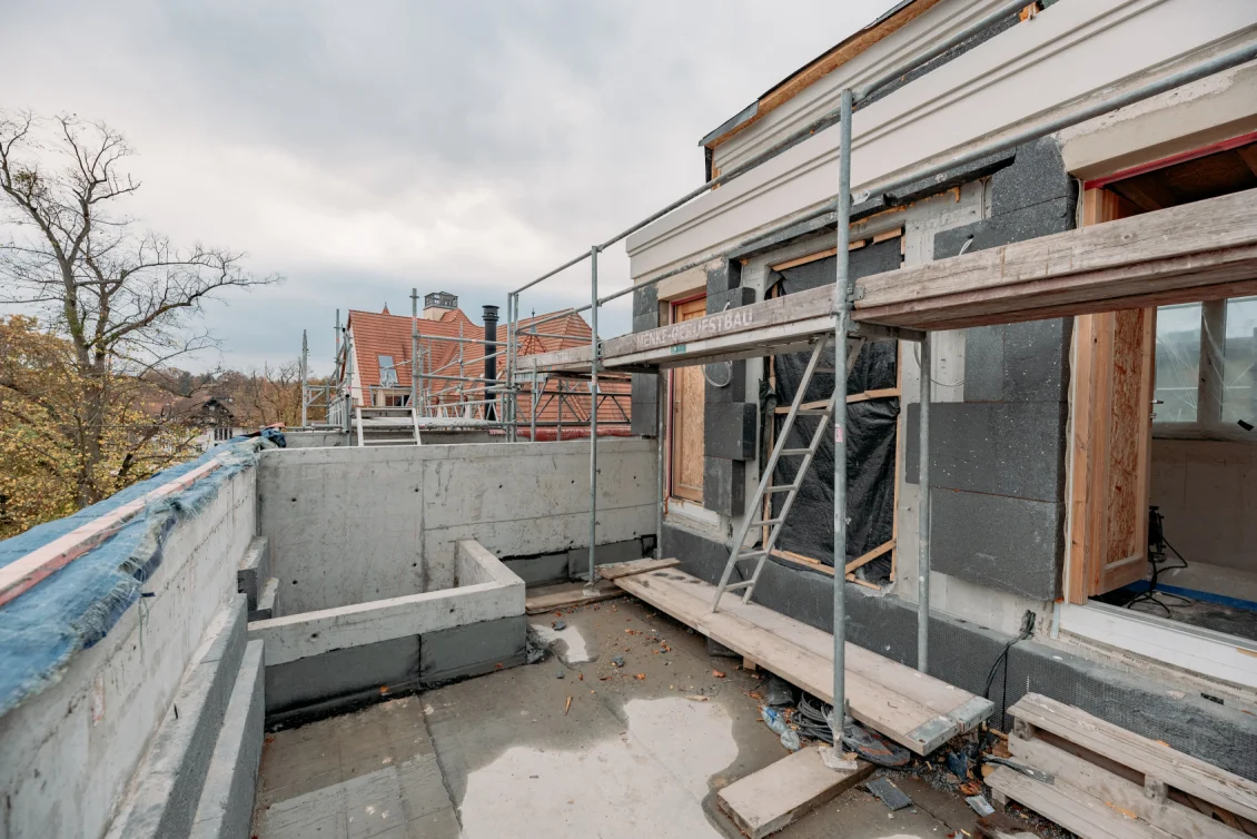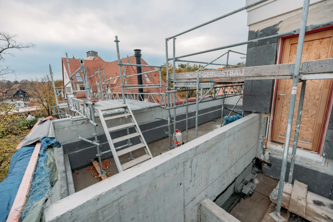 Im Dachgeschoss werden die vorbereitenden Maßnahmen für die Montage der Poolanlage durchgeführt. Währenddessen ist die Montage der Poolanlage im Untergeschoss bereits im vollen Gange ist.
