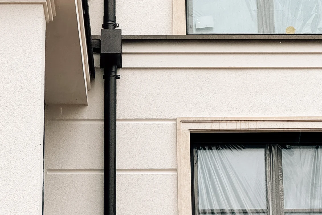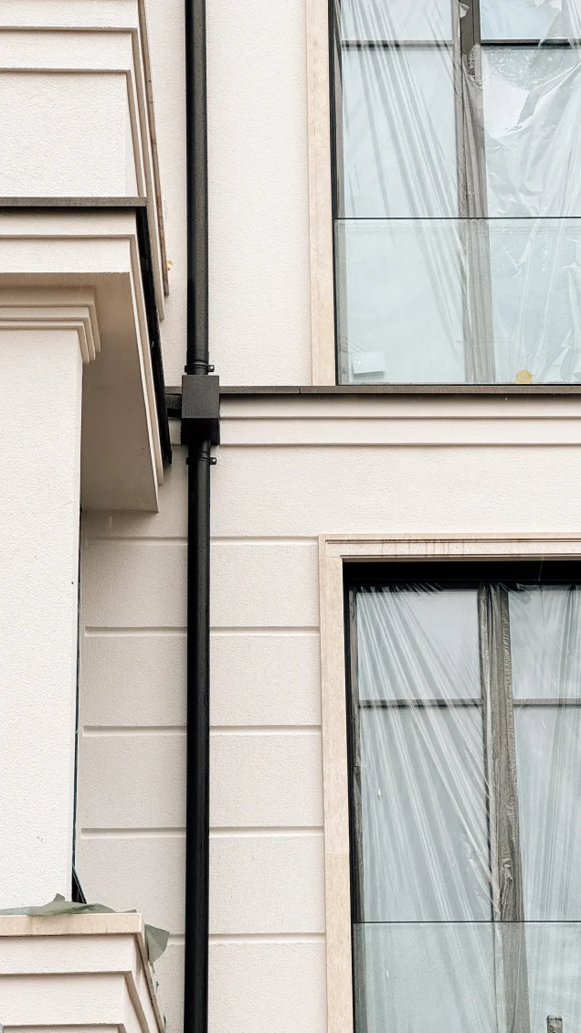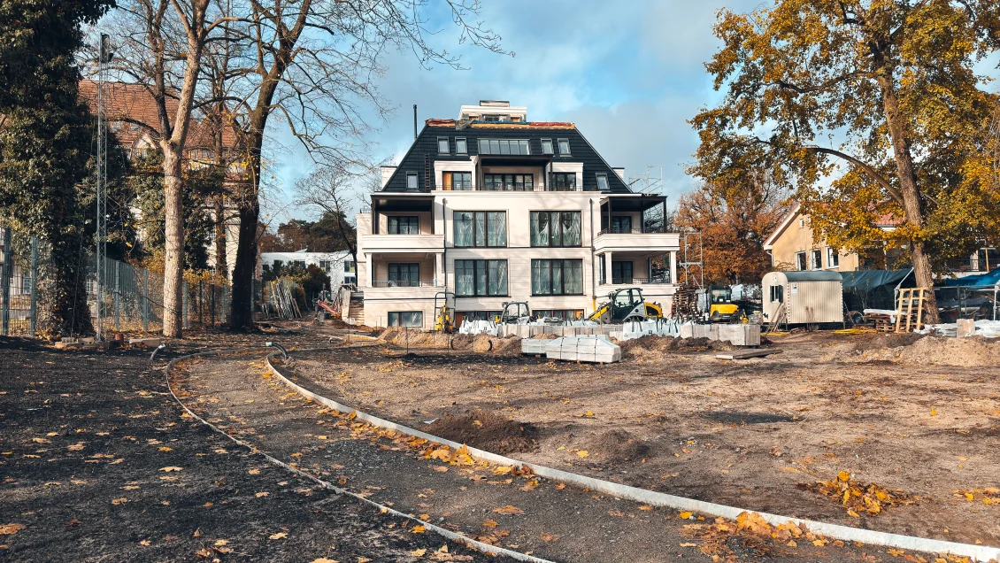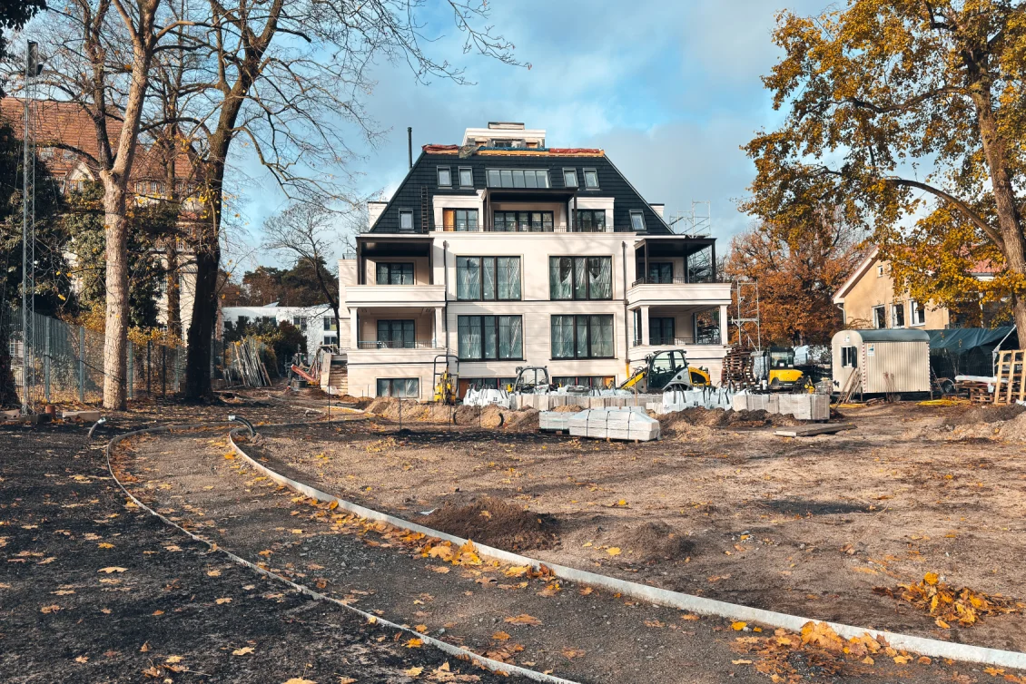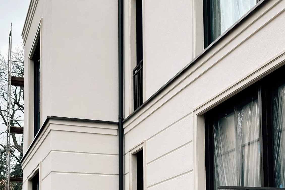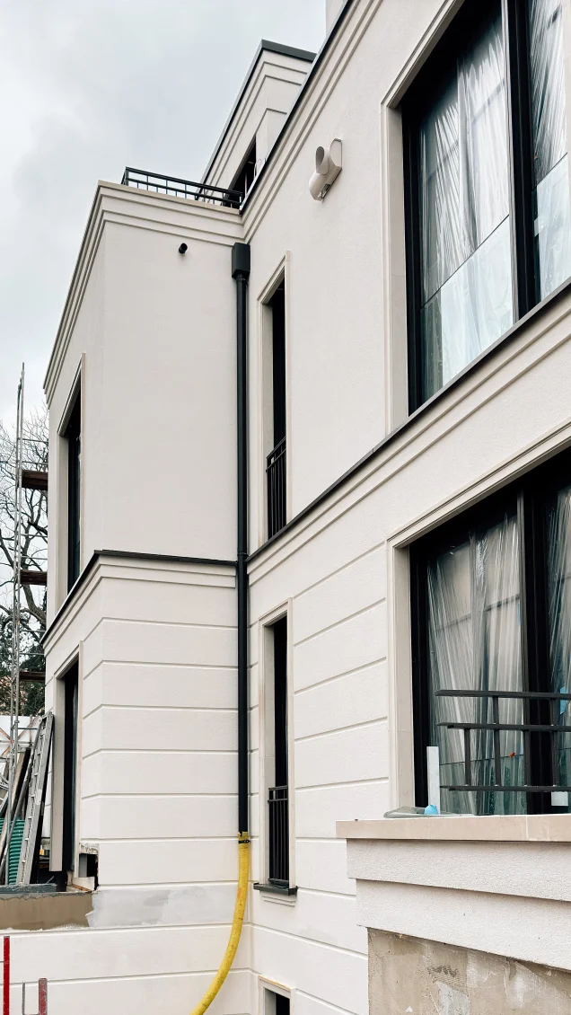 Das Fassadengerüst wurde final zurückgebaut und man sieht das Objekt erstmalig im vollen Glanz. Parallel zu den Abrüstarbeiten steht der Fassadenbauer parat, um die Gerüstankerlöcher in der Fassade zu schließen.