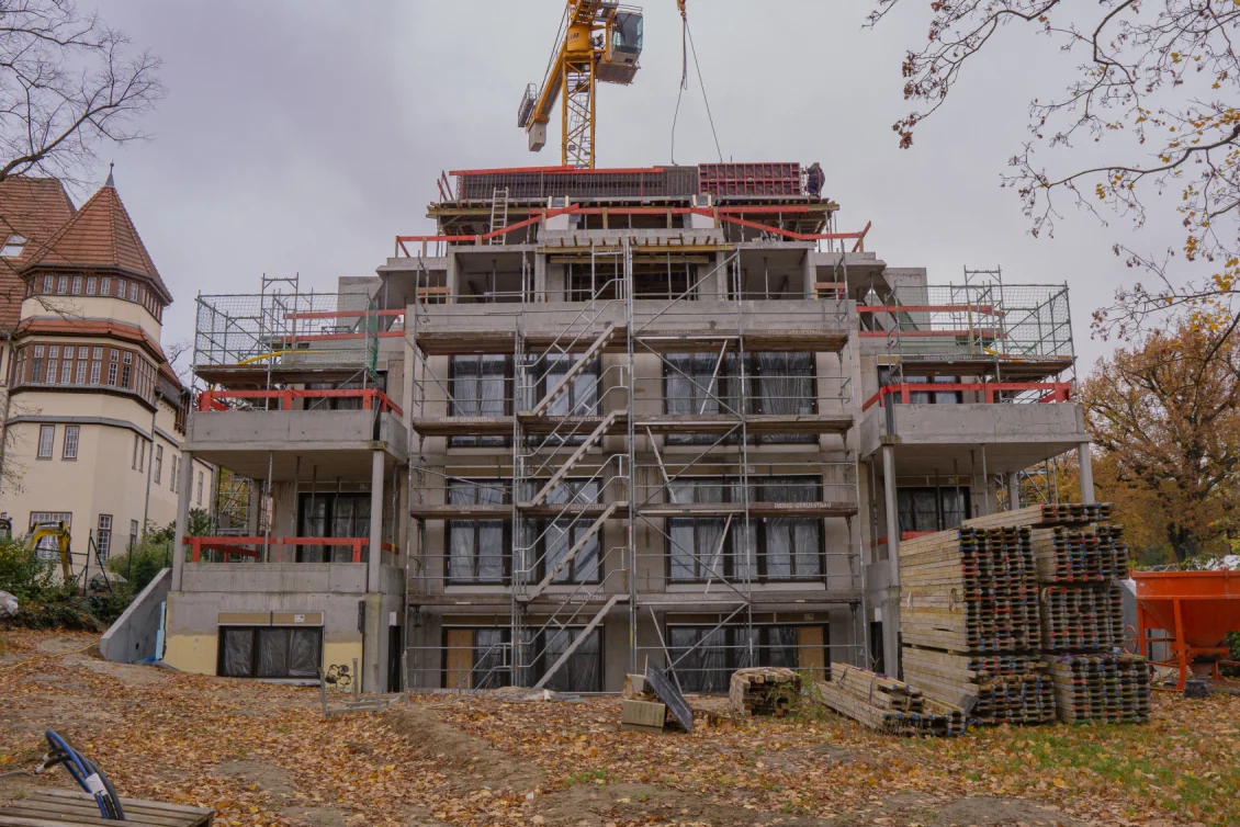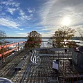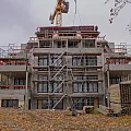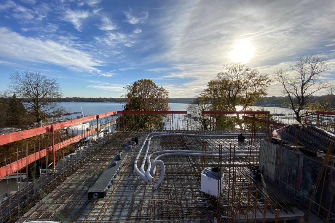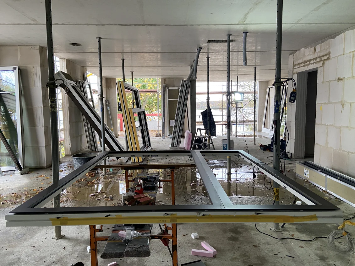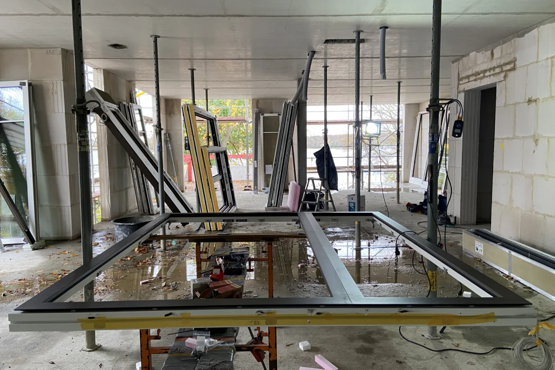 Geschoss für Geschoss werden weiterhin die Fenster eingesetzt. Diese werden in Einzelteilen geliefert und am Montageort zusammengebaut, um dann behutsam in die Rohbauöffnung eingesetzt zu werden.